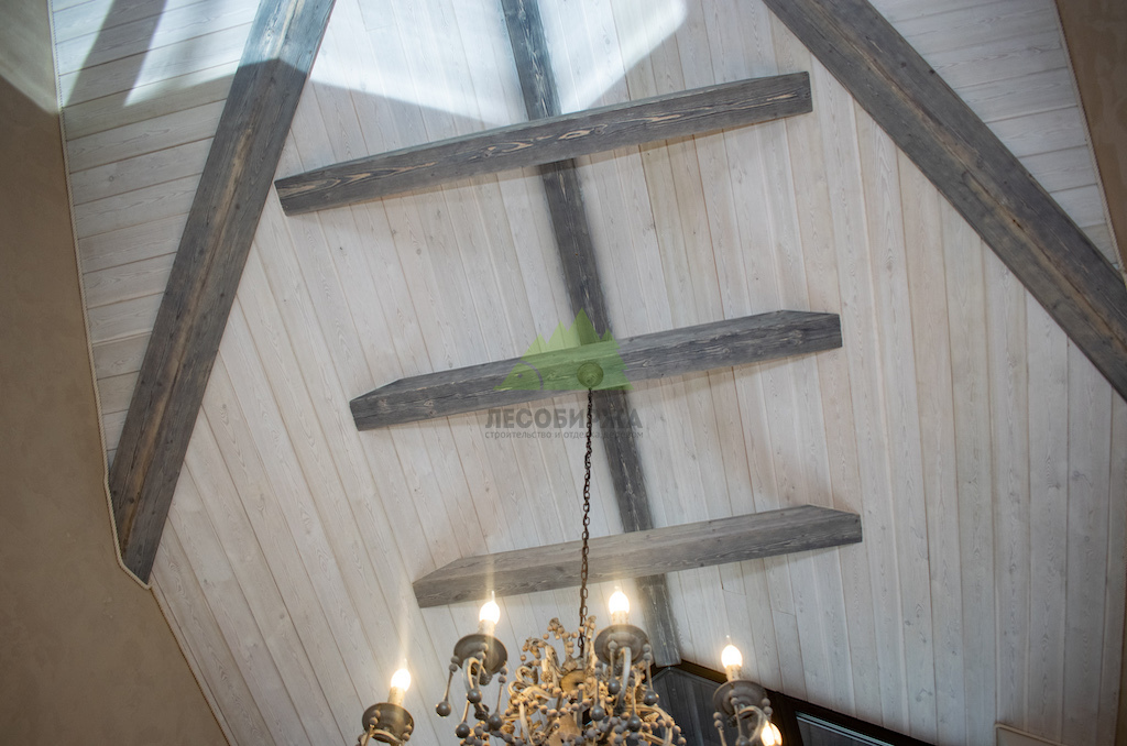 После изготовления в столярном цехе, фальшбалки отправились в наш покрасочный цех. Здесь над ними "колдовали" наши мастера-маляры. Процесс покраски был многоэтапным и осуществлялся по нашей уникальной системе "Зимняя Сказка", разработанной специалистами Лесобиржи-Спб для создания эффекта глубоко состаренного, но при этом изысканного дерева. Суть этой системы заключается в послойном нанесении нескольких оттенков краски с последующей частичной зачисткой и патинированием. В данном проекте были использованы два цвета, которые подчеркнули рельеф брашированной поверхности и придали балкам уникальный "выцветший" вид, словно они веками находились под солнцем юга Франции. Результат превзошел все ожидания: фальшбалки выглядели роскошно, дорого и убедительно "старо", добавляя помещению неповторимый шарм и индивидуальность.