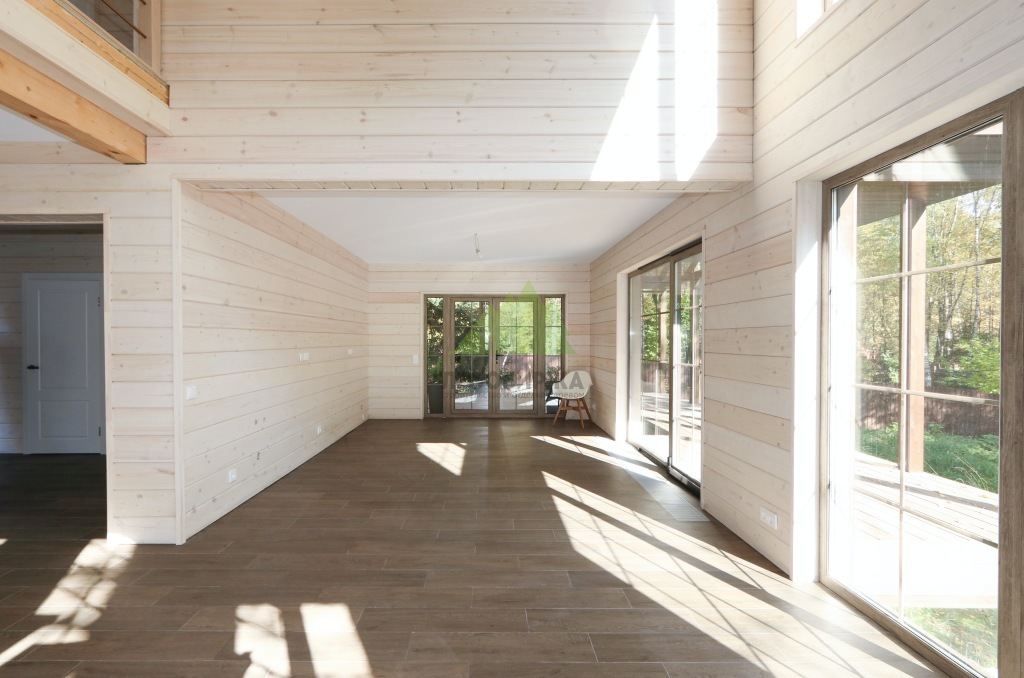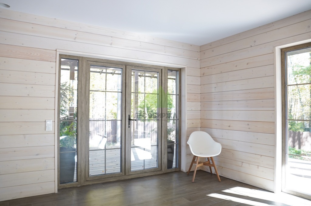 Панели имитации бруса "Карельский профиль" были успешно применены и для внутренней отделки дома, создавая атмосферу уюта и тепла. Для интерьерных работ мы выбрали финишное покрытие воском S&H в элегантном цвете NCSS-0500-N. Этот бледно-бежевый оттенок воска выглядит невероятно естественно и благородно. Он не только придает стенам утонченный вид, но и визуально расширяет пространство, наполняя его светом и легкостью. Воск, в отличие от лаков, сохраняет тактильные ощущения от дерева, позволяя ему "дышать" и поддерживать здоровый микроклимат в помещении.
