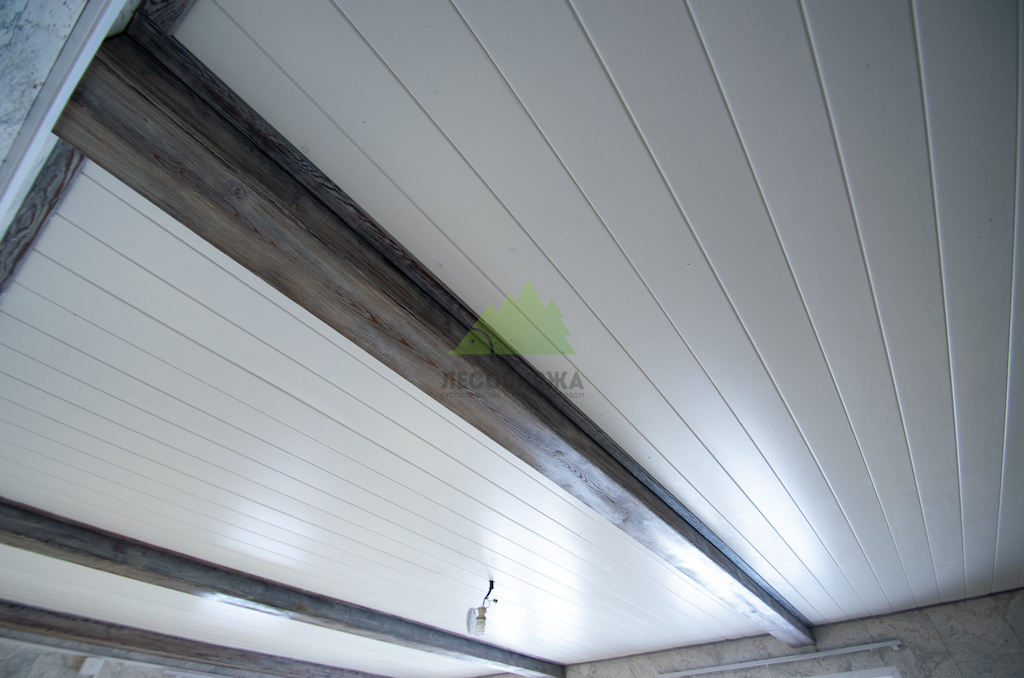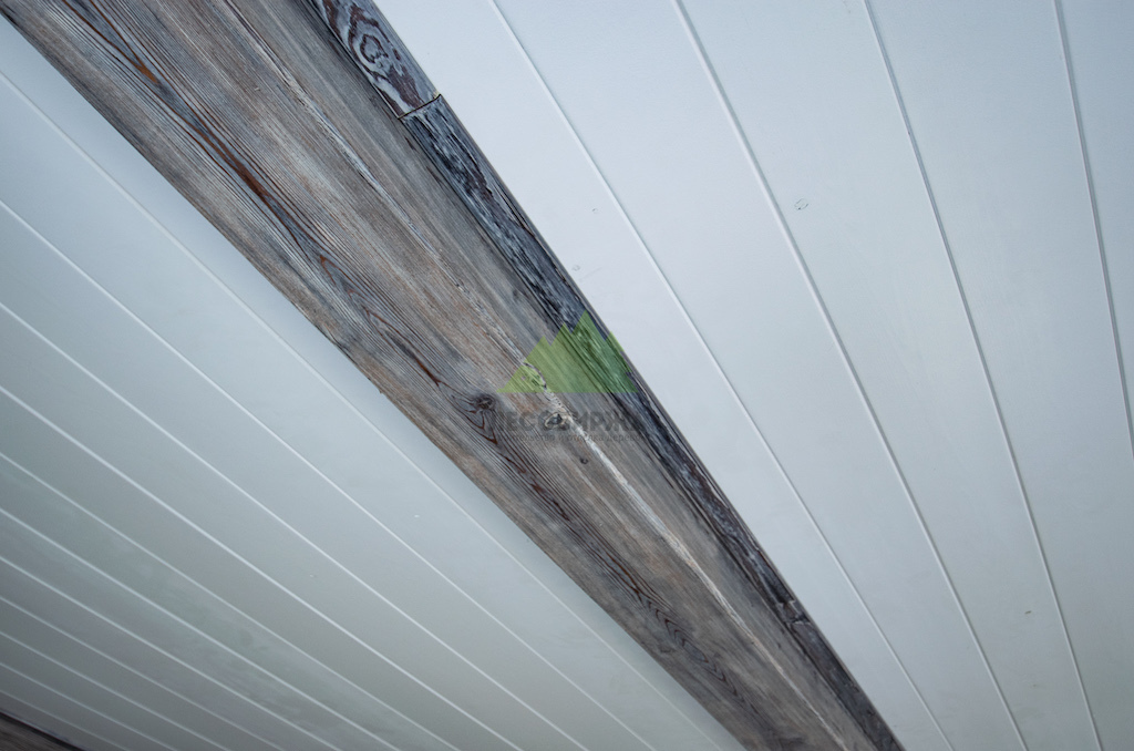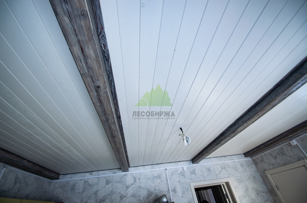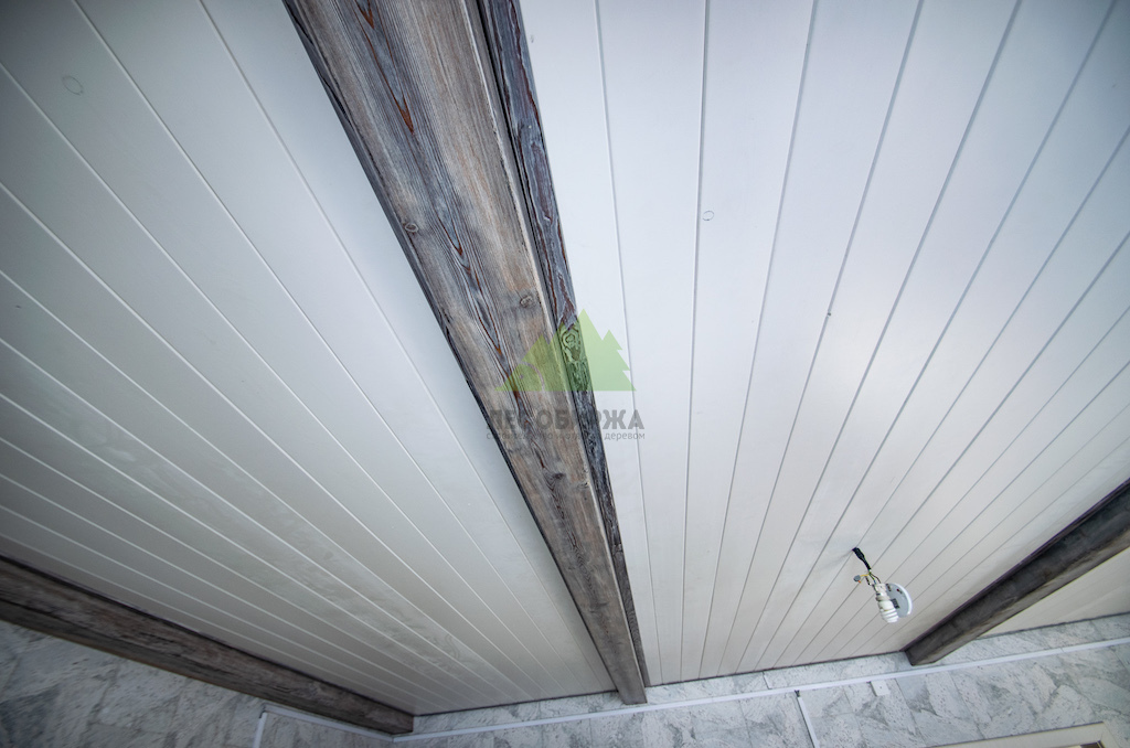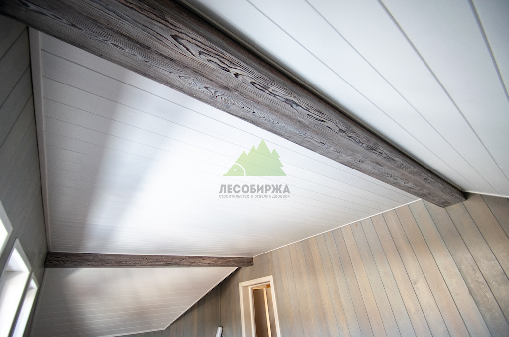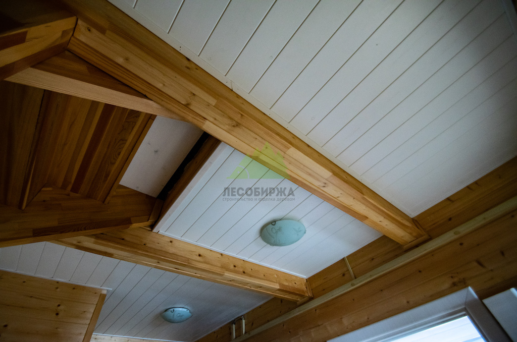 Наши дизайнеры и маляры Лесобиржи-Спб знают, как избежать этих ошибок. Мы не боимся светлых оттенков, ведь они способны создать романтический настрой и значительно расширить пространство. Светлая вагонка на стенах и потолках придаёт помещению недостающий объем, добавляет света и комфорта. Чтобы интерьер не выглядел скучным или однообразным, мы всегда рекомендуем добавлять другие тона и текстуры. В данном проекте, например, мы внесли особые дополнения в виде декоративных фальшбалок из лиственницы.