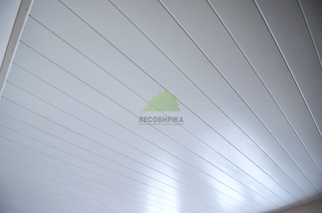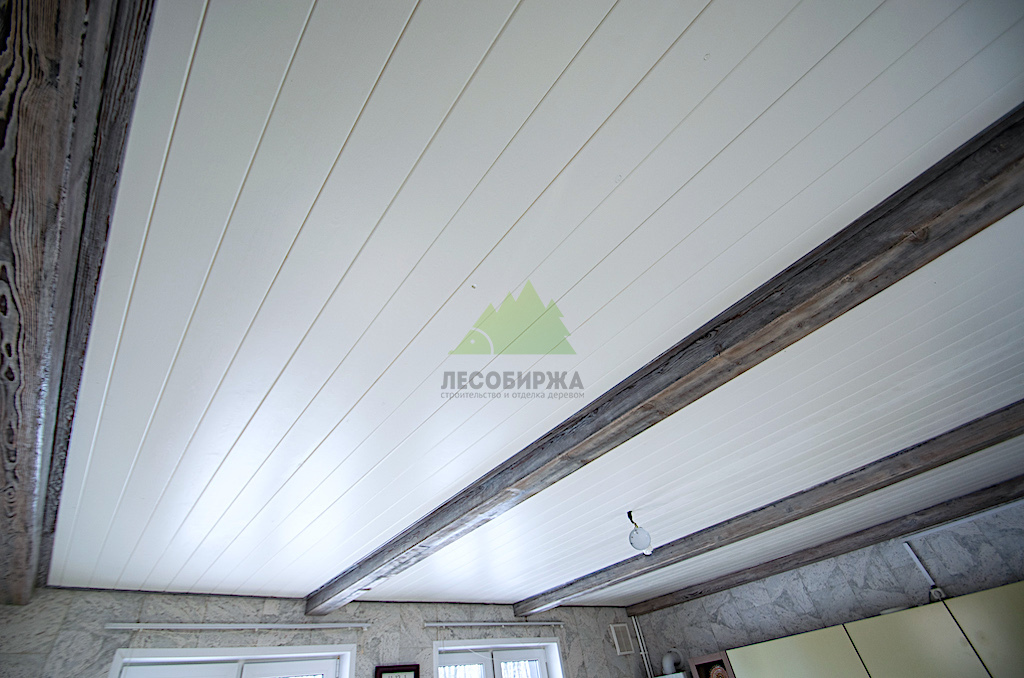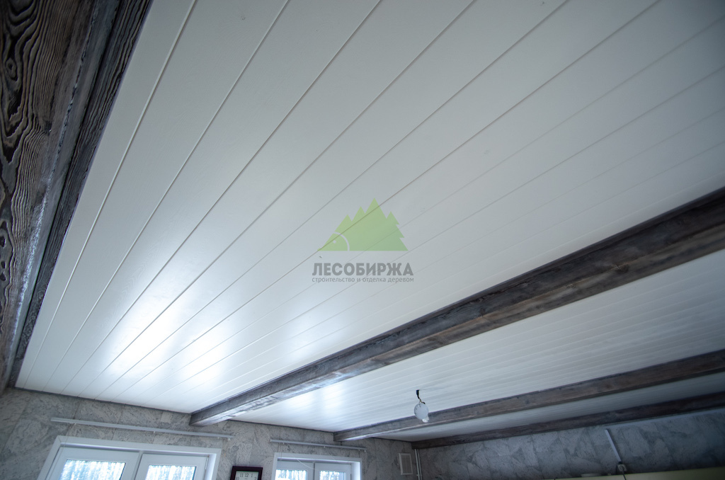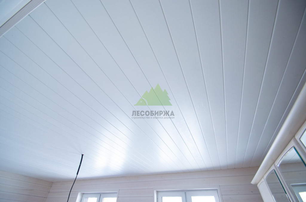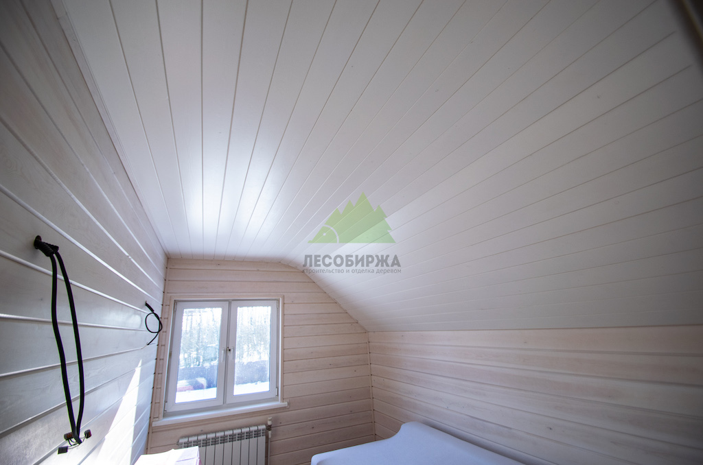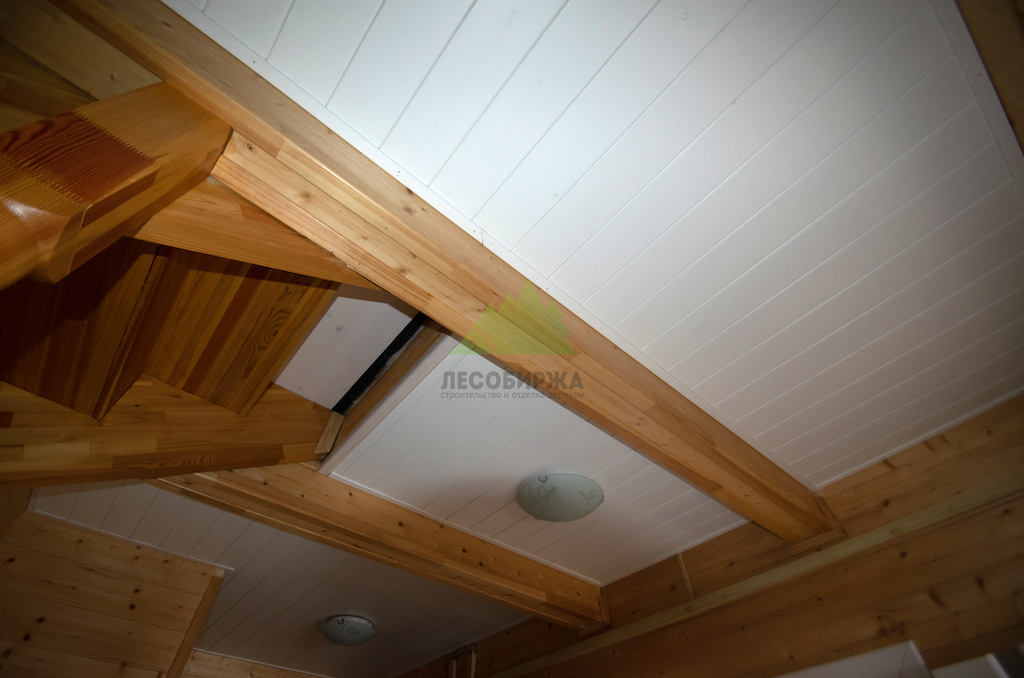 - Вагонка из ангарской сосны в сорте Прима шириной 145 мм для потолка.