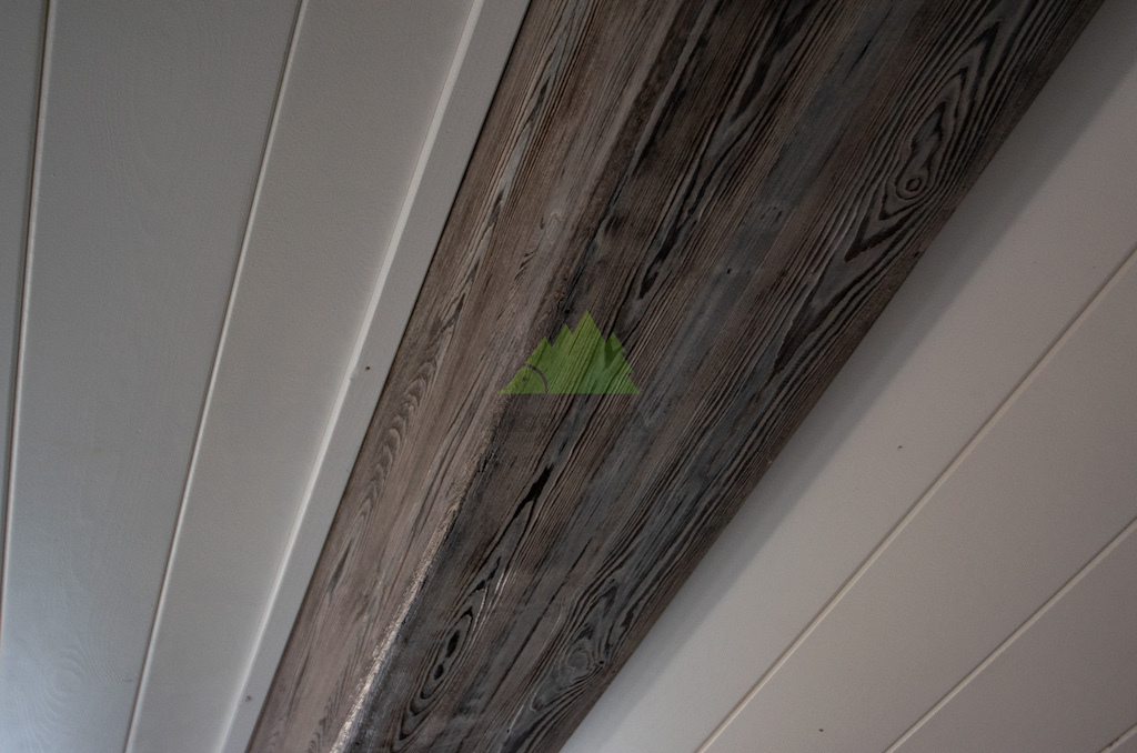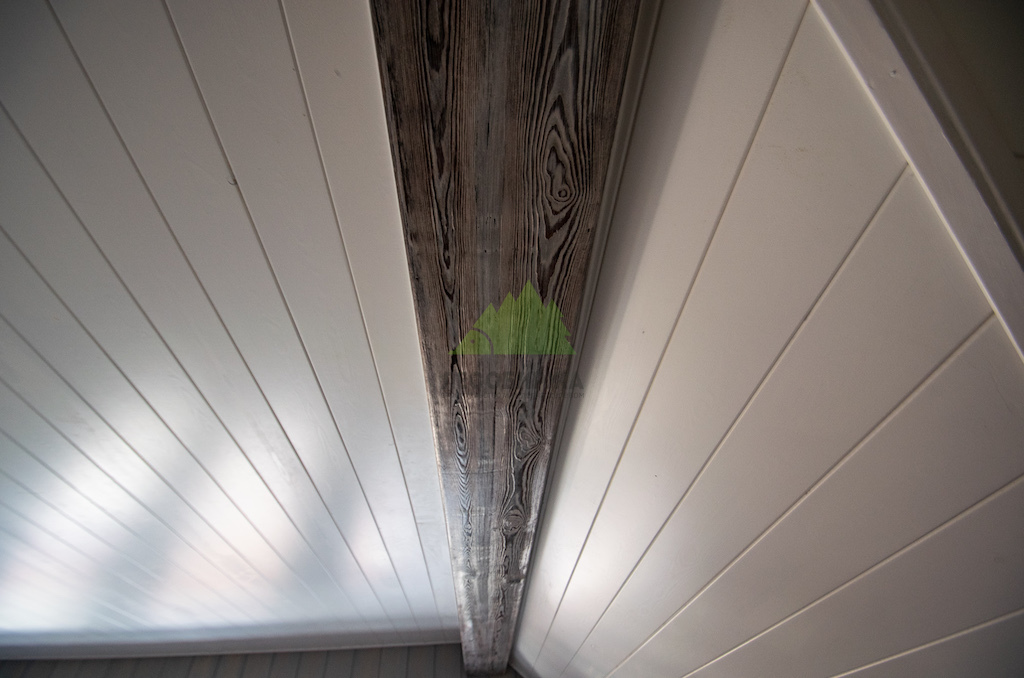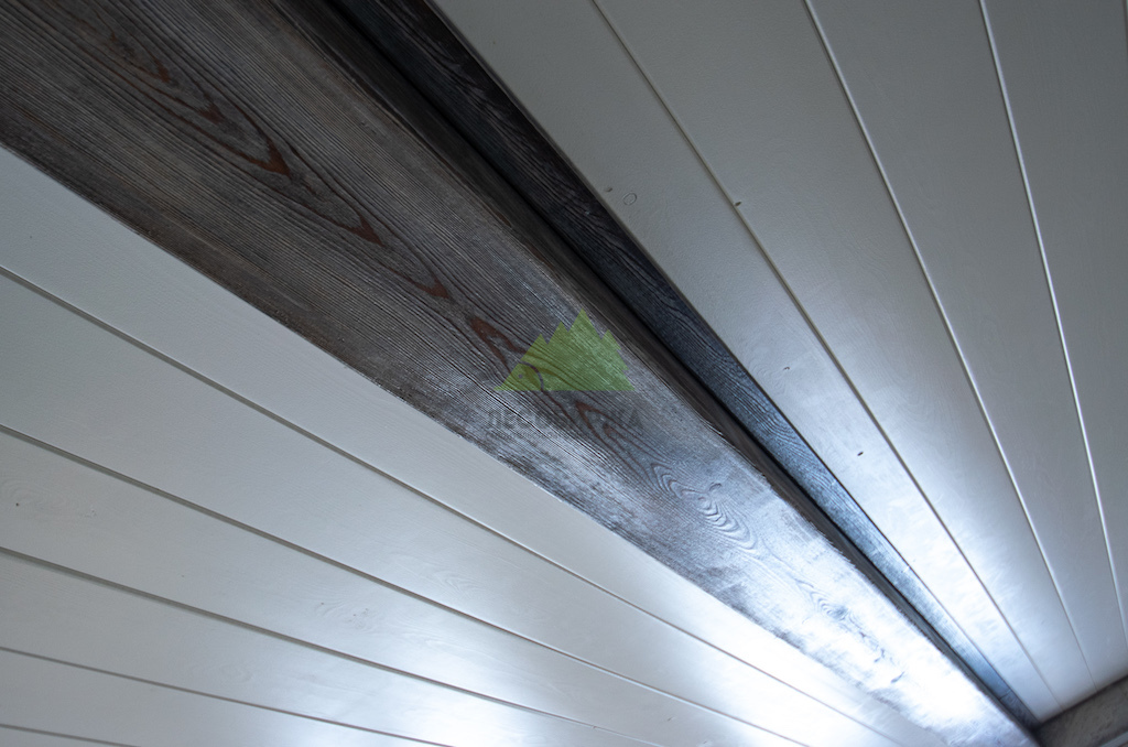 - Декоративные фальшбалки из сибирской лиственницы, подвергнутые брашированию и патинированию, для создания акцентов на потолке.