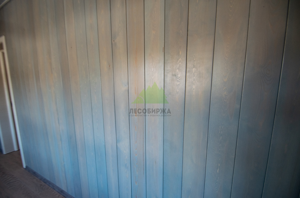 Для придания другим стеновым панелям теплых светлых тонов, наши специалисты использовали белесый лак для внутреннего применения по дереву Teknos TEKNOCOAT AQVA 2550-02 (TM6943/06). В результате, имитация бруса из ангарской сосны наполнилась совершенно иными цветовыми палитрами, напоминающими участки, припорошенные инеем, или благородный беленый дуб. Это создало невероятно красивый и сложный эффект.