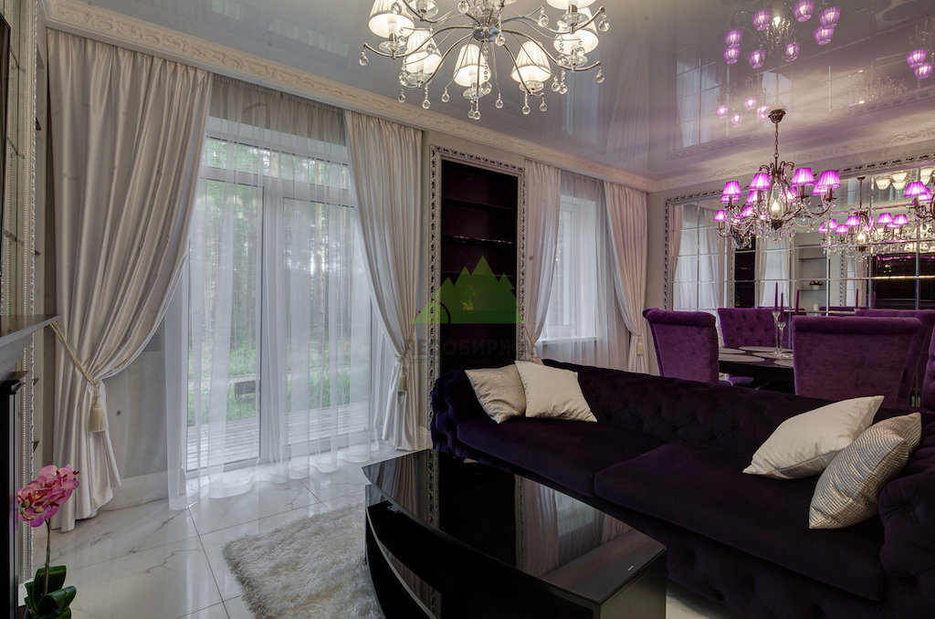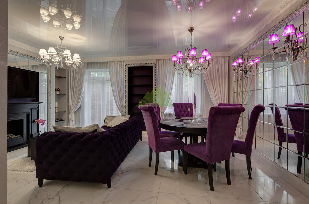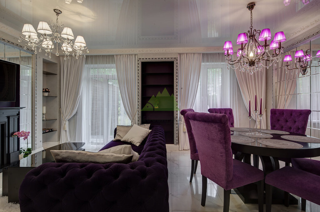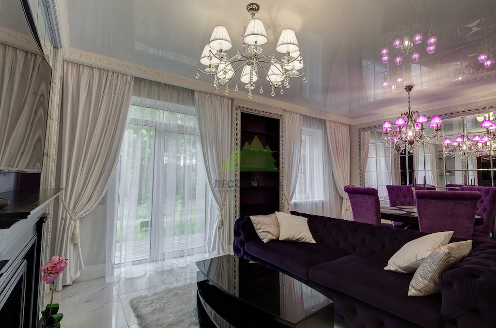 Мы уделили особое внимание деталям, которые формируют атмосферу классики. Например, были установлены необычные зеркальные панно, разделенные на одинаковые квадраты и расположенные напротив друг друга. Обрамленные элегантной кромкой и дополненные бра, они не только отражают свет, но и визуально расширяют пространство, создавая эффект бесконечности. Панорамные окна в пол стали еще одним важным элементом, максимально продлевающим световой день и наполняющим гостиную естественным светом. Дополнительное освещение обеспечили тщательно подобранные люстры и светильники, создающие многоуровневое и разнообразное световое оформление. По согласованию с заказчиком, потолки в гостиной были выполнены натяжными, глянцевыми, абсолютно белоснежными. Их блеск эффектно отражает свет шикарных люстр, разных по конструкции и цвету, что является тонким дизайнерским ходом, придающим интерьеру уникальность и утонченность. Светлая люстра, расположенная со стороны камина, при зажженном пламени создает волшебные блики, оживляя пространство.