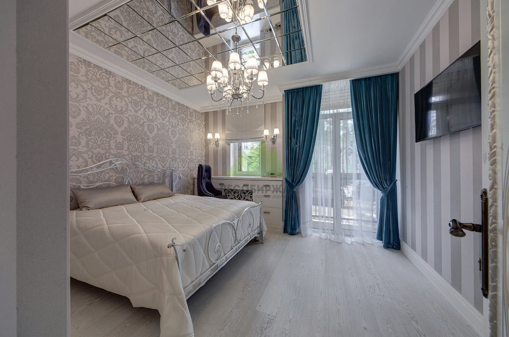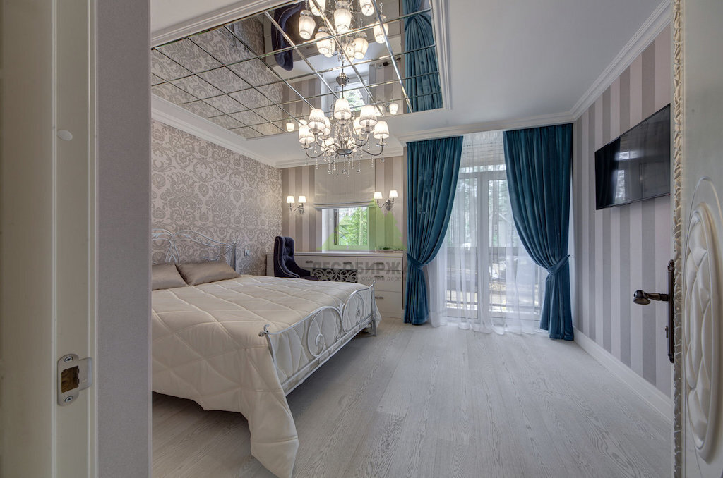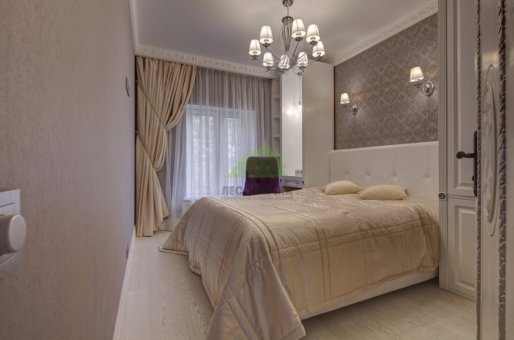 Для создания атмосферы полного расслабления в одной из спален наши мастера подобрали материалы и оттенки, которые способствуют безмятежности. Все выполнено в мягких, светлых, пастельных тонах: обои с шелковистой текстурой на стенах, ламинат только из натурального дерева на полу, ослепительно белый потолок, люстра в виде канделябров и интересный потолочный светильник с подвесками. Широкие стеклопакеты и шикарные двери с барельефом, установленные по всему дому, подчеркивают общую эстетику.