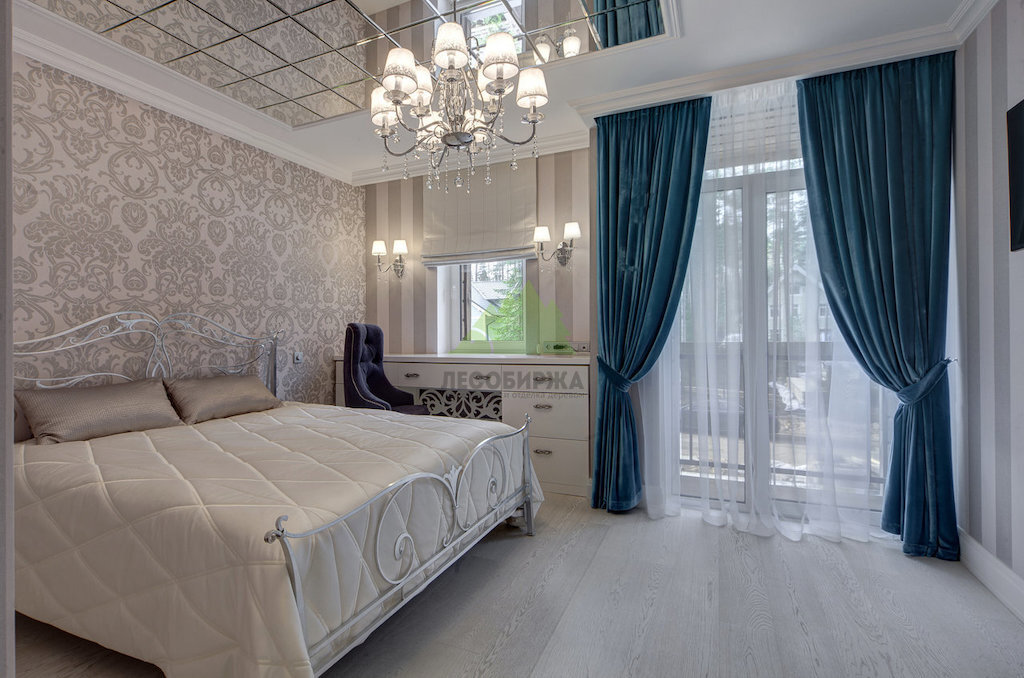 Вторая спальня требовала иного подхода, и мы реализовали его с учетом всех пожеланий. Изюминкой помещения стала вставка из идентичных зеркал на потолке над кроватью, а рядом с панорамным окном было проделано еще одно, более узкое окошко, украшенное с двух сторон настенными светильниками и прикрытое рулонными шторами из натуральной ткани. В отделке стен использовались два вида шелковистых обоев, идеально подходящих по текстуре и цветовым оттенкам, создающих спокойную и гармоничную атмосферу. Классика не терпит излишеств, поэтому все элементы были тщательно подобраны, чтобы подчеркнуть изысканный вкус владельцев дома.