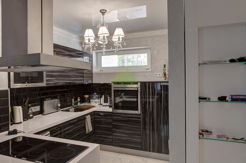Отделка кухни была выполнена в той же стилистике, что и остальная часть квартиры: светлые тона на стенах, белый, изысканный цвет для потолка, красивый, гладкий, под мрамор пол. Мы предусмотрели возможность для последующего обустройства кухни закрытыми шкафчиками, что позволило максимально удобно разместить бытовую технику, посуду и прочую утварь, обеспечив при этом стильный и функциональный интерьер.