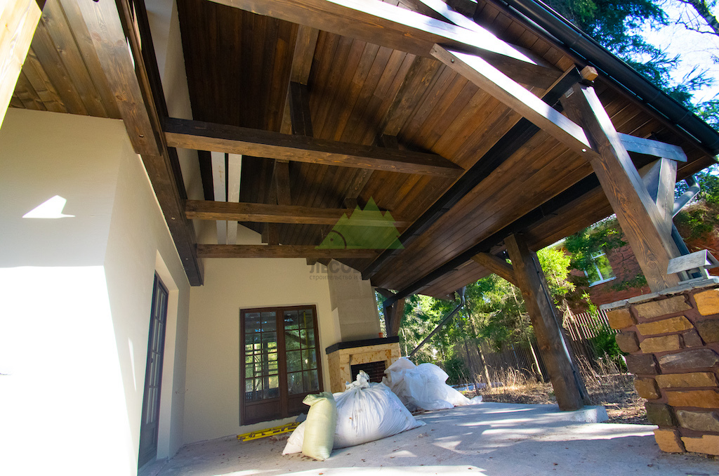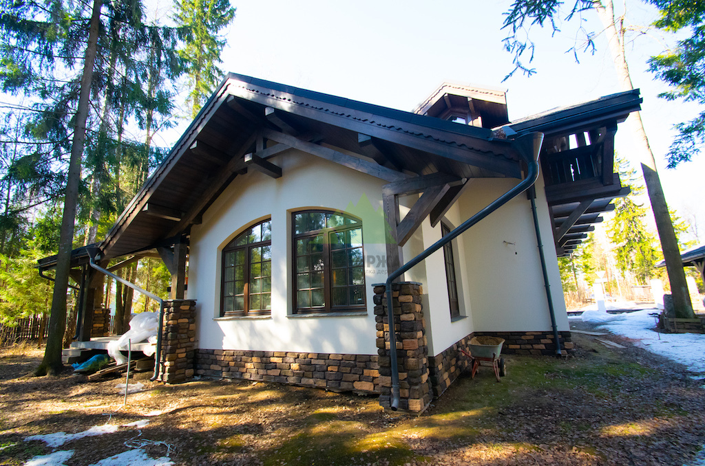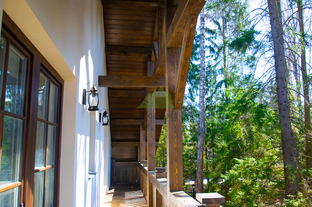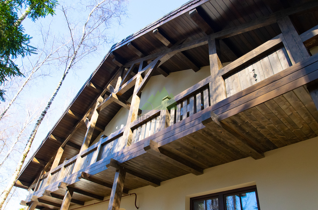 Фасадные работы и создание фахверковой системы: Мы начали с тщательной подготовки поверхности фасада. Это включало очистку от старых покрытий, нанесение антигрибковых составов для защиты и долговечности конструкции, а также грунтование. После этого был установлен цокольный профиль с технологическими зазорами и закреплен утеплитель, что обеспечило надежную теплоизоляцию. Нанесение штукатурного состава – выбор типа которого (силикатный, акриловый, минеральный) осуществлялся в соответствии с пожеланиями заказчика и особенностями эксплуатации – стало финишным этапом основной отделки. Оштукатуренные фасады не только придают дому природный и декоративный вид, но и эффективно сохраняют тепло, обеспечивая надежную защиту стен при минимальной нагрузке на фундамент. Параллельно с этим, ключевым элементом для придания дому облика "Шале" стало создание фахверковой системы. Для этого мы заказывали и обрабатывали в собственном производственном цеху планкен из сибирской лиственницы сорта АВ, который затем использовался для отделки свесов кровли. Особая лобовая резная доска, выполненная нашими мастерами, дополнила архитектурный ансамбль. Для придания дереву необходимого эффекта старины и защиты, проводилась обработка и браширование панелей составами Teknos.