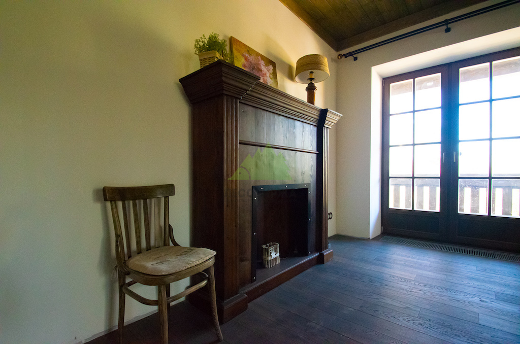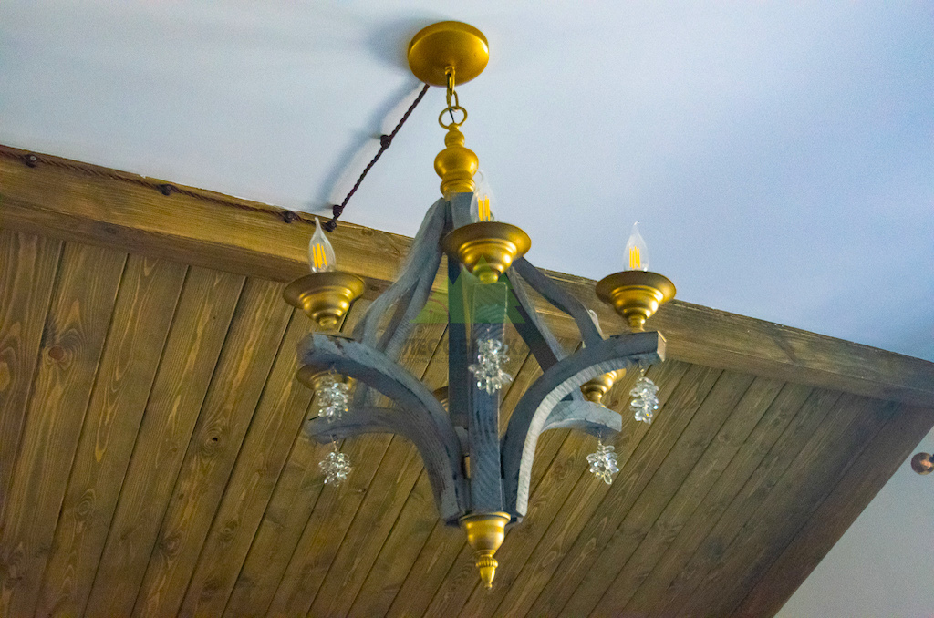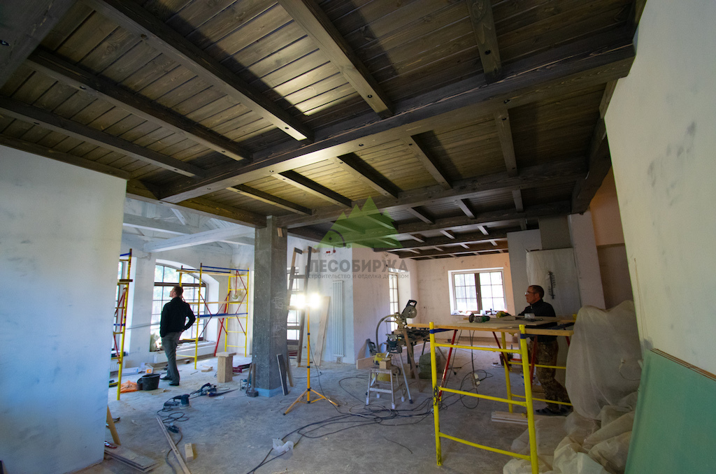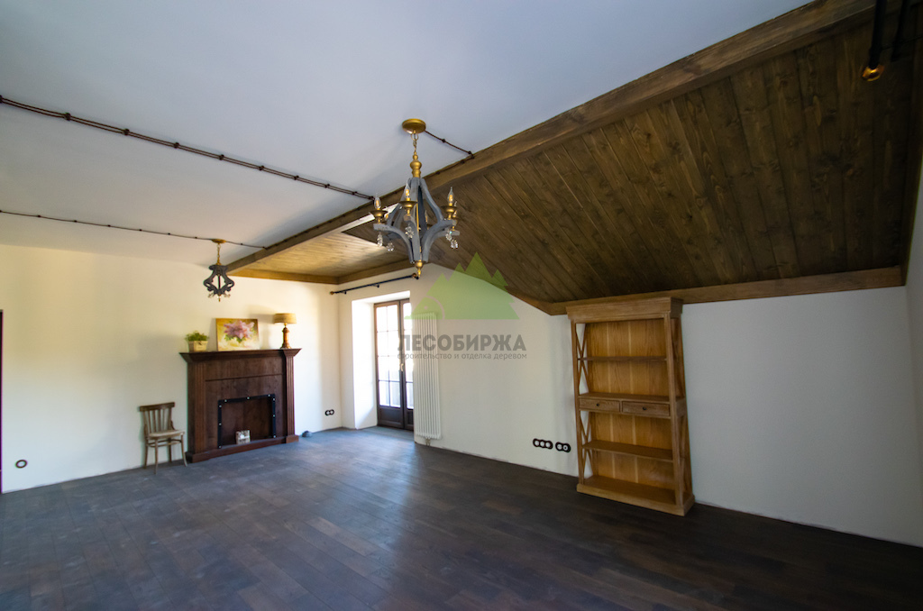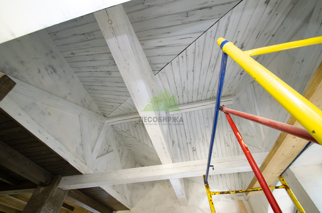Особое внимание уделялось созданию атмосферы "старины", характерной для альпийских домов. Потолки в доме были спроектированы и выполнены таким образом, чтобы имитировать давнюю историю строения. Специалисты столярного и малярного цехов Лесобиржи-Спб использовали вагонку из обычной сосны сорта А, которую затем подвергли специальной обработке для эффекта состаривания. Над головами "нависают" фальшбалки из лиственницы, искусно имитирующие старинные, массивные элементы. Они были уложены крест-накрест, создавая особенный колорит и ощущение фундаментальности, перенося жильцов в атмосферу минувших лет. Сочетание состаренных элементов с более современными решениями, такими как молочные участки потолка, окрашенные укрывной краской NORDICA EKO 3330 с эффектом состаривания, и более темное покрытие досок лиственницы, создало необычайно выразительный и гармоничный интерьер. Идеально подобранное сочетание тонов и материалов подчеркнуло уникальность каждого помещения.