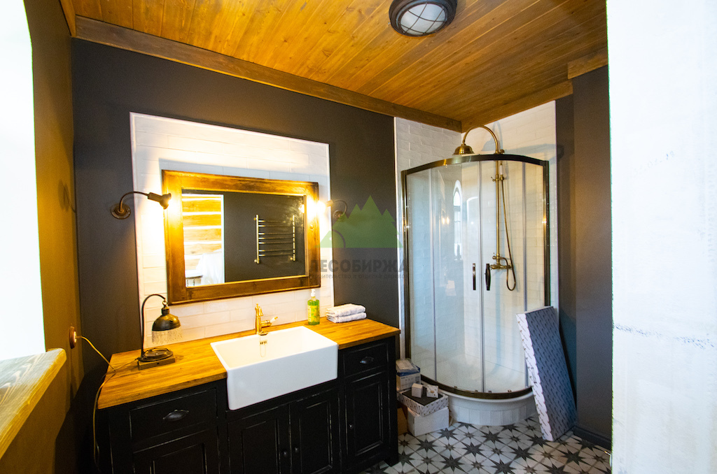 Ванная комната также была оформлена с учетом стиля и функциональности. Использование лиственницы для отделки не только эстетически привлекательно, но и крайне практично. Древесина лиственницы известна своей устойчивостью к влаге и перепадам температур, что делает ее идеальным выбором для помещений с повышенной влажностью. Теплый пар способствует высвобождению дивного аромата эфирных масел и смол, создавая дополнительную атмосферу релаксации и единения с природой. Для изготовления подоконников и зоны умывания был применен мебельный щит из сибирской лиственницы, гарантирующий высочайшее качество и долговечность.