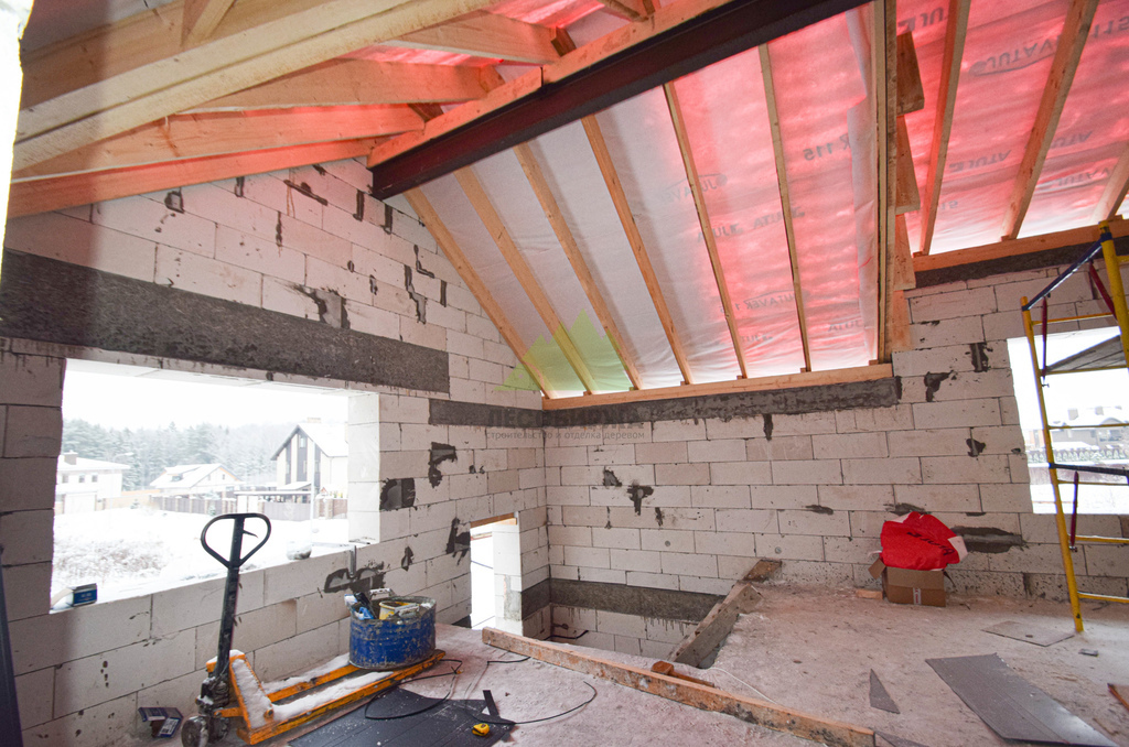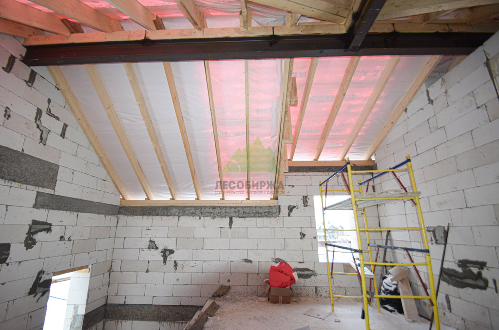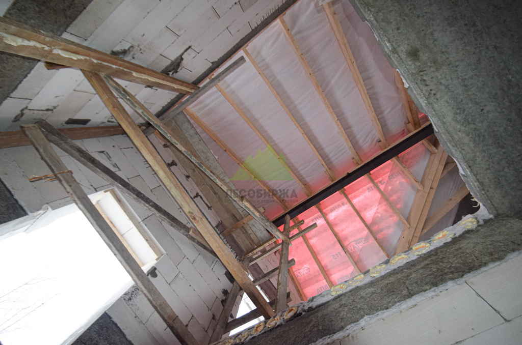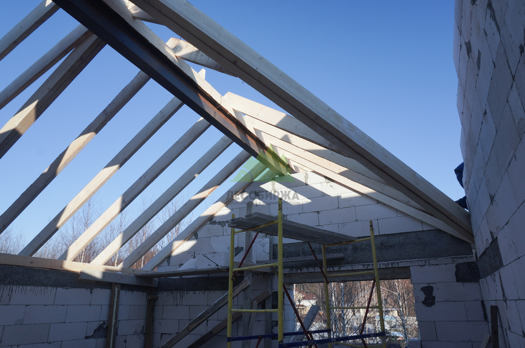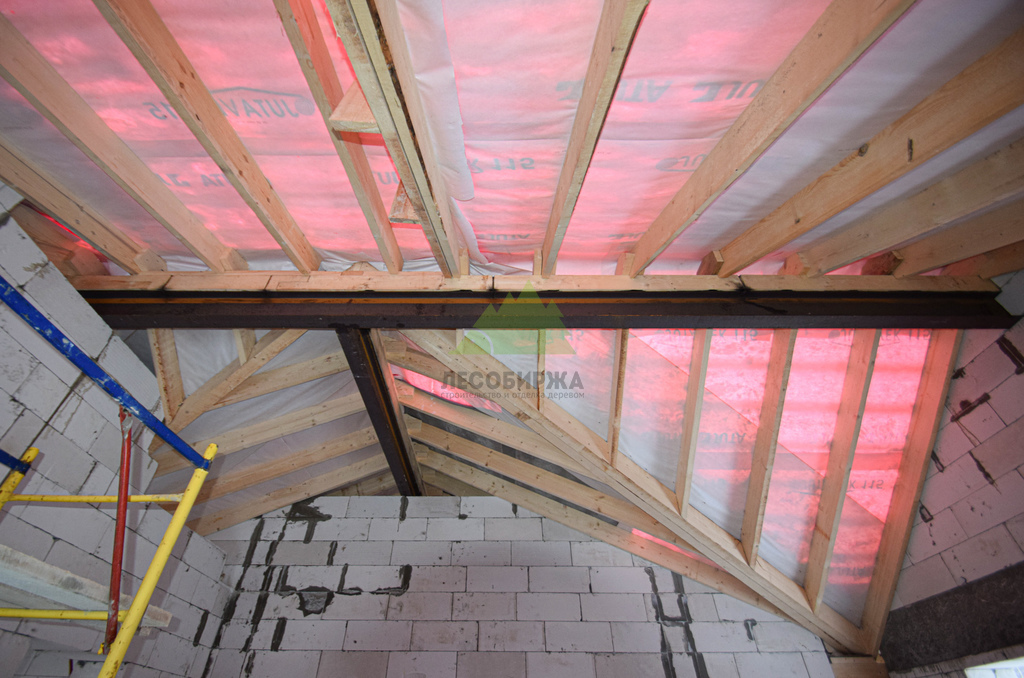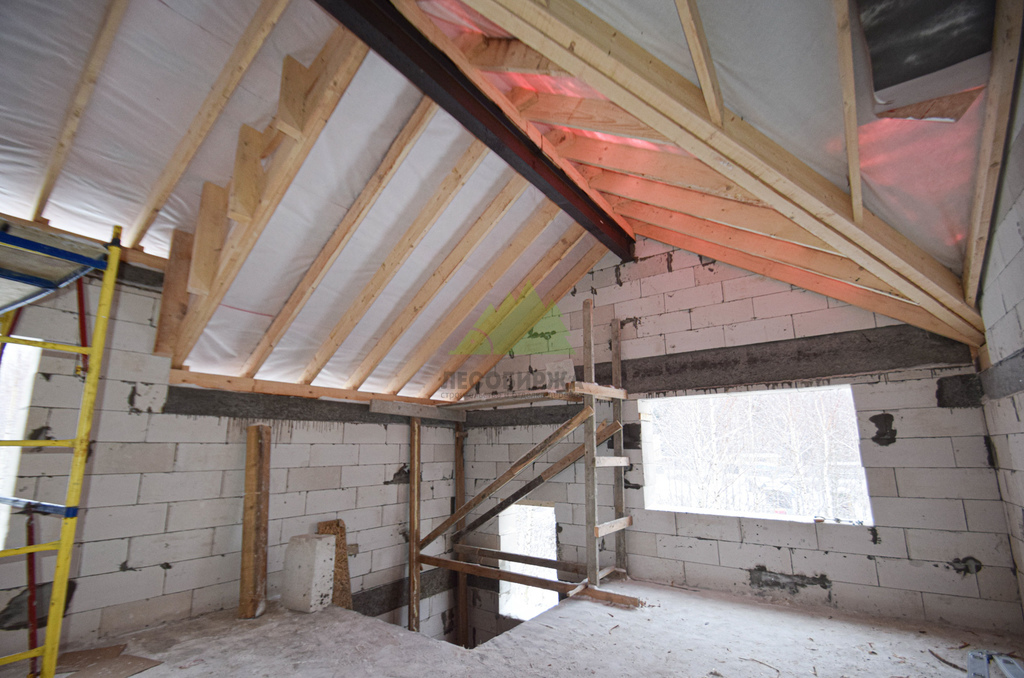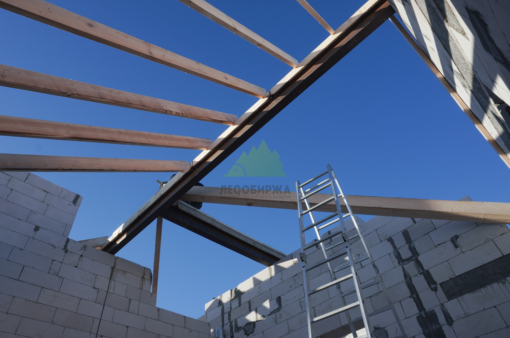 Кровля дуплекса представляет собой сложную многоскатную конструкцию с четырьмя ендовами, что придает зданию выразительный архитектурный облик и требует высокого мастерства при монтаже. Наши кровельщики Лесобиржи-Спб использовали наслонные стропила из обрезной доски сечением 50х200 мм, опирающиеся на мауэрлат и мощный коньковый прогон сечением 150х150 мм. Особенностью проекта стало использование металлического двутавра №24 в качестве конькового прогона, который был установлен на газобетон через распределительную монолитную подушку. Это уникальное инженерное решение было применено в связи с необходимостью перекрытия пролетов длиной более 6 метров. Применение неразрезной схемы стропильной системы позволило уменьшить высоту проката, оптимизируя конструкцию и снижая общую нагрузку на стены. Выбор обрезной антисептированной доски 2-го сорта для стропильной системы был обусловлен технологическим перерывом перед последующей чистовой отделкой и утеплением мансардных участков крыши, что позволило оптимально распределить бюджет проекта без ущерба для прочности и долговечности. Для обеспечения эффективного вентзазора под кровельным покрытием, необходимого для отведения влаги и предотвращения образования конденсата, был использован антисептированный брусок 50х50 мм и обрешетка 100х25 мм. В качестве гидроветрозащитной мембраны была применена супердиффузионная мембрана "Ютавек 115". Этот материал гарантирует максимальную защиту утеплителя от намокания за счет капель конденсата, образующихся на внутренней поверхности кровли, и обеспечивает эффективное отведение паров влаги из подкровельного пространства. Финальным штрихом стало устройство кровельного настила из металлочерепицы "Unikma" профиля M28 в стильном матовом цвете RAL 7024, который идеально вписался в ландшафт Светлогорья.