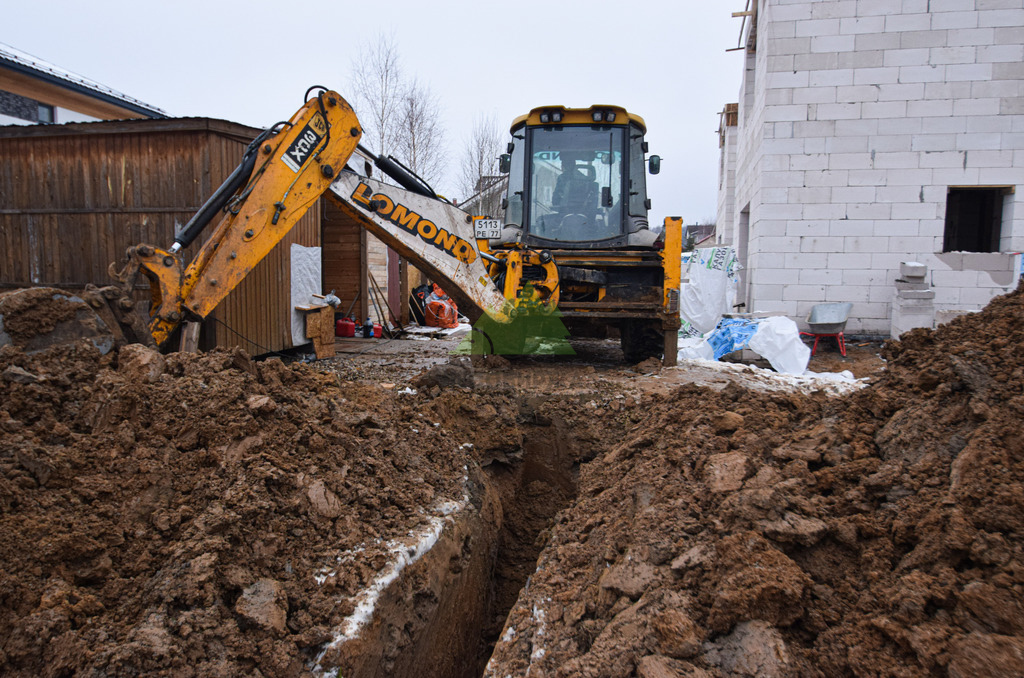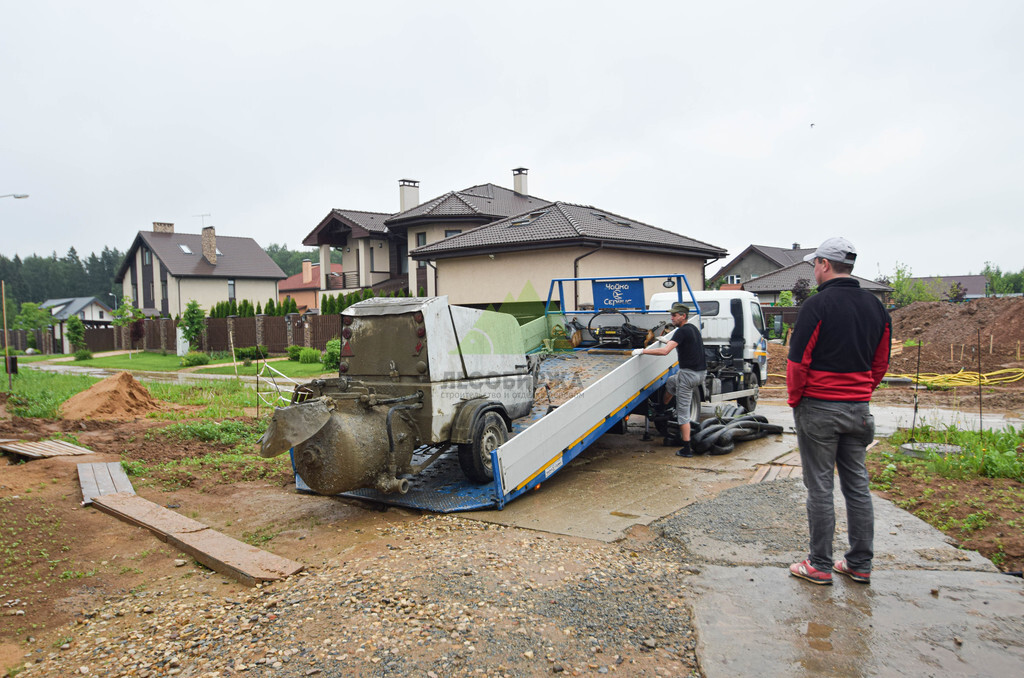 Участок в Светлогорье имел свои особенности – выраженный уклон, создающий перепад высот в пятне застройки до 50 см. Это потребовало от наших инженеров и строителей особого внимания к дренажной системе и устройству фундамента. Мы начали с тщательной выторфовки плодородного слоя на глубину от 30 до 80 см, чтобы обеспечить стабильное основание. Особое внимание было уделено комплексному устройству дренажа, который закладывался параллельно с подготовкой под фундамент. По периметру котлована был предусмотрен дренаж подушки с использованием высококачественной трубы диаметром 110 мм, обернутой в прочный геотекстиль. Вся дренажная система была спроектирована и выполнена с оптимальным уклоном, обеспечивающим эффективный отвод воды в центральный дренажный коллектор диаметром 315 мм. Это решение критически важно для предотвращения скопления влаги под фундаментом и сохранения его целостности на долгие годы. Для обеспечения максимальной надежности дно котлована было устлано иглопробивным геотекстилем плотностью 250 г/м², который также сформировал "рубашку" для дренажа. Заполнение дренажной системы выполнялось гравием фракции 20-40 мм, создавая эффективный фильтрующий слой.