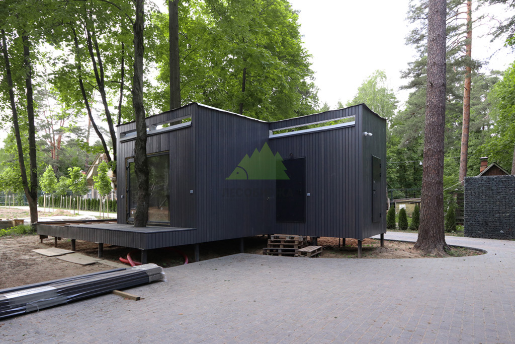 Принятое нашими архитекторами и монтажниками решение монтировать планкен вертикально, а не горизонтально, добавило строению особую изюминку. Этот прием визуально вытягивает фасад, делая его более легким и динамичным, а также способствует еще более эффектному слиянию с вертикальными стволами деревьев. В результате дом выглядит не просто частью леса, а его органичным элементом, излучающим некую таинственность и загадочность. Это создает уникальную атмосферу уединения и комфорта, которая, несомненно, будет оценена каждым гостем. Мы убеждены, что архитектура должна вдохновлять, и этот проект – яркое тому подтверждение.