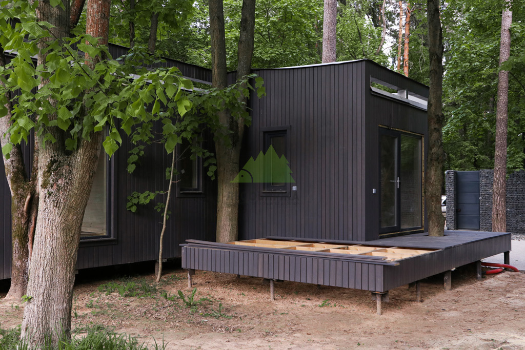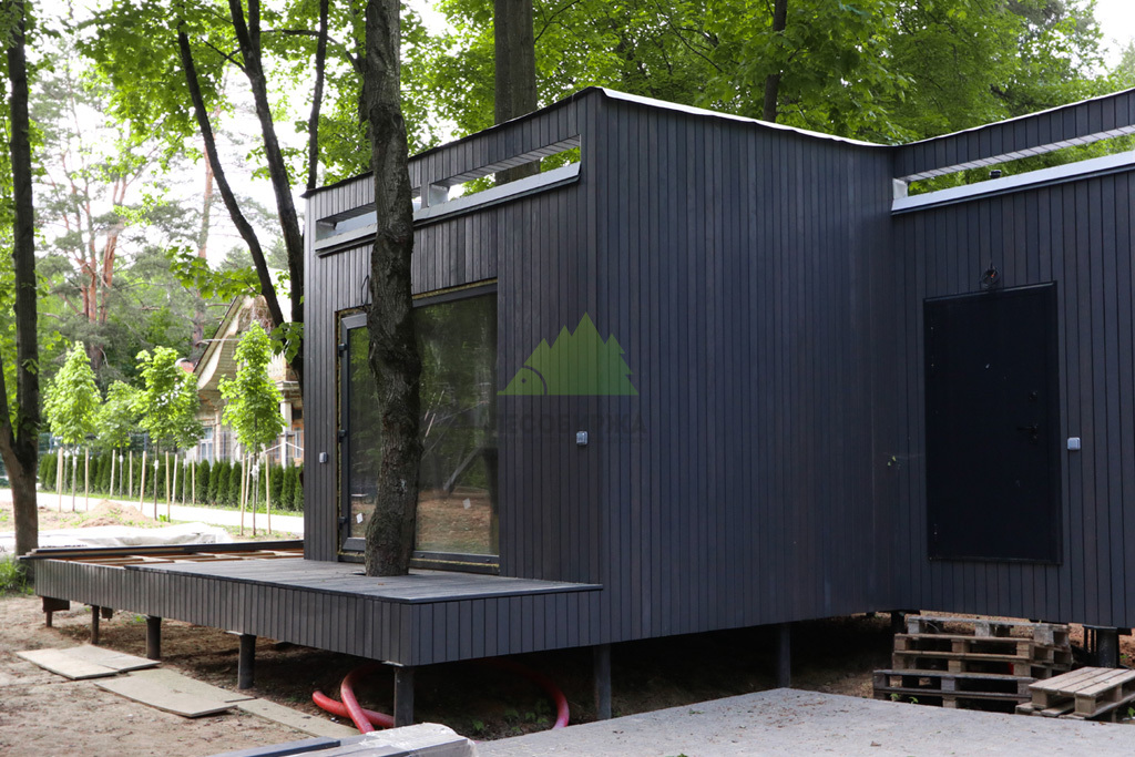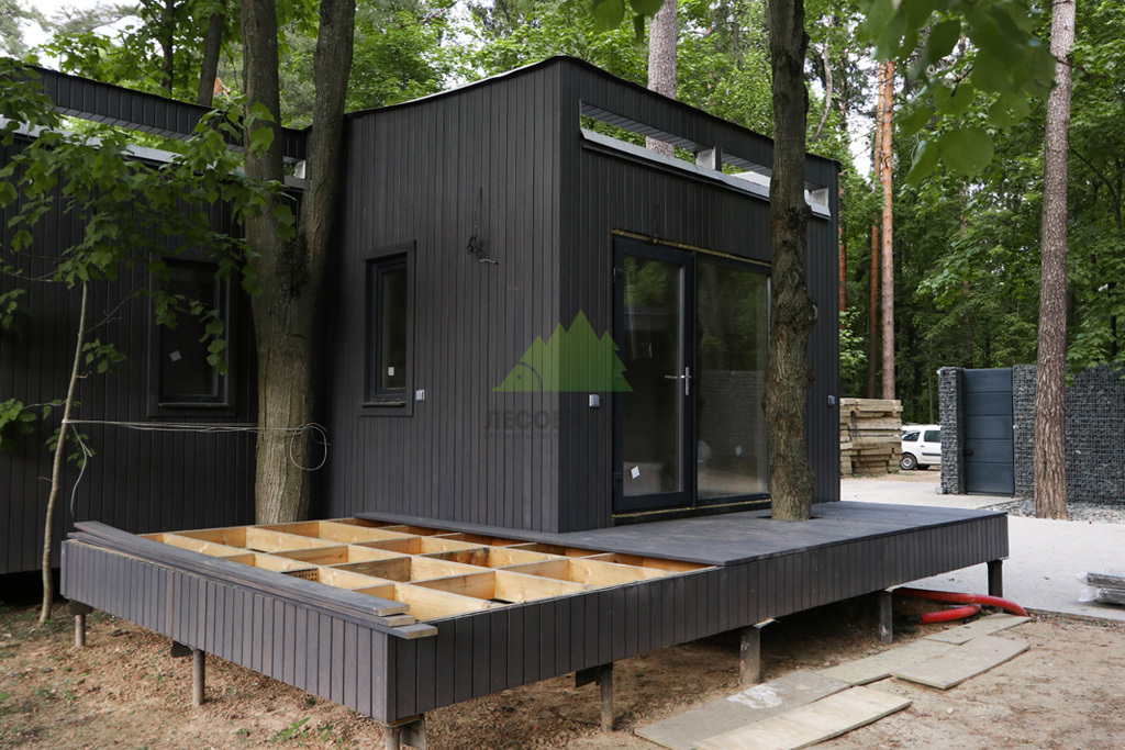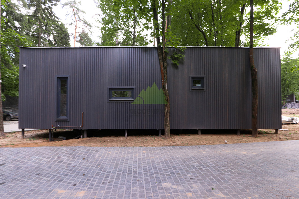 Выбор материалов и архитектурных решений стал ключевым этапом в достижении поставленной цели. Для внешней отделки мы выбрали прямой планкен из сибирской лиственницы сорта АВ, который был профессионально окрашен на нашем производстве. Лиственница ценится за свою исключительную прочность, устойчивость к влаге, перепадам температур и биологическим воздействиям, что делает ее идеальным материалом для строительства в условиях Северо-Западного региона. Заводская окраска обеспечивает равномерное и глубокое покрытие, значительно продлевает срок службы фасада и исключает риски, связанные с погодными условиями во время монтажа. Темный оттенок планкена был выбран неслучайно: он позволяет дому буквально растворяться среди вековых сосен и елей, создавая ощущение полной гармонии с окружающей природой и не нарушая ее естественной красоты. Такое решение подчеркивает изысканный вкус заказчика и наше умение тонко чувствовать особенности ландшафта.