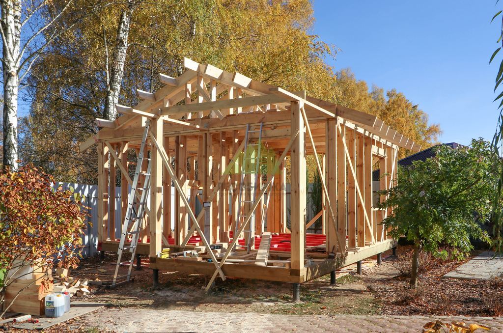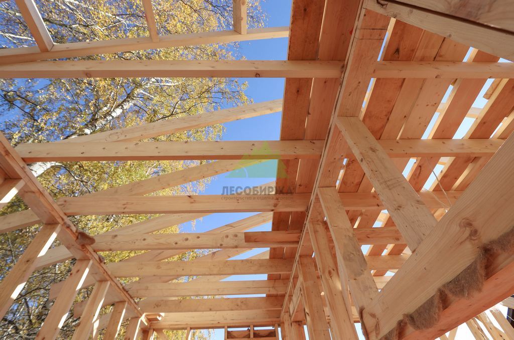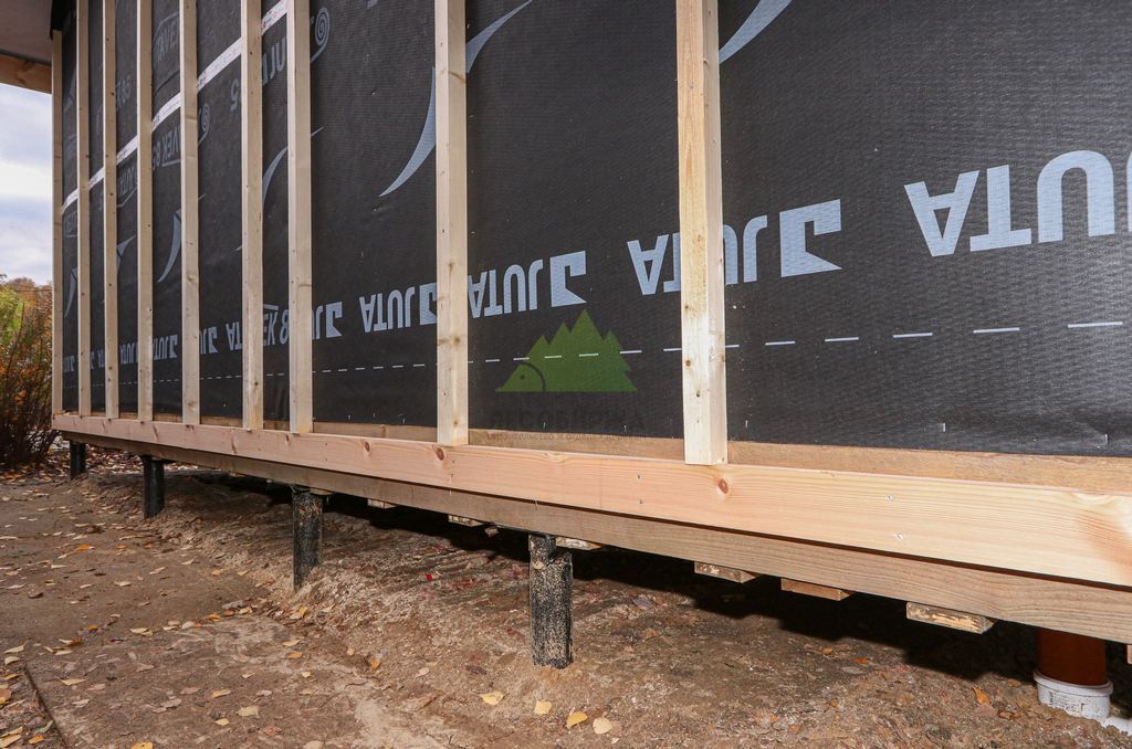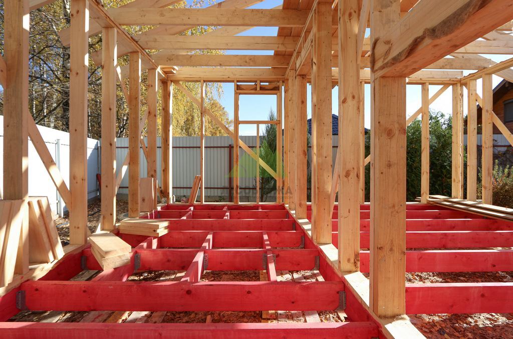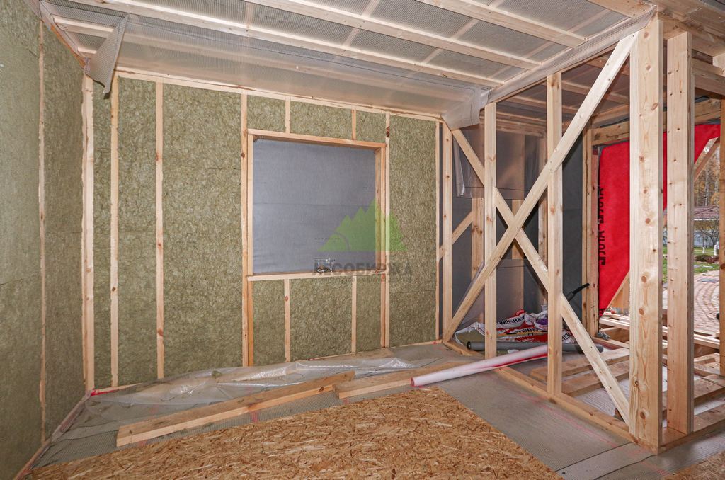Далее начался самый ответственный этап — возведение каркаса бани. Мы используем только высококачественный сухой пиломатериал, тщательно отобранный и обработанный на нашем производстве, что исключает деформации и усадку в процессе эксплуатации. Наши мастера-плотники с ювелирной точностью собрали силовой каркас стен, полов и перекрытий, строго следуя проектной документации. Каркасная технология строительства, которую Лесобиржа-Спб применяет уже много лет, позволяет добиться высокой прочности конструкции при относительно небольшом весе, а также обеспечивает исключительную геометрическую стабильность. Все соединения выполнялись с соблюдением технологий, гарантирующих надежность и долговечность. Особое внимание уделялось устройству проемов для окон и дверей, а также усилению углов и критически важных узлов. На этом этапе мы закладывали основу для будущего комфорта и энергоэффективности бани, обеспечивая идеальную базу для дальнейших работ.