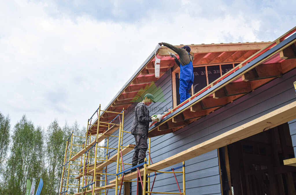 Внешняя отделка дома была призвана не только защитить конструкции от воздействия окружающей среды, но и придать зданию завершенный, эстетичный вид, гармонирующий с архитектурой Резиденции Солнечное. После монтажа гидро-ветрозащитной мембраны и создания вентилируемого зазора, был установлен фасад из имитации бруса, окрашенный в выбранные заказчиком оттенки. Этот материал идеально подходит для деревянных домов, подчеркивая их природную красоту и обеспечивая дополнительную защиту. Наши маляры использовали высококачественные фасадные краски, устойчивые к выцветанию и атмосферным воздействиям, что гарантирует сохранение первоначального вида дома на долгие годы. Отдельное внимание уделили подшивке свесов кровли и оформлению углов, что придало дому аккуратный и законченный вид.