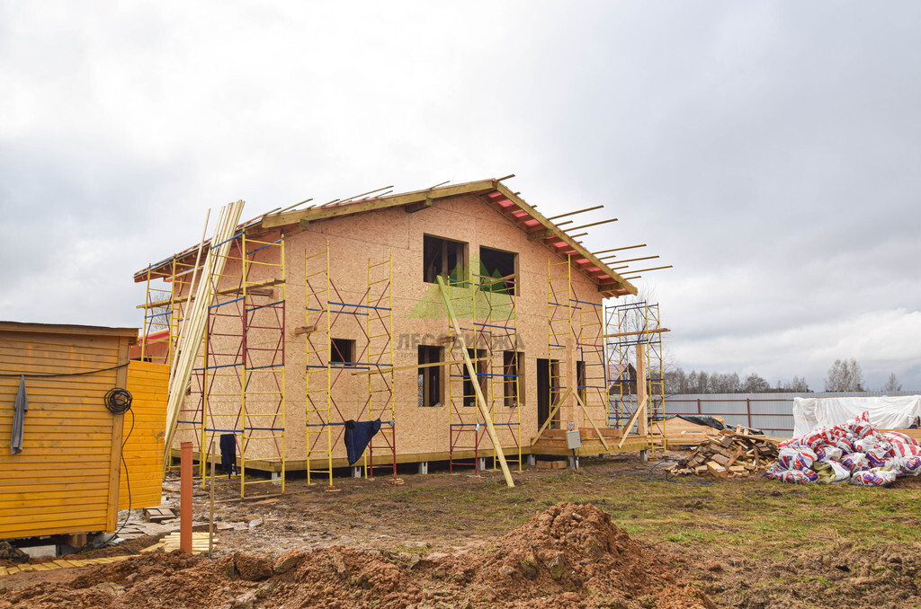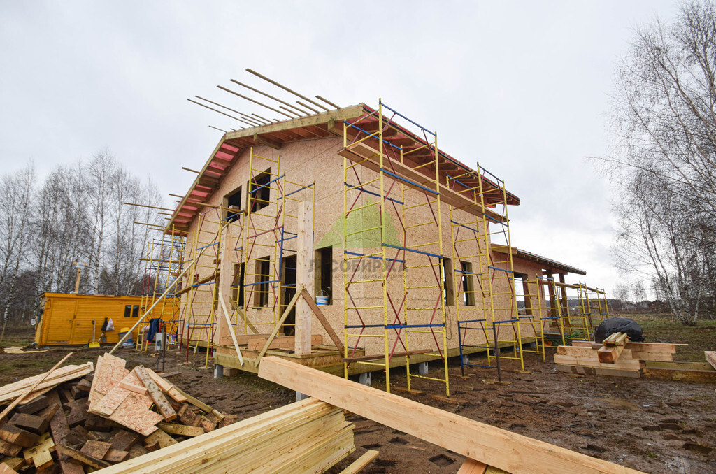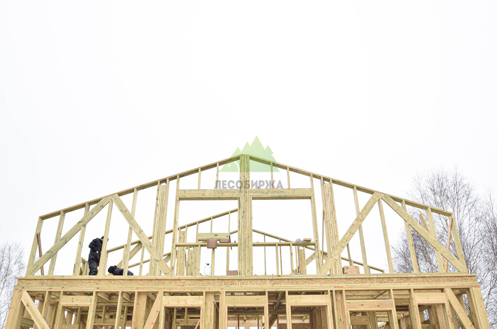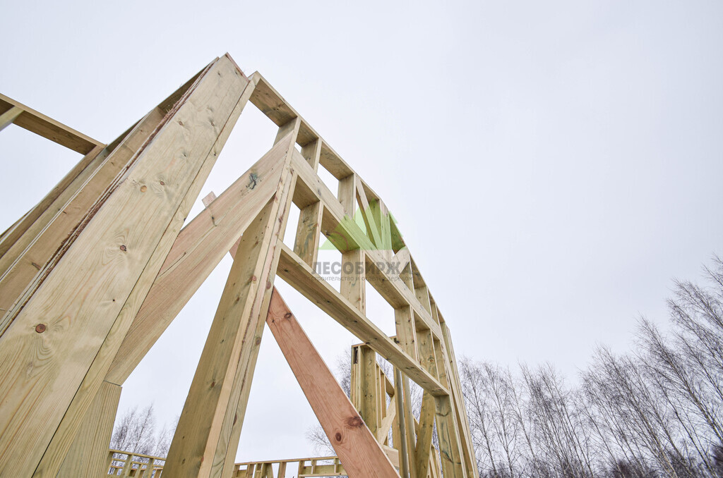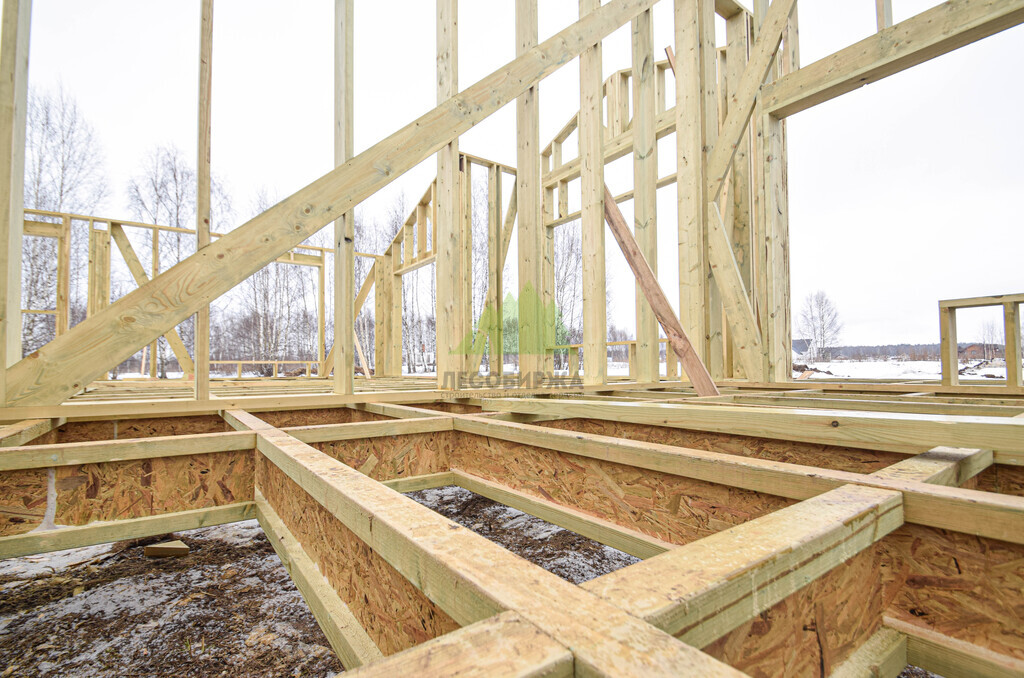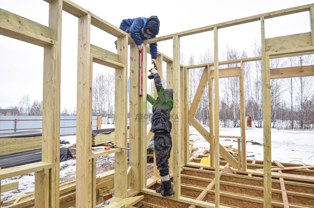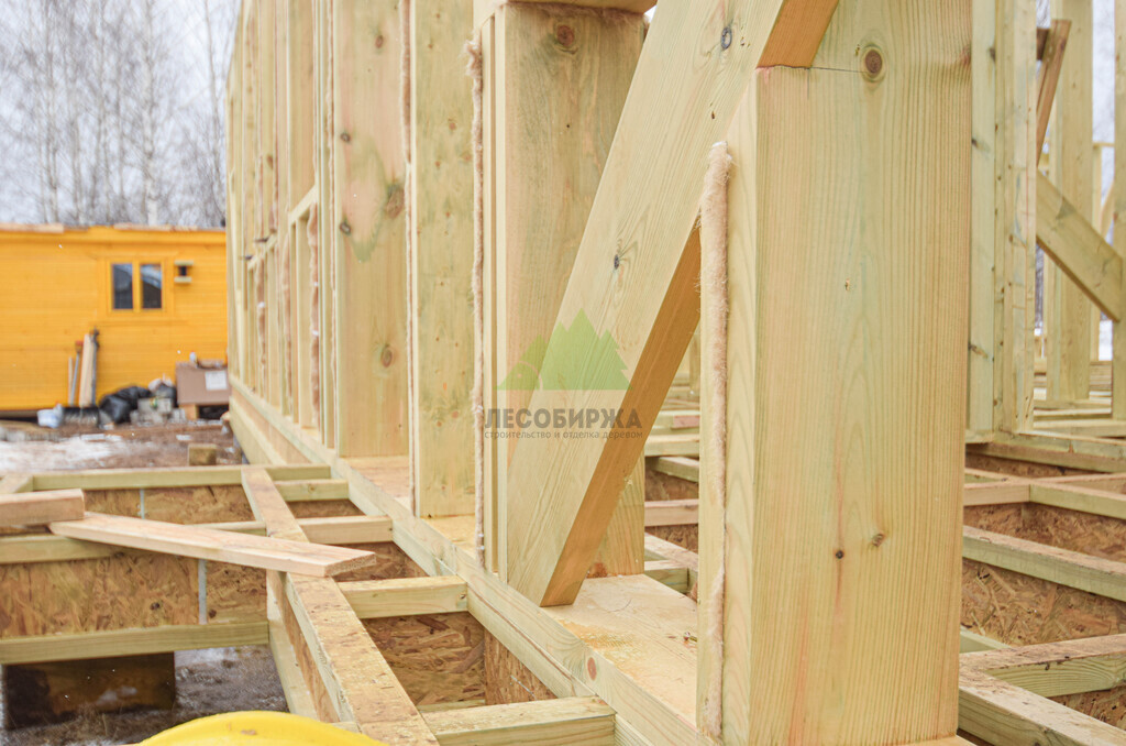 Сердцем любого каркасного дома является его силовой каркас. Для этого проекта были использованы тщательно отобранные пиломатериалы камерной сушки из хвойных пород дерева, обработанные современными антисептическими и огнебиозащитными составами на производственной базе Лесобиржи-Спб. Это гарантирует долговечность конструкции и безопасность эксплуатации. Сборка каркаса осуществлялась по заранее разработанным чертежам с ювелирной точностью. Каждый элемент – от обвязочного бруса до стропильной системы – был установлен с соблюдением всех норм СНиП. Были сформированы стены, перекрытия и крыша, создавая прочную и надежную коробку дома. Контроль качества производился на каждом этапе монтажа, что исключило любые отклонения от проекта и обеспечило идеальную геометрию здания.