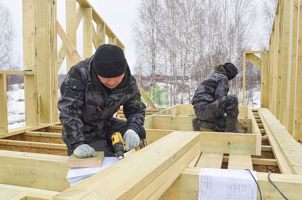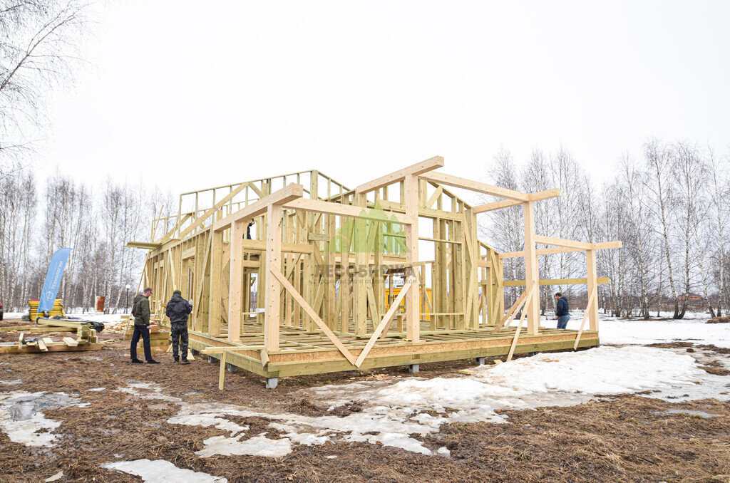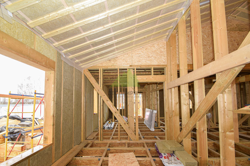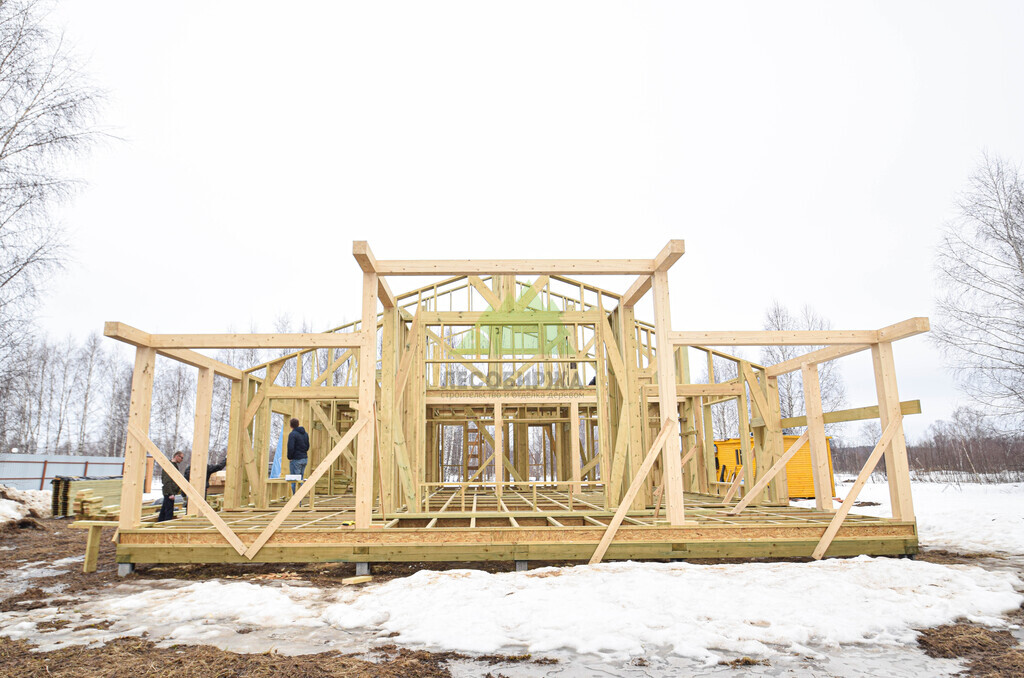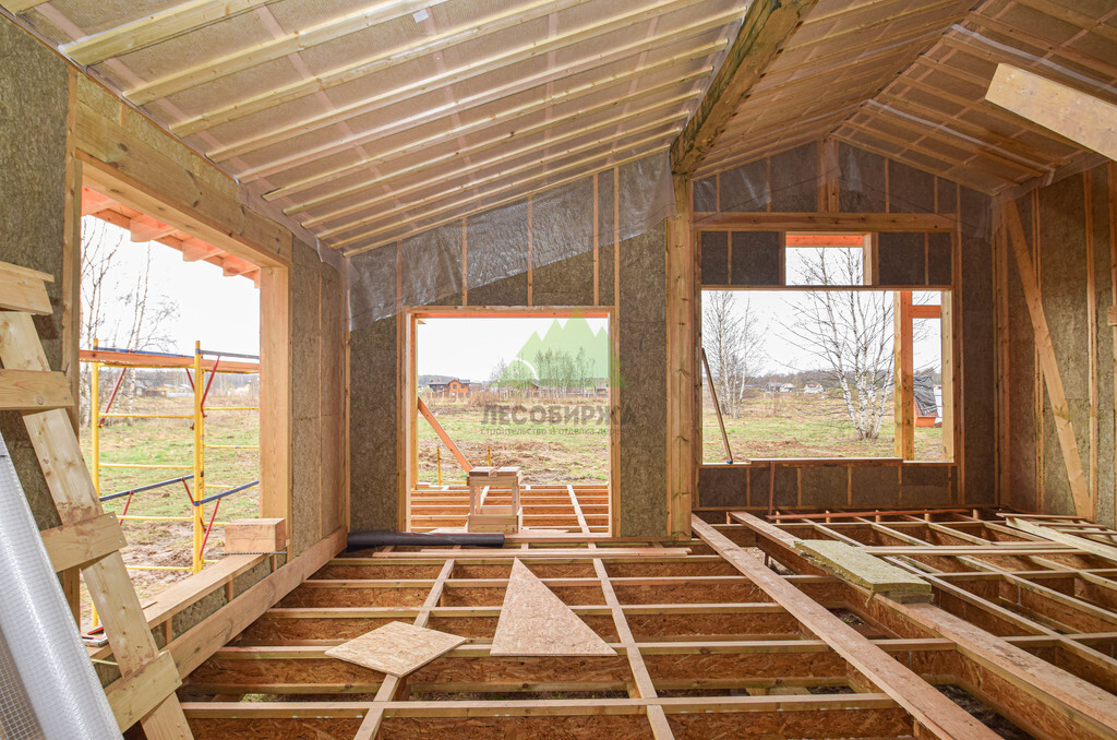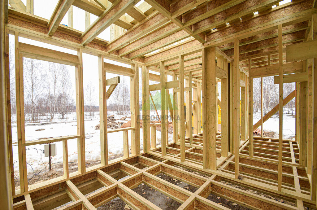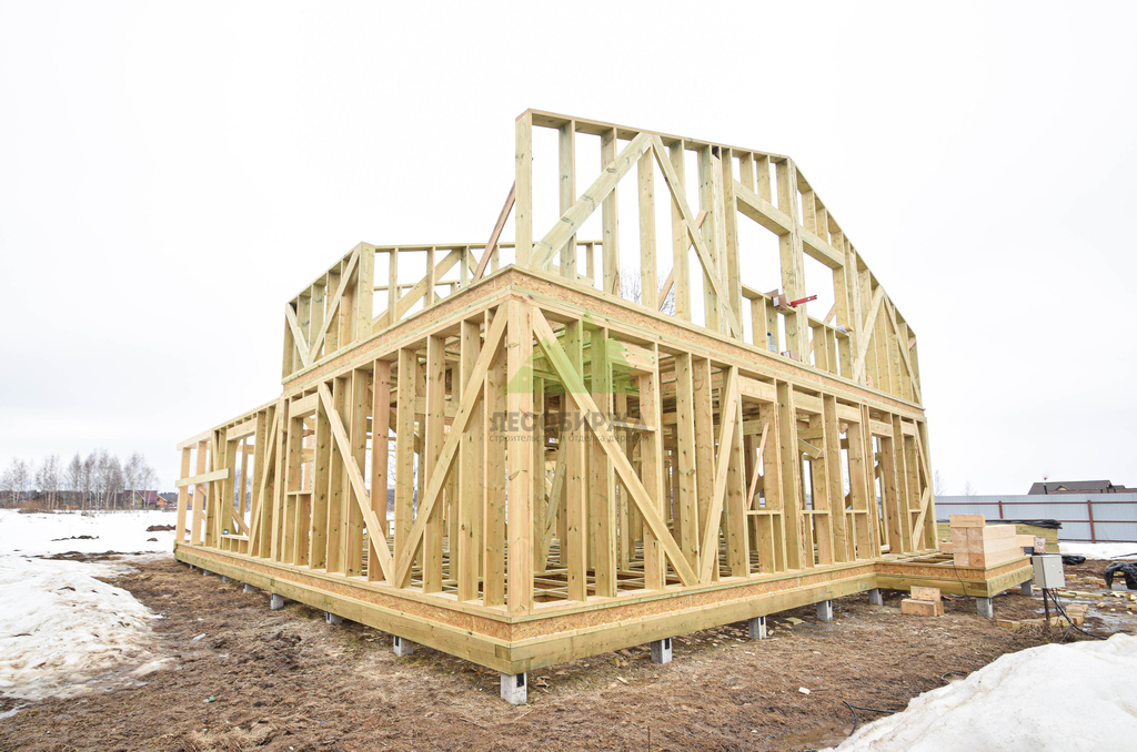 Сердцем любого каркасного дома является его силовой каркас. Для этого проекта были использованы тщательно отобранные пиломатериалы камерной сушки из хвойных пород дерева, обработанные современными антисептическими и огнебиозащитными составами на производственной базе Лесобиржи-Спб. Это гарантирует долговечность конструкции и безопасность эксплуатации. Сборка каркаса осуществлялась по заранее разработанным чертежам с ювелирной точностью. Каждый элемент – от обвязочного бруса до стропильной системы – был установлен с соблюдением всех норм СНиП. Были сформированы стены, перекрытия и крыша, создавая прочную и надежную коробку дома. Контроль качества производился на каждом этапе монтажа, что исключило любые отклонения от проекта и обеспечило идеальную геометрию здания.