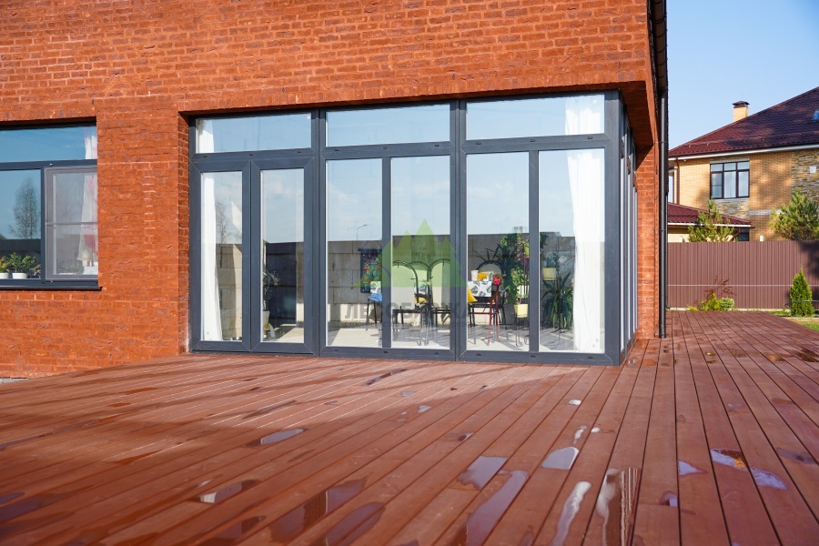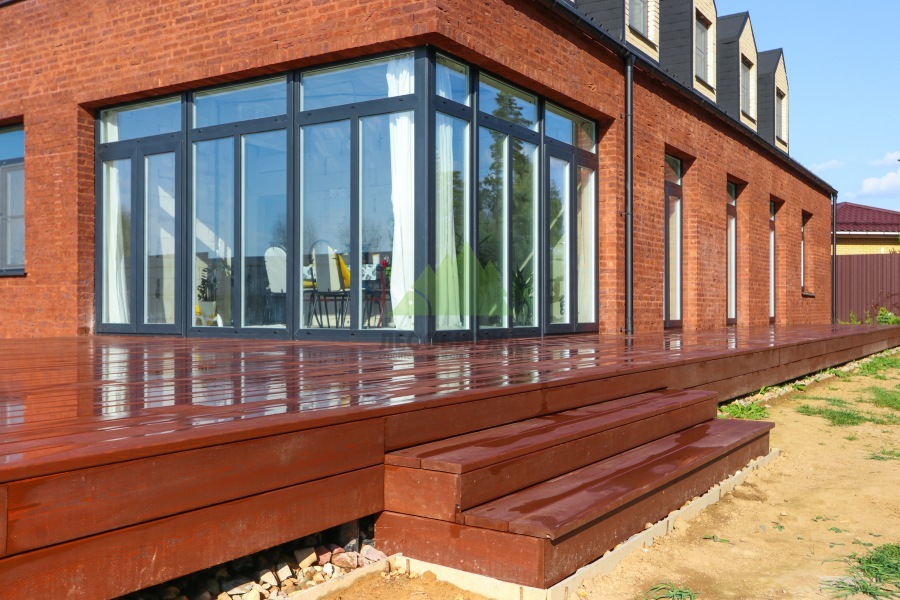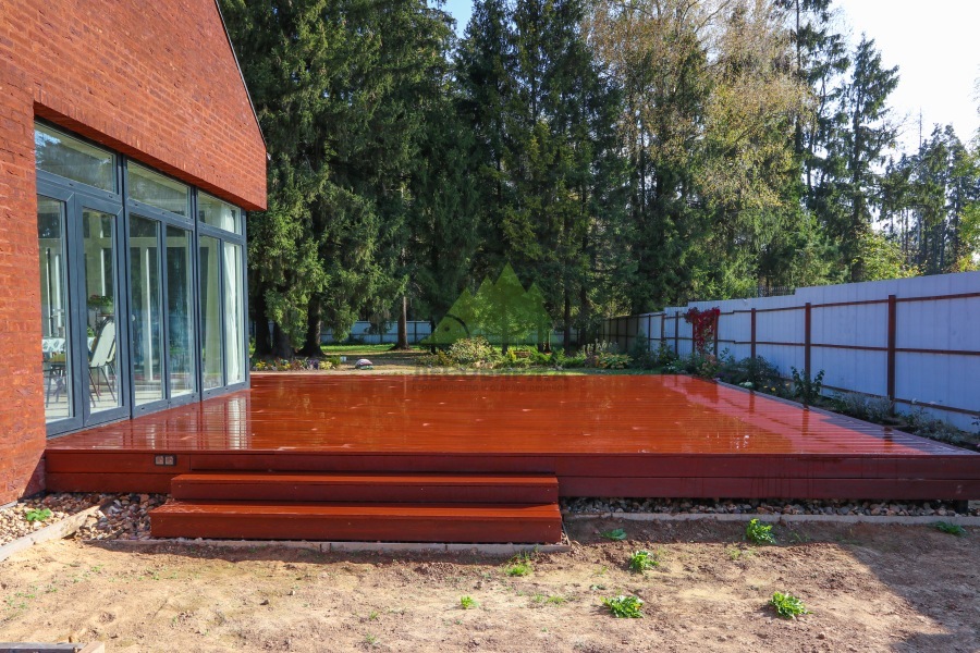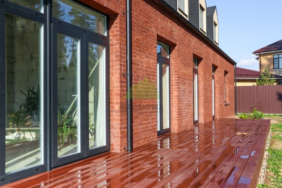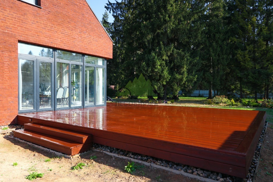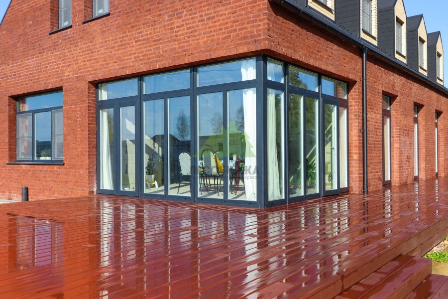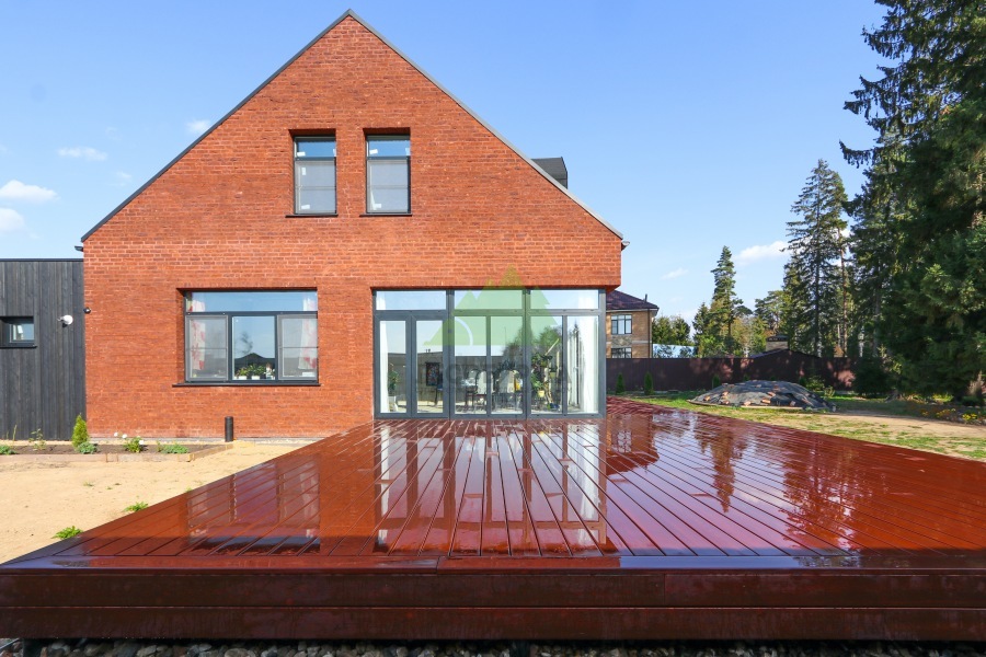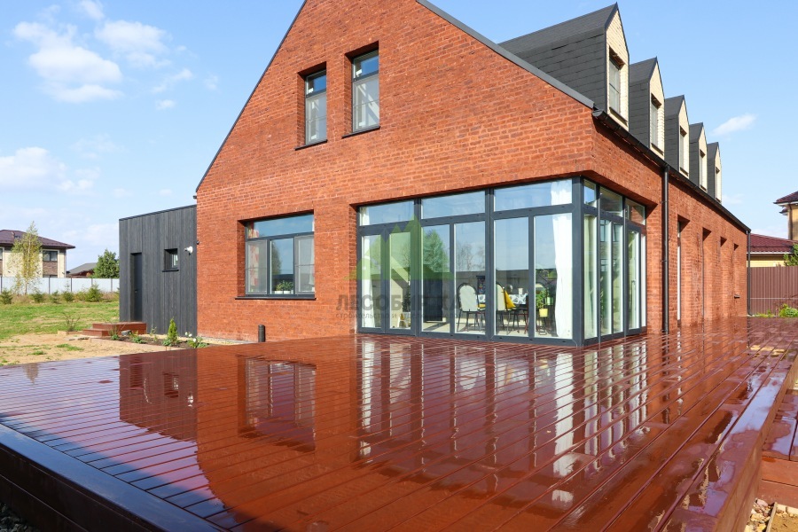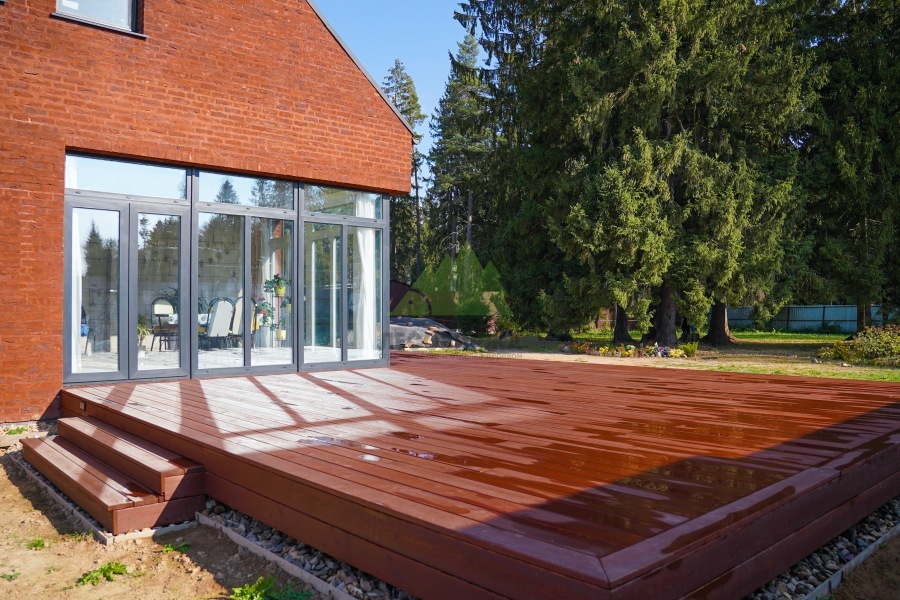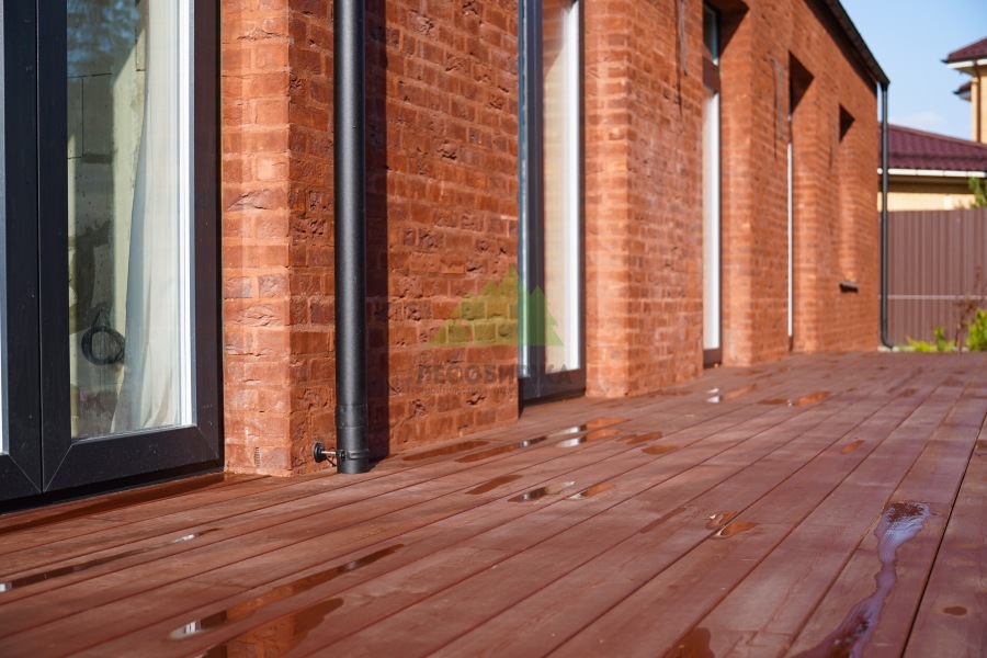 Террасная доска также прошла полный цикл обработки в нашем знаменитом малярном цехе. Система окрашивания включала грунт "Renner M 101", который подготавливает поверхность и обеспечивает максимальную адгезию, и финишное масло "Renner A 300". Результат превзошел все ожидания – поверхность террасы получилась не только чрезвычайно красивой, но и идеально защищенной, приятной на ощупь и устойчивой к истиранию. Это создало идеальное пространство для отдыха и семейных мероприятий, место, где каждый вечер превращается в теплый и уютный праздник. Клиент был в восторге от того, как преобразился его участок, получив гармоничное продолжение интерьера дома на открытом воздухе.