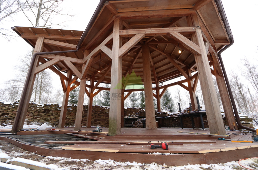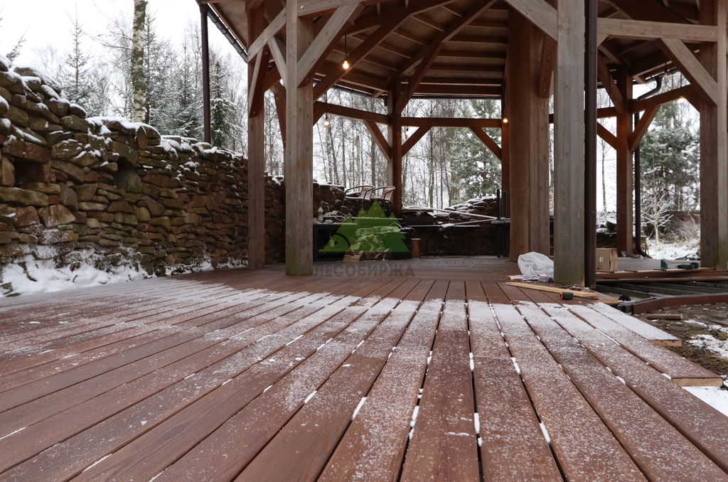 После сборки каркаса перешли к укладке террасной доски. Монтаж выполнялся с обязательными компенсационными зазорами, обеспечивающими нормальную работу древесины на улице. Крепёж подбирался с расчётом на уличные условия, чтобы исключить коррозию, скрипы и ослабление соединений со временем. Настил формировался аккуратно, с ровными линиями и чистыми примыканиями.
