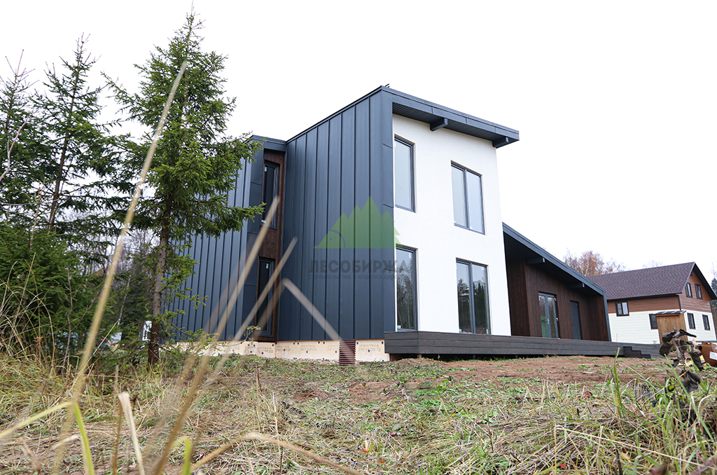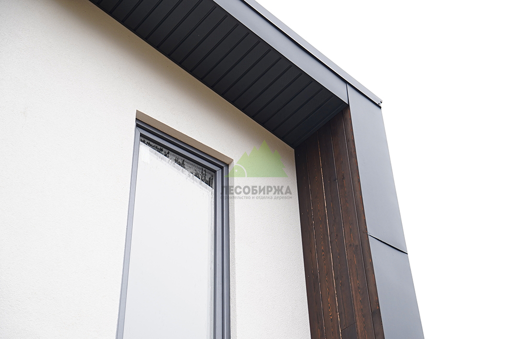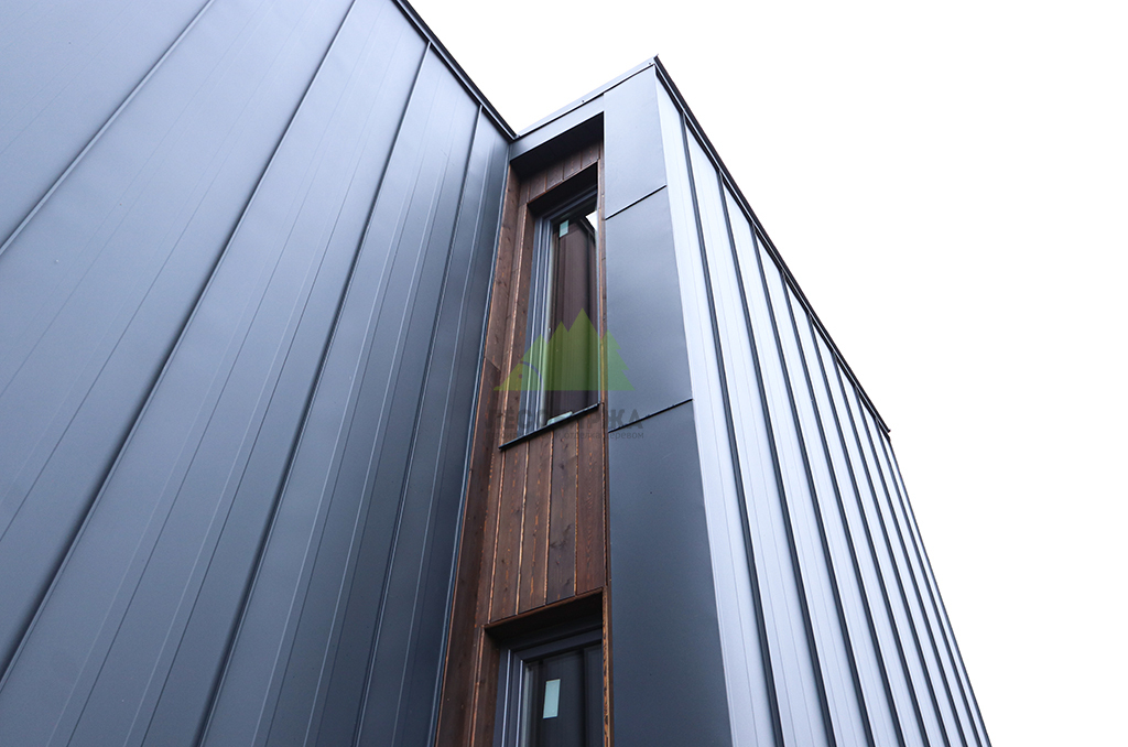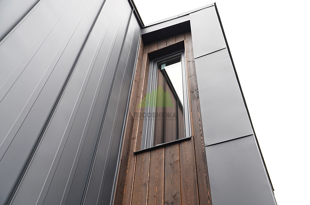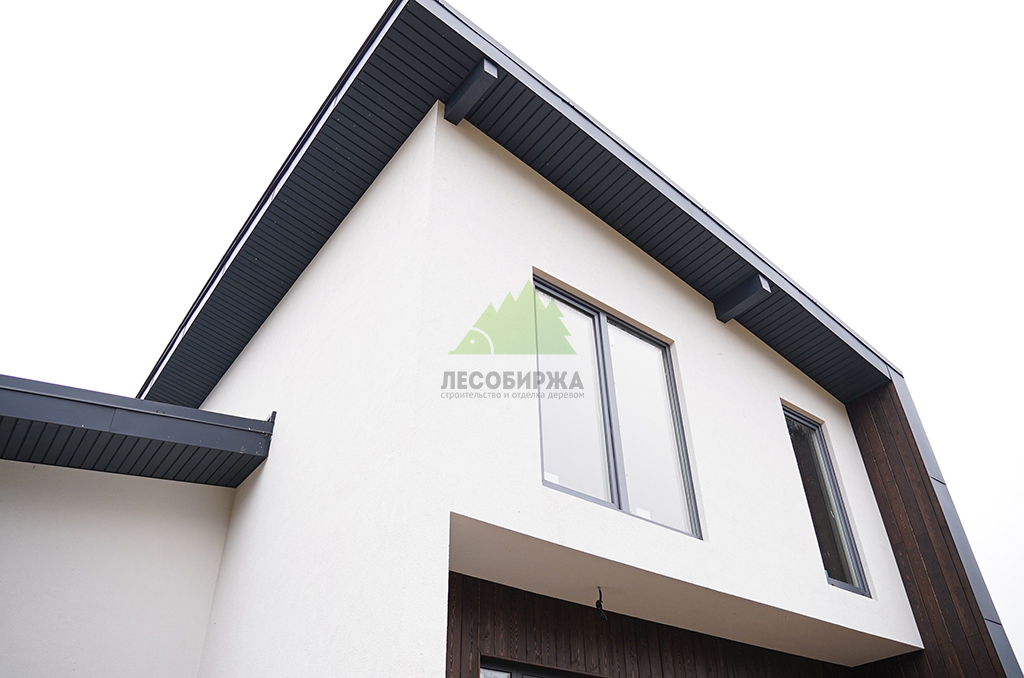 Особое внимание мы уделили этапу окрашивания древесины. Все фасадные элементы прошли профессиональную обработку в наших цехах, где на них было нанесено высококачественное гидромасло Renner M 300. Цеховое окрашивание — это гарантия идеального, равномерного покрытия, которое невозможно достичь при работе на объекте. Этот процесс не только подчеркнул уникальную текстуру сибирской лиственницы, выявляя всю ее премиальную фактурность, но и обеспечил максимальную защиту от ультрафиолета, влаги и грибка. Цветовое решение тщательно подбиралось по образцам заказчика, чтобы идеально вписать фасад в окружающий ландшафт и общую стилистику участка. В результате, в сочетании с элементами штукатурки и фальцевой кровли, мы получили эстетически безупречный комбинированный фасад, который придает дому особый характер и респектабельность.