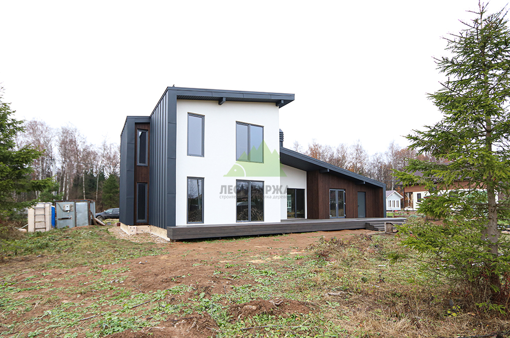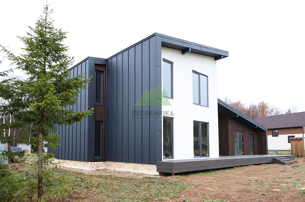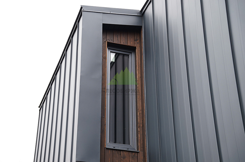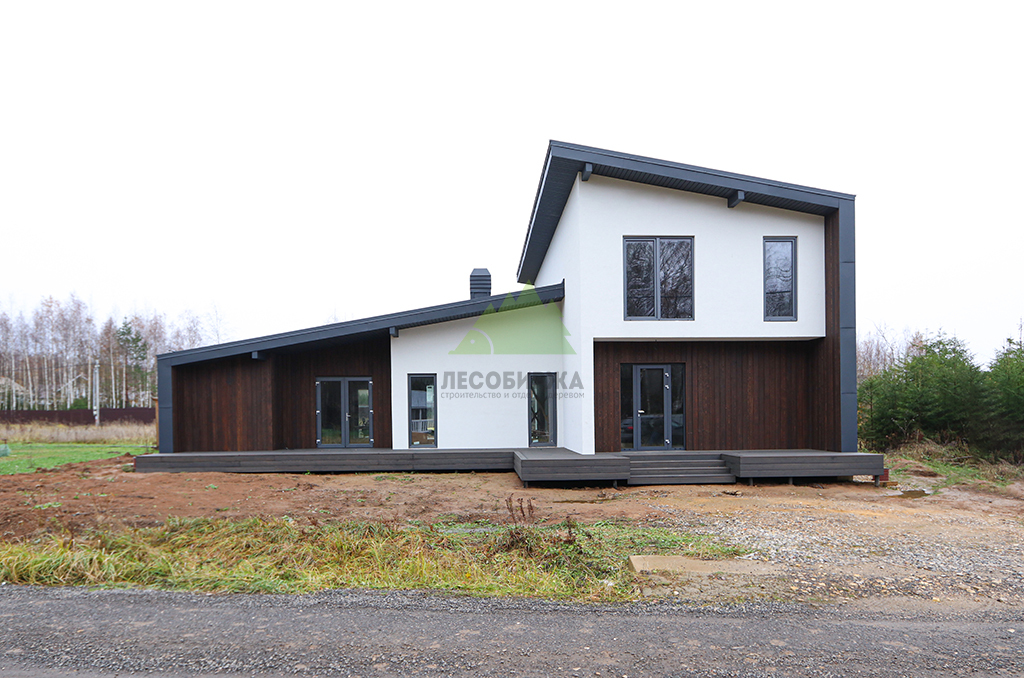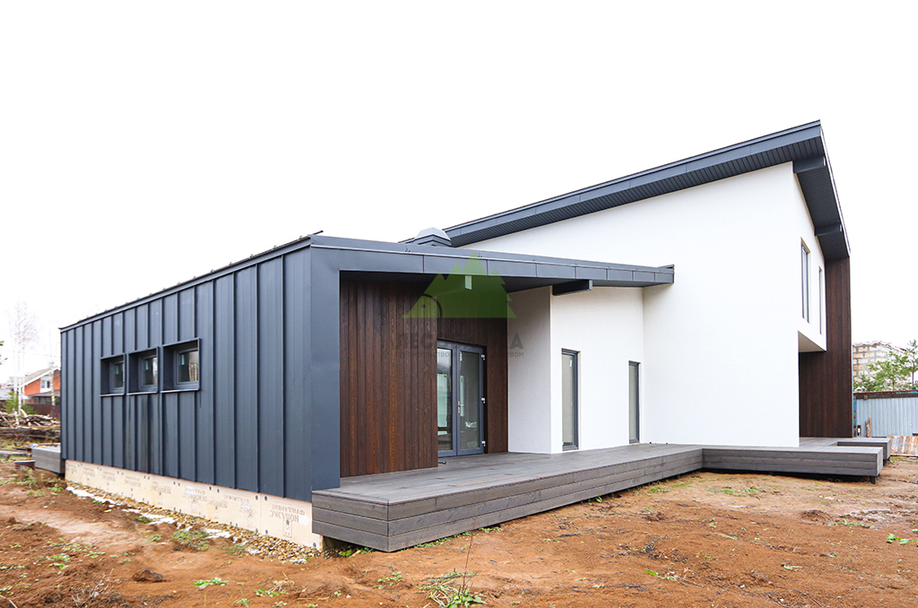 Особое внимание мы уделили этапу окрашивания древесины. Все фасадные элементы прошли профессиональную обработку в наших цехах, где на них было нанесено высококачественное гидромасло Renner M 300. Цеховое окрашивание — это гарантия идеального, равномерного покрытия, которое невозможно достичь при работе на объекте. Этот процесс не только подчеркнул уникальную текстуру сибирской лиственницы, выявляя всю ее премиальную фактурность, но и обеспечил максимальную защиту от ультрафиолета, влаги и грибка. Цветовое решение тщательно подбиралось по образцам заказчика, чтобы идеально вписать фасад в окружающий ландшафт и общую стилистику участка. В результате, в сочетании с элементами штукатурки и фальцевой кровли, мы получили эстетически безупречный комбинированный фасад, который придает дому особый характер и респектабельность.