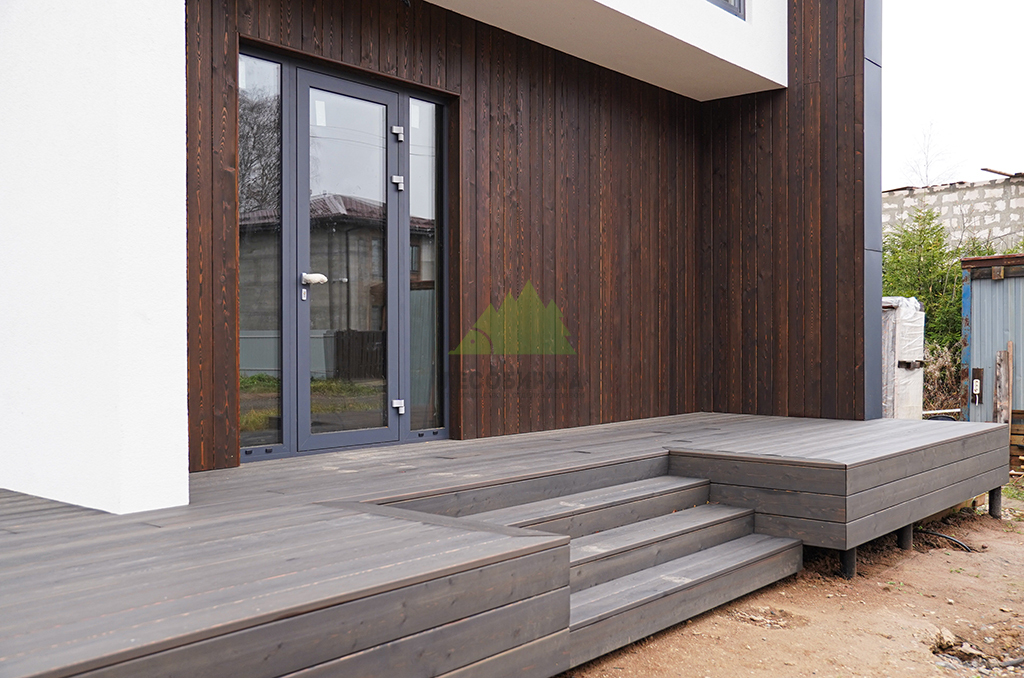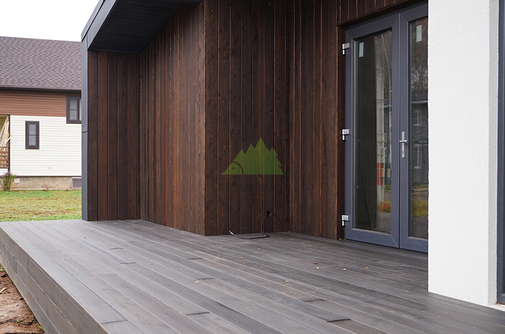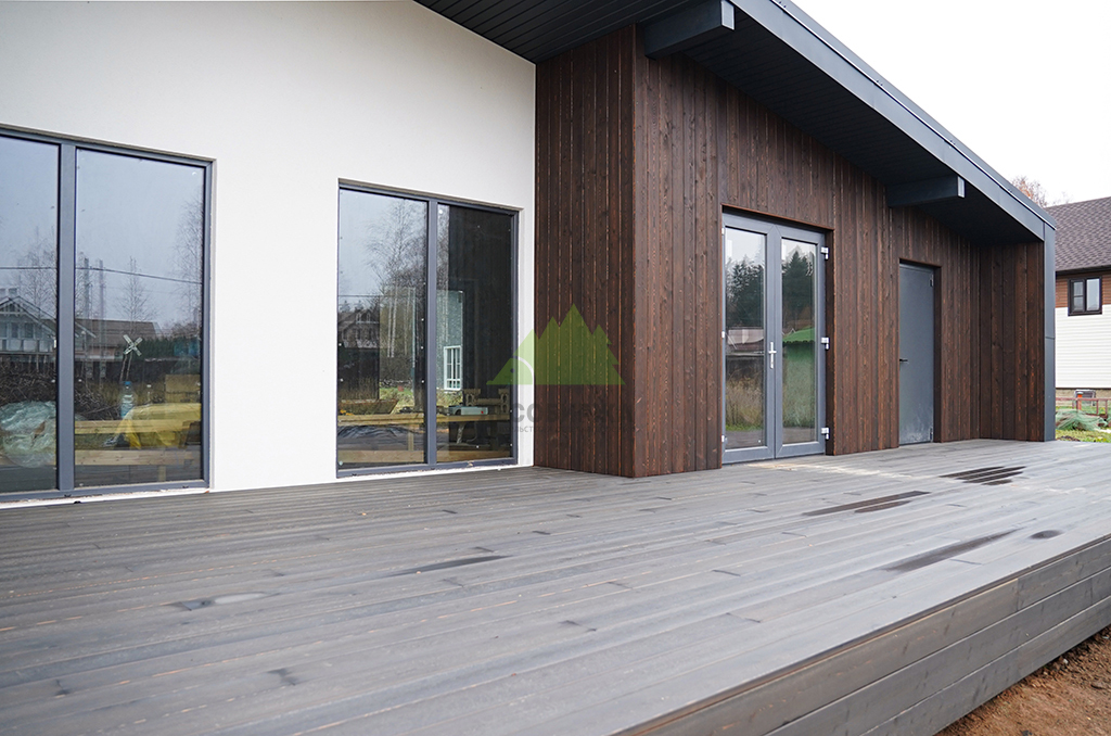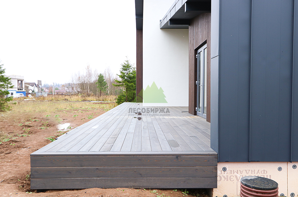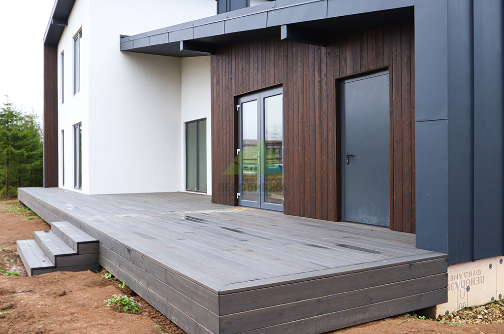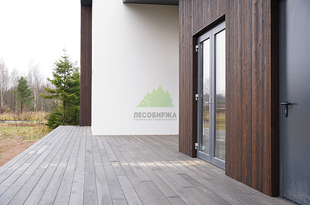 Настил и ступеньки для подъема на террасу выполнены из палубной доски сибирской лиственницы сорта АВ. Этот материал не только обладает превосходными прочностными характеристиками, способными выдерживать значительные нагрузки и интенсивную эксплуатацию, но и придает террасе исключительную эстетику. Палубная доска, как и фасадный планкен, прошла цеховое окрашивание элитным водорастворимым маслом Renner M300. Тщательный подбор цвета по индивидуальным образцам заказчика позволил создать единое, гармоничное пространство, где терраса стала логичным продолжением архитектуры дома. Она проходит по всей фасадной части здания, визуально расширяет его и создает идеальное место для отдыха на свежем воздухе. Техническая эстетика этого решения просто великолепна: дом с такой террасой выглядит более основательно, завершенно и невероятно привлекательно.