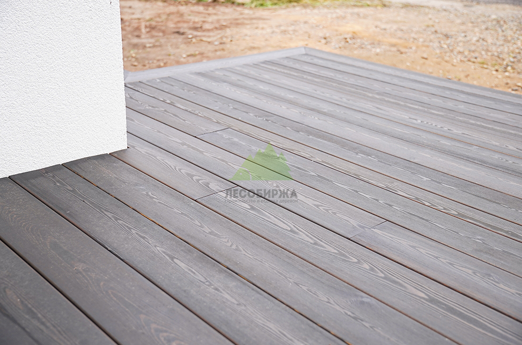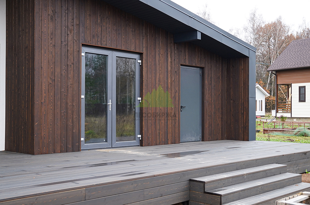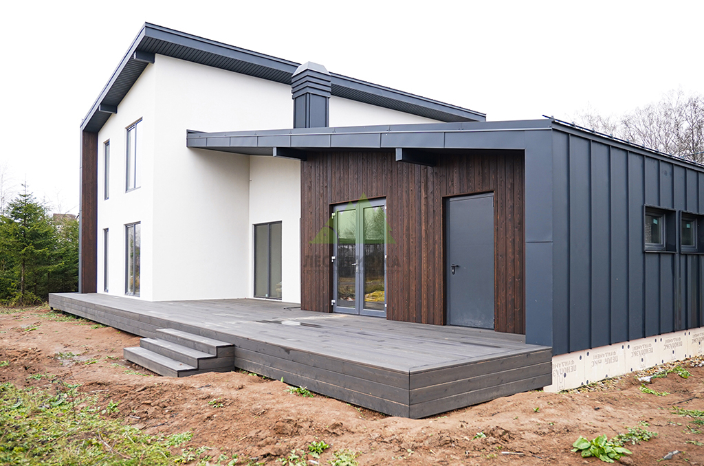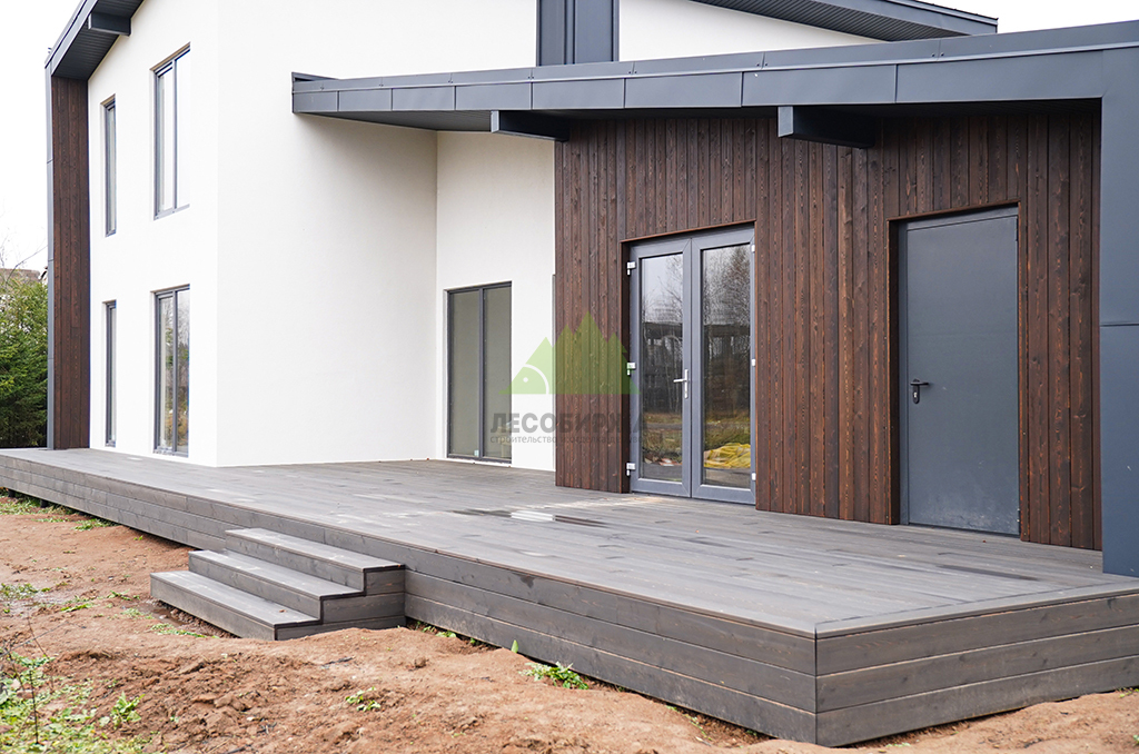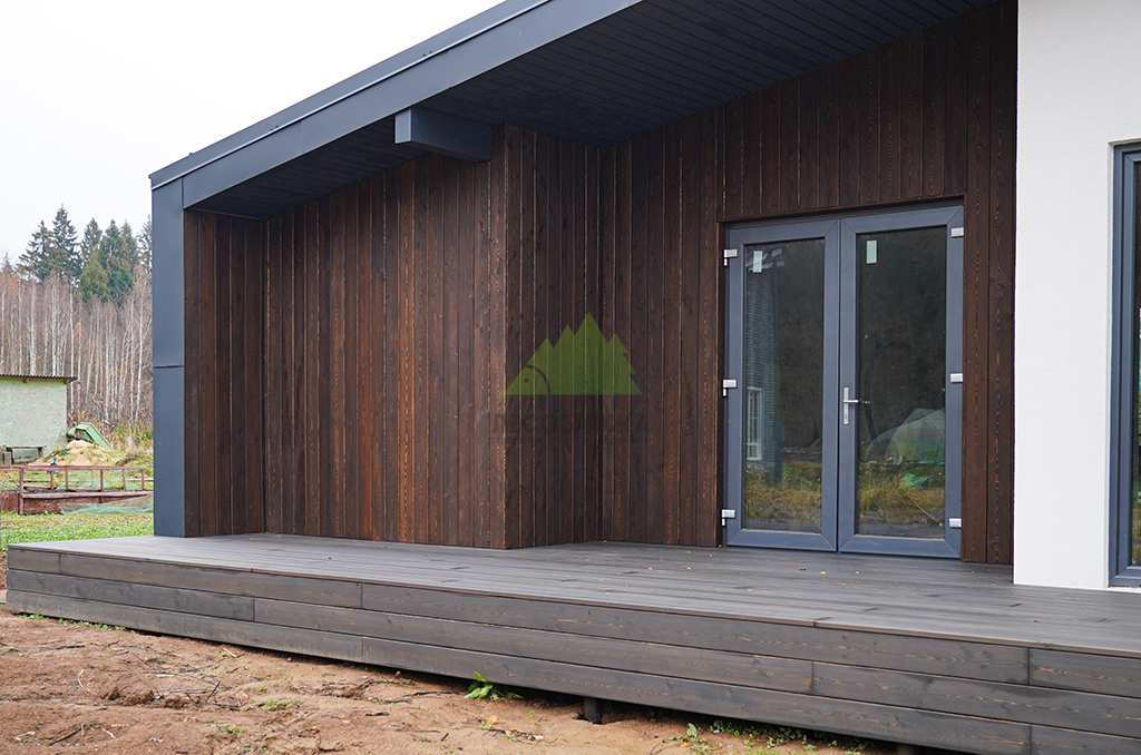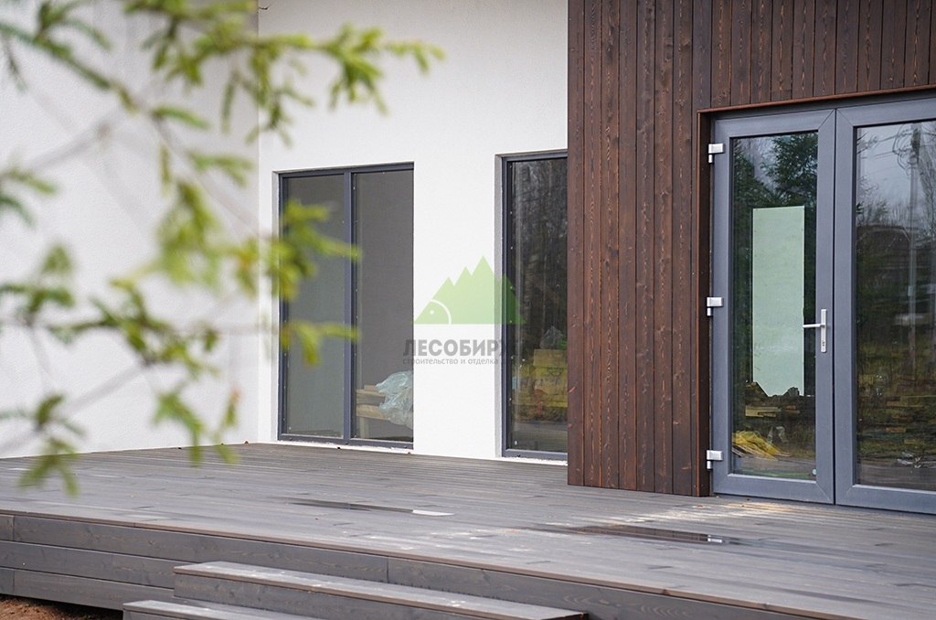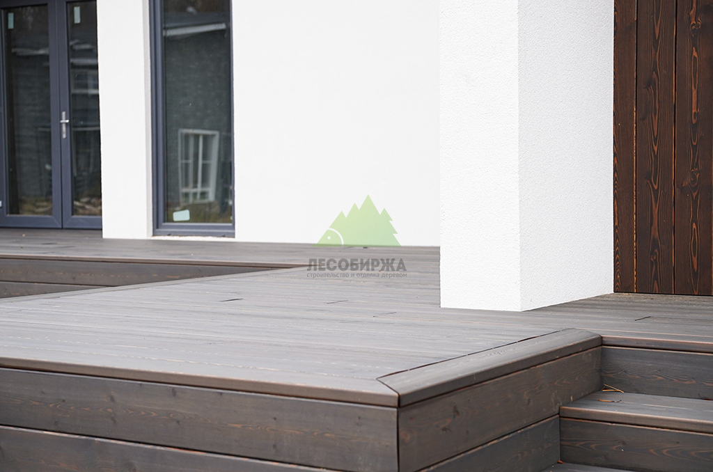 Настил и ступеньки для подъема на террасу выполнены из палубной доски сибирской лиственницы сорта АВ. Этот материал не только обладает превосходными прочностными характеристиками, способными выдерживать значительные нагрузки и интенсивную эксплуатацию, но и придает террасе исключительную эстетику. Палубная доска, как и фасадный планкен, прошла цеховое окрашивание элитным водорастворимым маслом Renner M300. Тщательный подбор цвета по индивидуальным образцам заказчика позволил создать единое, гармоничное пространство, где терраса стала логичным продолжением архитектуры дома. Она проходит по всей фасадной части здания, визуально расширяет его и создает идеальное место для отдыха на свежем воздухе. Техническая эстетика этого решения просто великолепна: дом с такой террасой выглядит более основательно, завершенно и невероятно привлекательно.