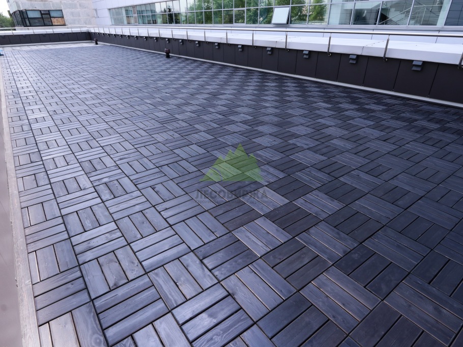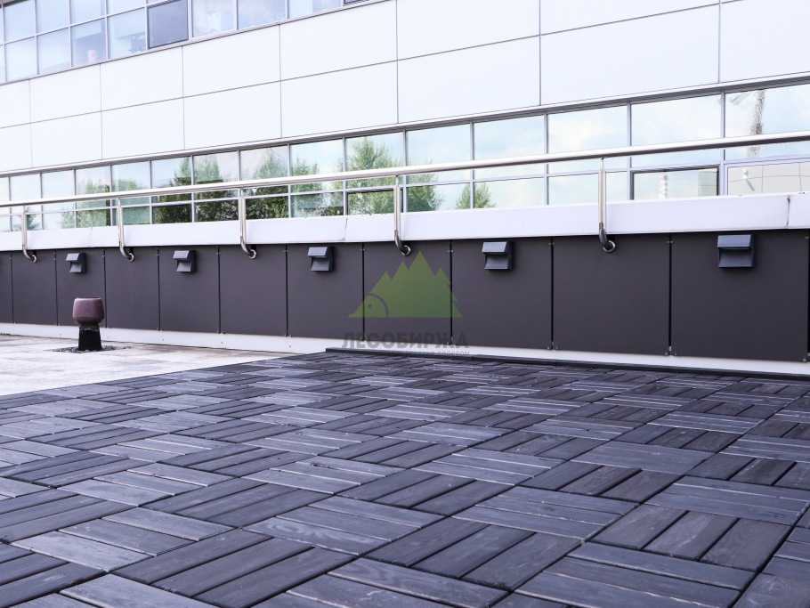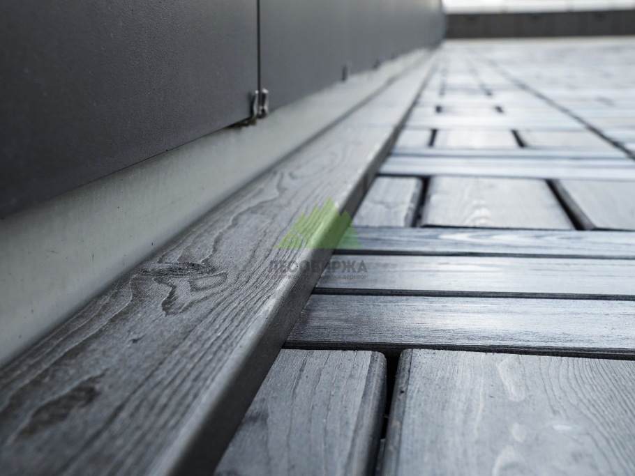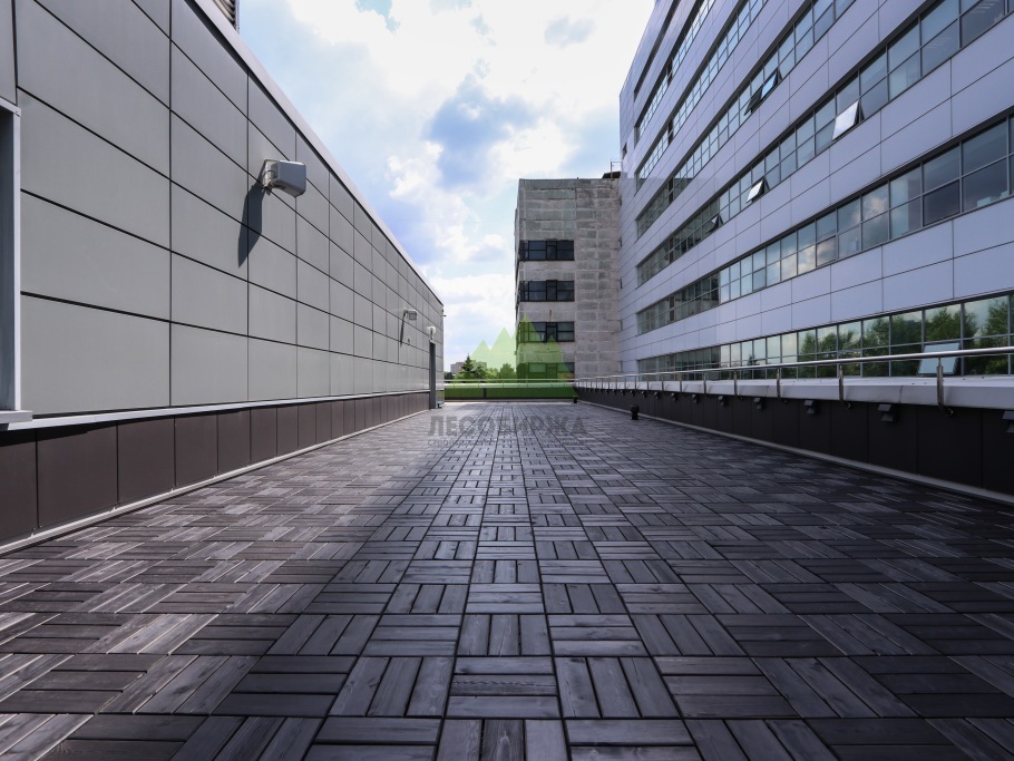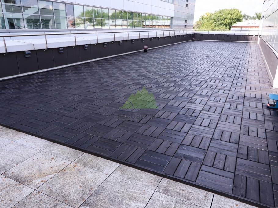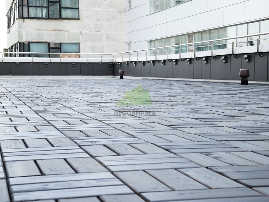Монтаж модулей на эксплуатируемой кровле – это процесс, требующий точности и аккуратности. Наши мастера укладывали их непосредственно на подготовленную бетонную стяжку, обеспечивая идеальное прилегание и ровность поверхности. Важным элементом монтажа является система крепления "шип-паз", благодаря которой модули надежно соединяются между собой, образуя единое, прочное и стабильное покрытие. Эта система исключает смещение элементов и образование щелей, гарантируя долговечность и безопасность эксплуатации террасы. По периметру крыши, а также в зонах примыкания к парапету и участкам с керамогранитным покрытием, модули были дополнительно поджаты специальными планками из термированной сосны. Это решение не только придает завершенность и эстетичность всей конструкции, но и выполняет важную функциональную роль, надежно фиксируя крайние элементы и предотвращая их деформацию или смещение в процессе эксплуатации. Такой подход обеспечивает безупречный внешний вид и максимальную надежность покрытия.