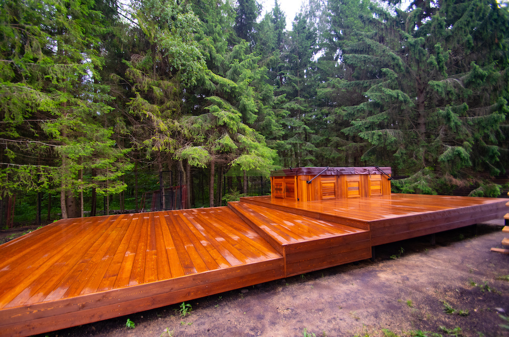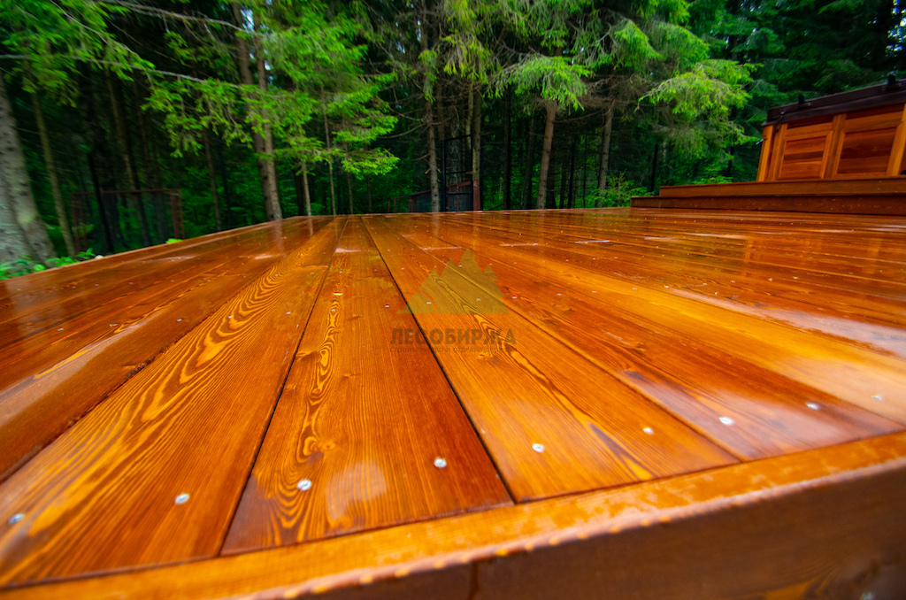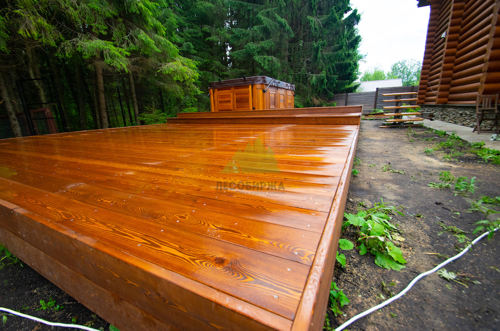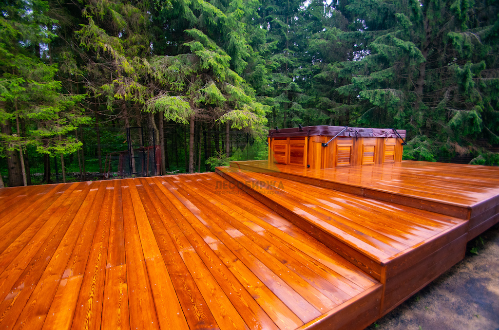 Идеальным решением, которое мы предложили и успешно реализовали, стала палубная доска из сибирской лиственницы сорта "Прима". Лиственница по праву считается одним из лучших материалов для наружных конструкций. Её уникальная плотность, высокое содержание смол и природная устойчивость к влаге делают её практически неуязвимой для гниения, насекомых и атмосферных воздействий. Она прекрасно переносит как сильные морозы, так и летний зной, обильные осадки и интенсивную эксплуатацию. Даже наличие купели, предполагающей постоянное присутствие воды, не представляет для лиственницы проблемы.