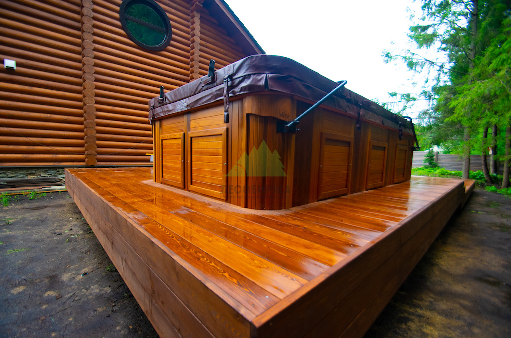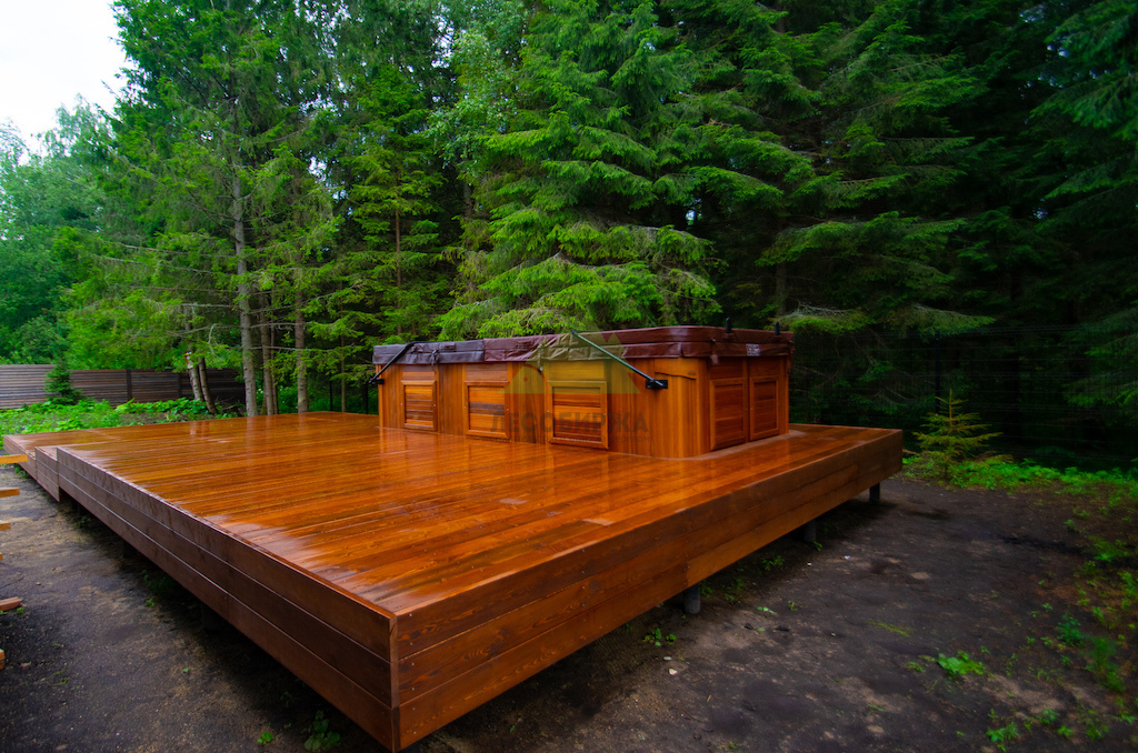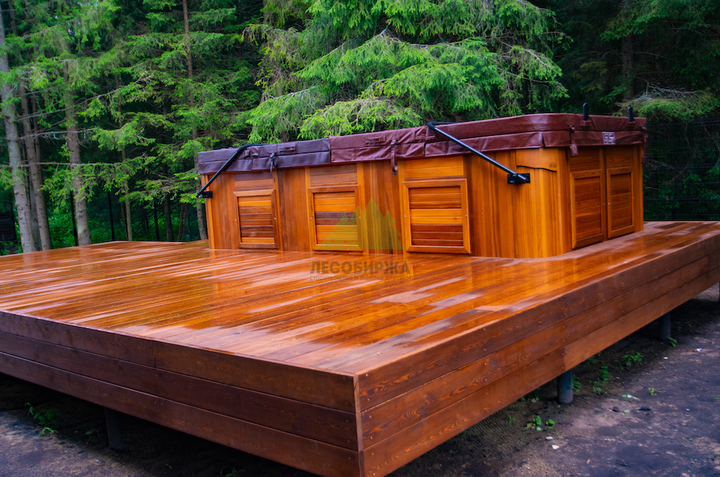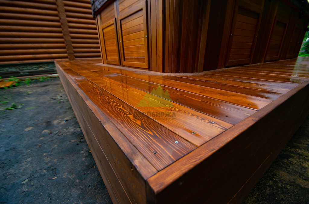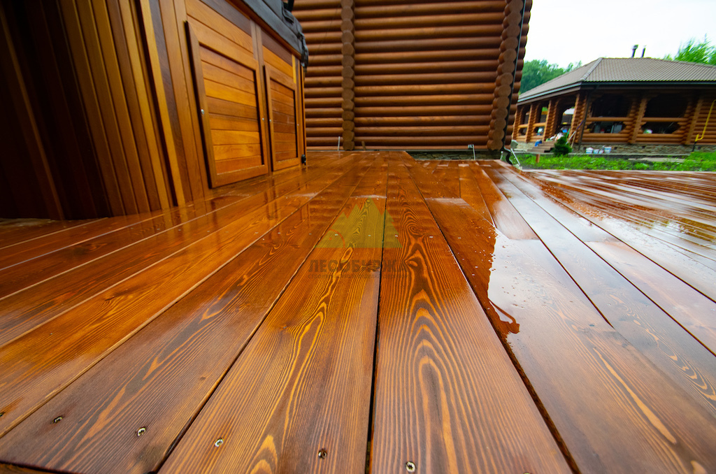 Идеальным решением, которое мы предложили и успешно реализовали, стала палубная доска из сибирской лиственницы сорта "Прима". Лиственница по праву считается одним из лучших материалов для наружных конструкций. Её уникальная плотность, высокое содержание смол и природная устойчивость к влаге делают её практически неуязвимой для гниения, насекомых и атмосферных воздействий. Она прекрасно переносит как сильные морозы, так и летний зной, обильные осадки и интенсивную эксплуатацию. Даже наличие купели, предполагающей постоянное присутствие воды, не представляет для лиственницы проблемы.