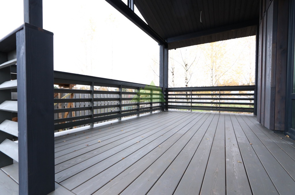 Для настила террасы и обшивки ступеней была выбрана палубная доска из сибирской лиственницы сорта АВ. Это решение неслучайно, ведь сибирская лиственница по праву считается одним из наиболее устойчивых к внешним воздействиям материалов. Благодаря высокой плотности и содержанию природных смол, она не боится влаги, перепадов температур и вредителей, что особенно актуально для нашего региона. Со временем древесина лиственницы только набирает прочность, приобретая благородный оттенок и уникальный характер. Наши мастера гарантируют безупречную укладку, которая обеспечит не только эстетичный вид, но и долговечность конструкции.