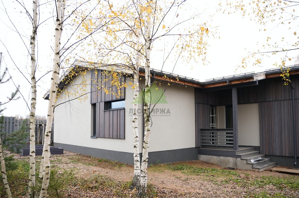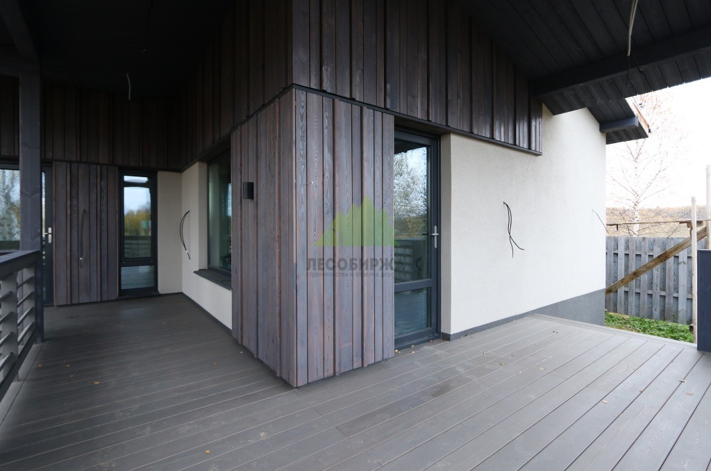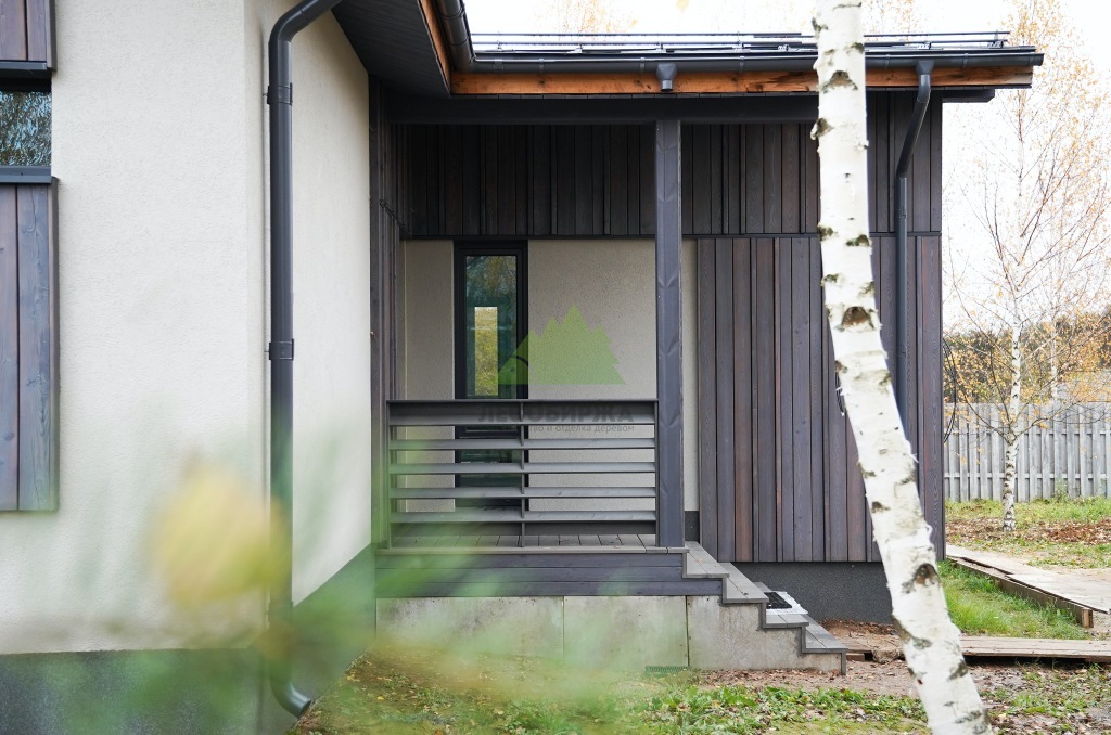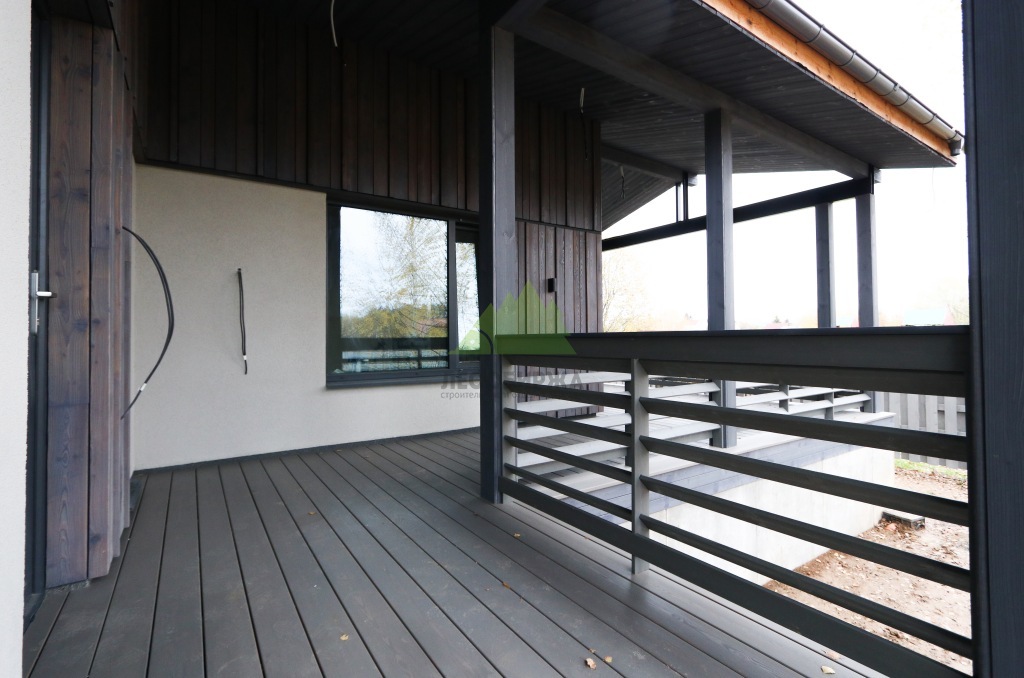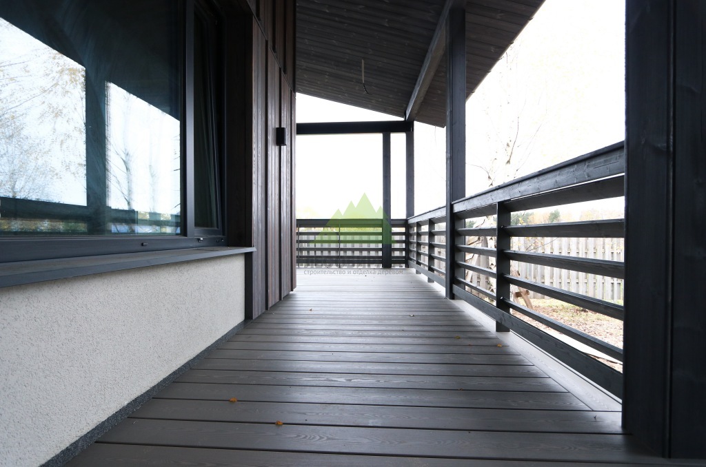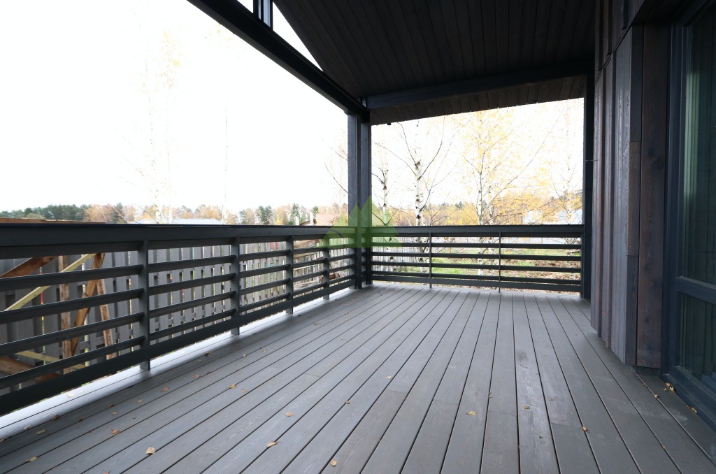 Особой изюминкой проекта стали ограждения террасы. Изготовленные в собственном столярном цехе "Лесобиржи-СПб", они выполнены из прямого планкена северной сосны сорта АВ, окрашенного маслом "Renner" М300 в цвет RAL 7006. Уникальный дизайн ограждений, с диагональным расположением планкена, напоминающим жалюзи, придает конструкции легкость и воздушность. Большое расстояние между элементами делает ограждения визуально невесомыми, не перегружая пространство, но при этом обеспечивая необходимую безопасность и приватность. Такая продуманная геометрия ограждений стала ярким акцентом, подчеркивающим индивидуальность проекта.