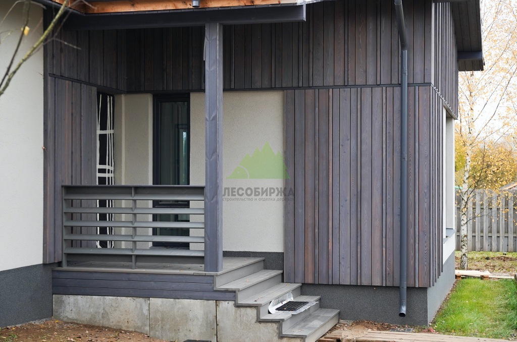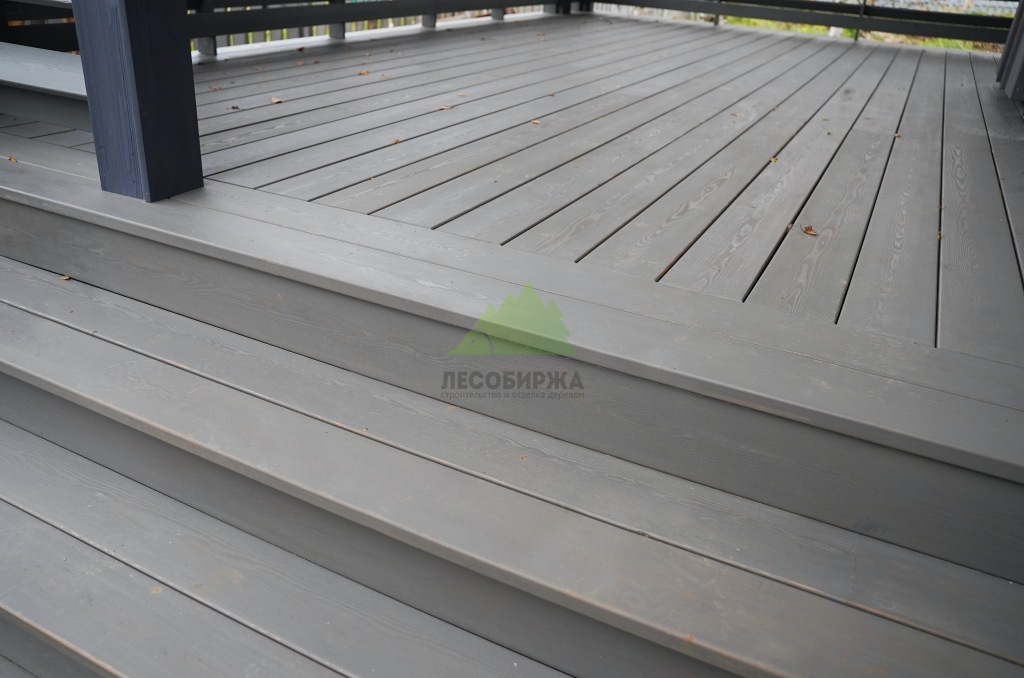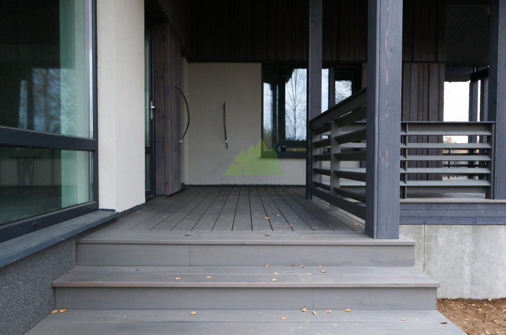 Особое внимание уделили входной группе. Была сооружена прочная бетонная лестница, которая затем была тщательно обшита той же палубной доской из лиственницы, что и основной настил террасы. Это обеспечило единство стиля и материалов, создав ощущение цельности и завершенности. Единый цвет настила и ступеней делает переход от дома к террасе плавным и гармоничным, подчеркивая продуманность каждой детали.
