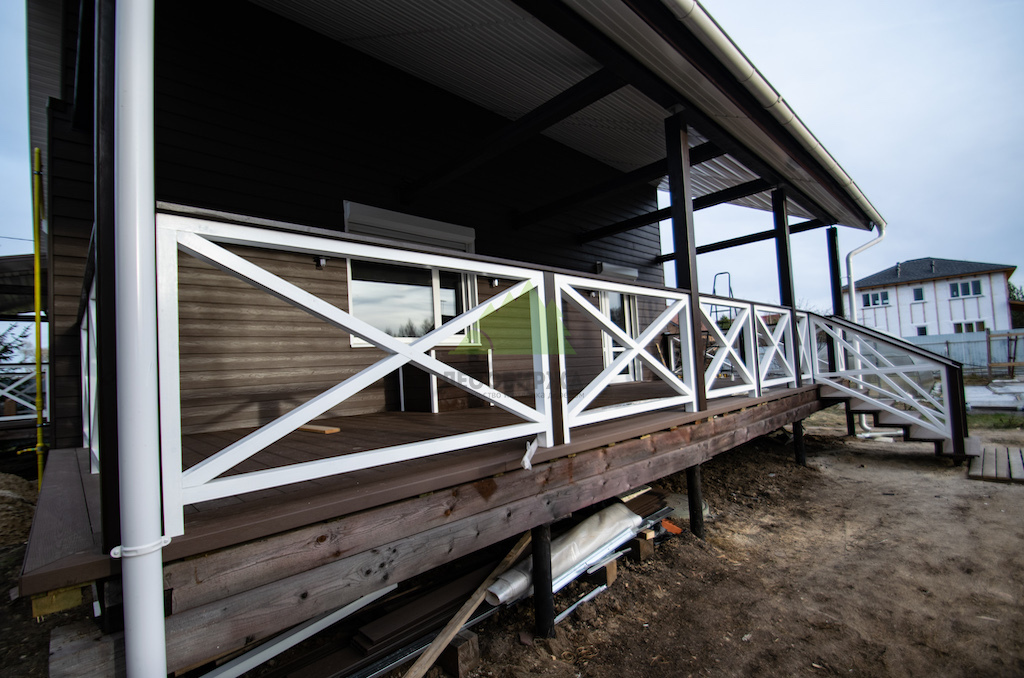 Одним из важнейших элементов любой террасы являются ограждения. В нашем производственном цеху специалисты Лесобиржи-Спб изготовили ограждения, которые были покрашены в тщательно подобранные тона, гармонирующие как с цветом дома, так и с "шоколадной" террасой, с чередованием белых и коричневых элементов. Такой подход позволяет создать единый, завершенный архитектурный ансамбль, подчеркивающий стиль объекта. Материал ДПК, благодаря своим свойствам, разрешен к применению в регионах с самым разнообразным климатом, от жаркого до очень холодного, что подтверждает его надежность для условий Ленинградской области. Он не поддерживает горение и распространение огня, что является весомым фактором для безопасности проживающих. А его нескользящая поверхность, даже без специальных добавок, делает его идеальным выбором для зон, подверженных влаге.