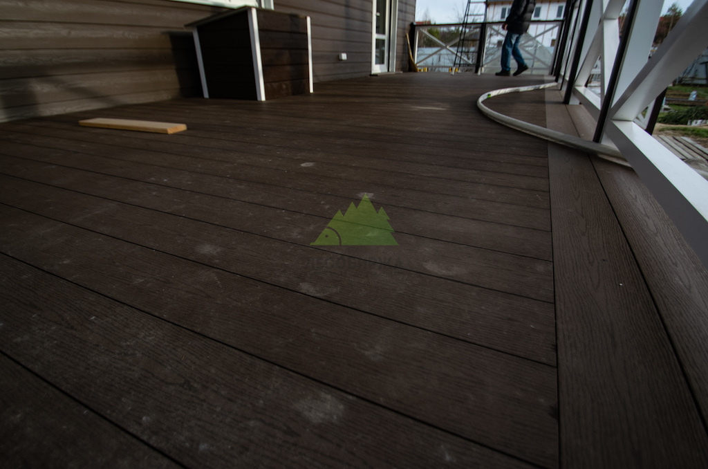 Укладка террасной доски осуществлялась с использованием скрытых фасадных кляймеров. Подобные системы крепления, аналогичные используемым для монтажа панелей Cedral, позволяют значительно сократить время работ и обеспечивают идеально ровную и эстетически безупречную поверхность без видимых элементов крепежа. Настил из ДПК, закрепленный таким образом, способен выдерживать значительные механические нагрузки и сохранять свой первозданный вид на протяжении многих лет, без риска появления ржавых разводов на поверхности. Дополнительным преимуществом ДПК является простота работы с ним: распиливание и сверление проходили без каких-либо затруднений, что ускорило процесс и гарантировало точность каждого элемента.