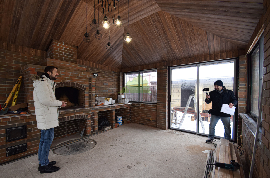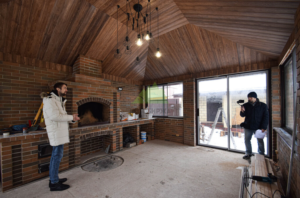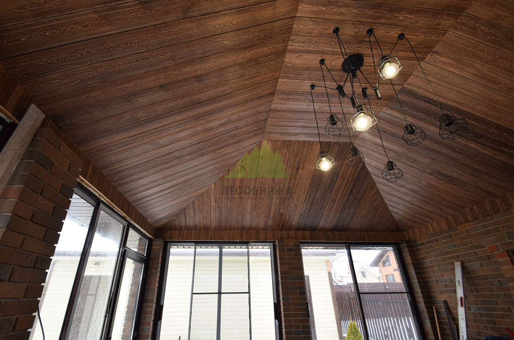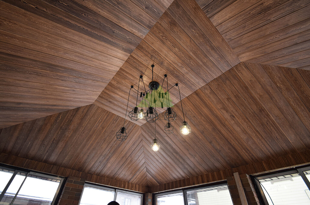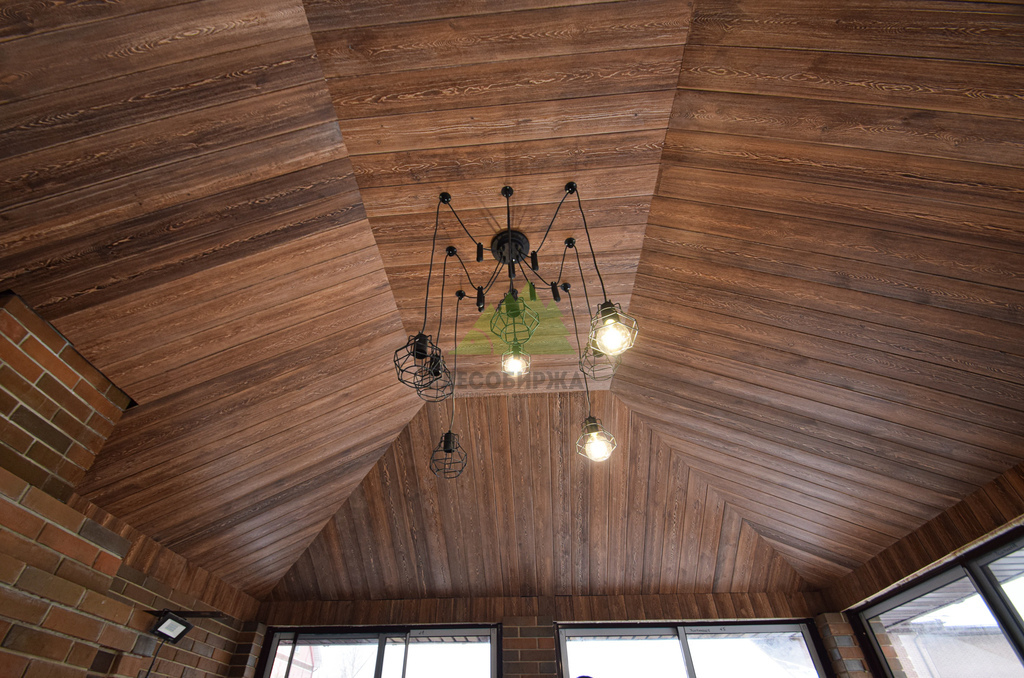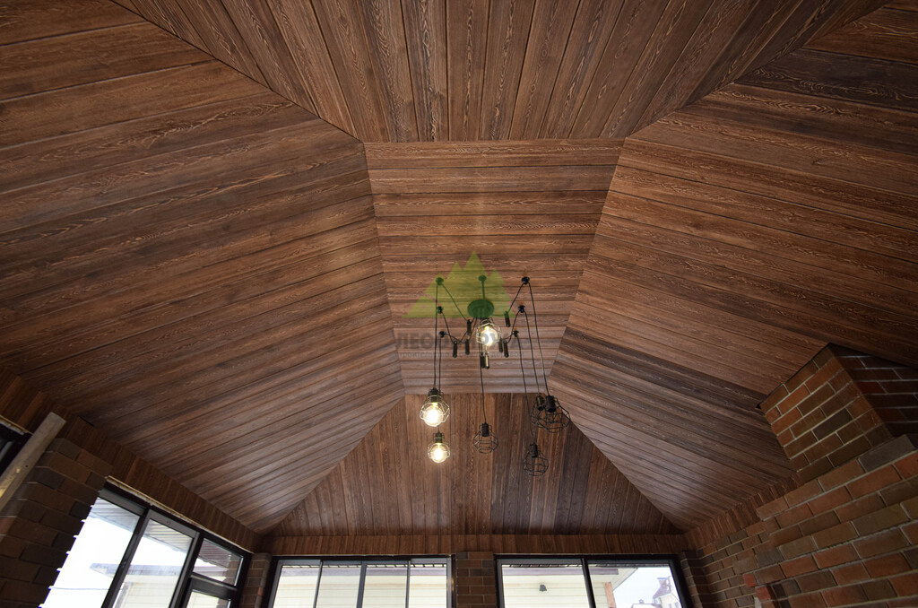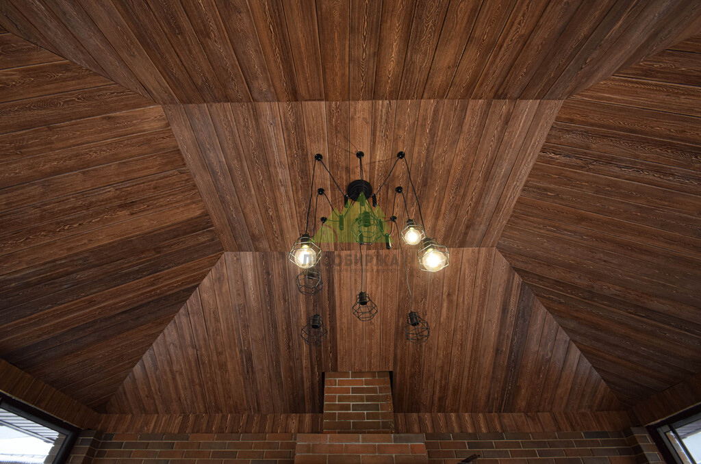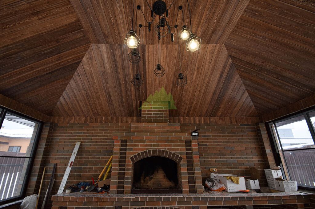 Заказ на отделку беседки поступил к нам из коттеджного поселка Ольшаники-2, где мы смогли создать не просто функциональное пространство, а настоящую архитектурную жемчужину. Это строение превзошло все ожидания. Перед нами предстала не просто беседка, а полноценная малая архитектурная композиция с панорамным остеклением и стеклянной раздвижной дверью, наполняющей пространство светом и воздухом. В центре интерьера – массивная, искусно сложенная печь, напоминающая произведение искусства. Ее кирпичная кладка, выполненная в насыщенных красновато-коричневых тонах, послужила отправной точкой для наших колористов и мастеров малярного цеха при выборе идеального оттенка для потолочной вагонки. Потолок беседки заслуживает особого внимания: он имеет сложную, "ломаную" форму, создающую эффект небольшого купола. Эта многоуровневая конструкция, состоящая из трапециевидных боковых сегментов и центрального прямоугольника, придала помещению уникальный, выразительный характер. Для его обшивки была выбрана вагонка из ангарской сосны сорта АВ(В).