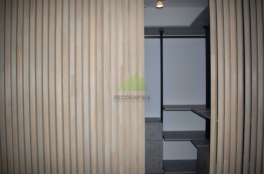 5. Звукоизоляционные свойства: Древесина, даже в виде реечных конструкций, обладает определенными звукопоглощающими свойствами, что способствует созданию более комфортной акустики в зонированном пространстве, делая гардеробную более уединенной.