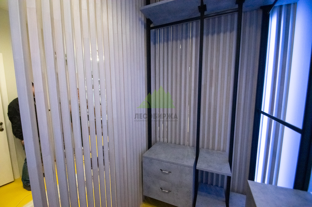 Итоговая перегородка для гардеробного помещения и реечное зонирование кухни удались на славу! Грамотно подобранный угол наклона реек позволил беспрепятственно пропускать как электрический, так и естественный дневной свет, сохраняя ощущение простора и не затемняя помещение. При этом, при взгляде на перегородку из основной части студии, она создает эффект цельной, но легкой конструкции, ненавязчиво скрывая происходящее за ней. Зато человек, находящийся в гардеробной, сохраняет ощущение связи с остальным пространством, не чувствуя себя запертым, благодаря продуманному расстоянию между рейками. Для максимального удобства клиентки, в гардеробную были установлены функциональные шкафы и стеллажи для хранения одежды и обуви, превратив ее в полноценную и комфортную зону. Проект стал ярким примером того, как с помощью деревянных перегородок можно кардинально улучшить эргономику и эстетику жилого пространства, подарив клиенту истинное удовольствие от обновленного интерьера.