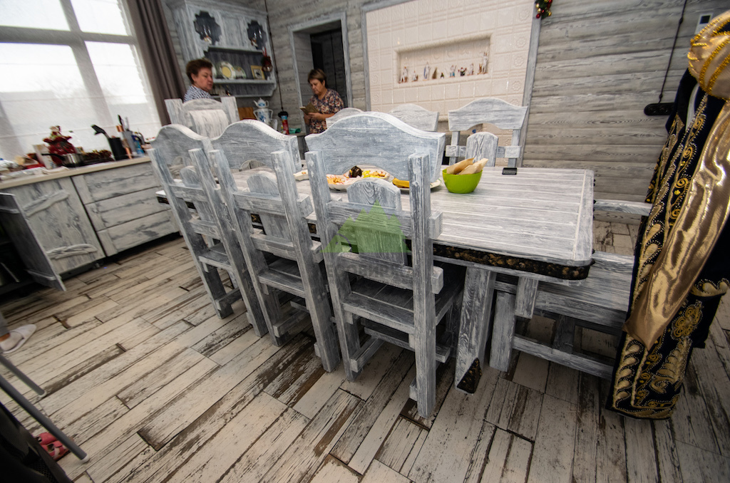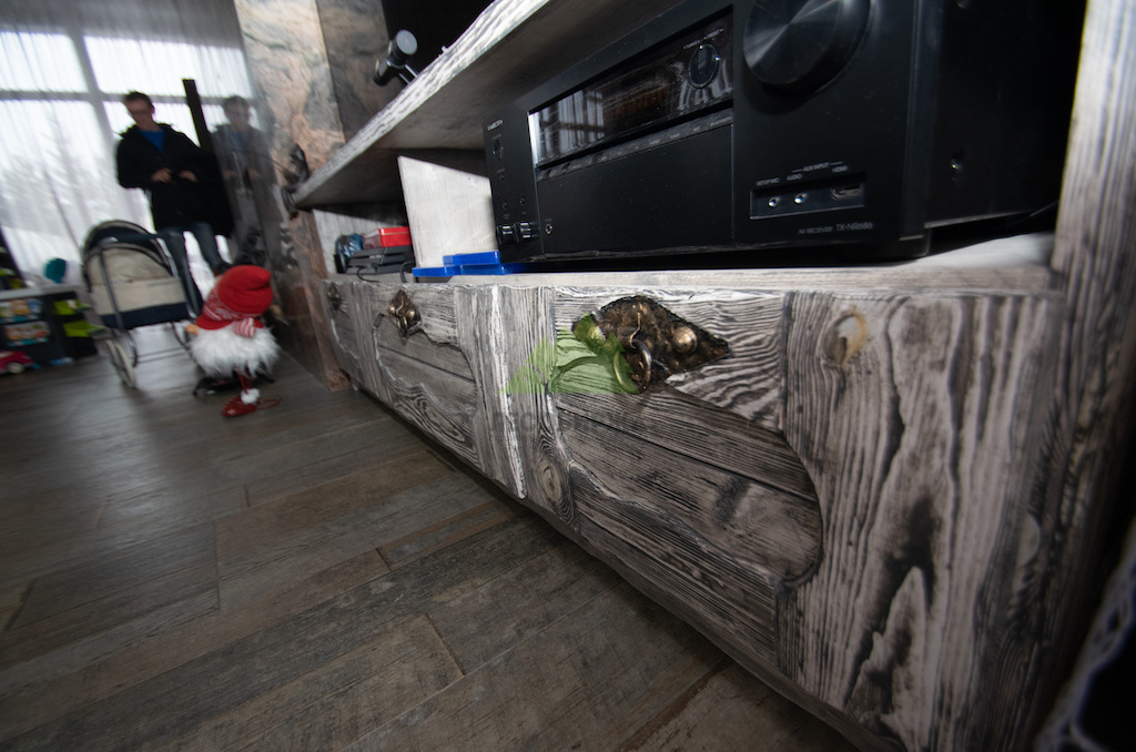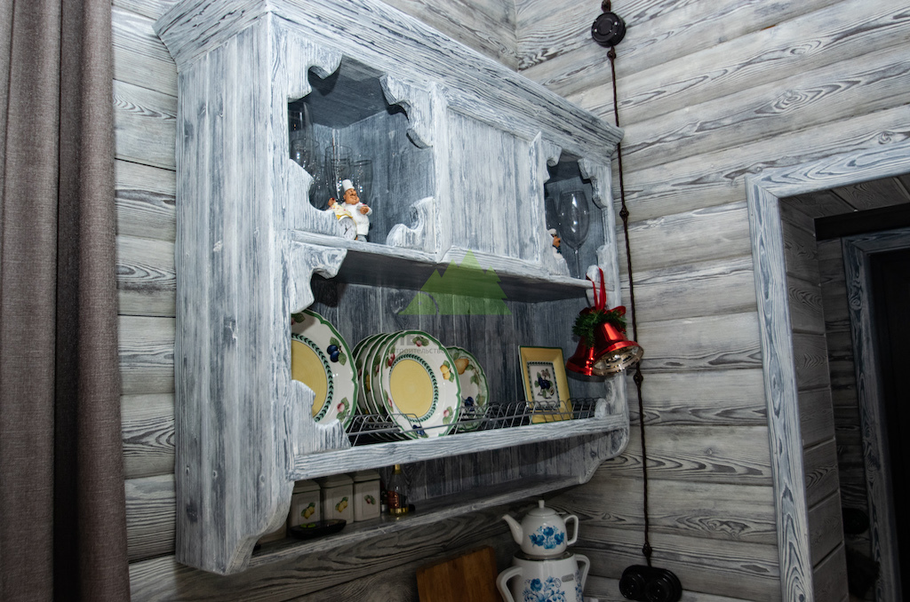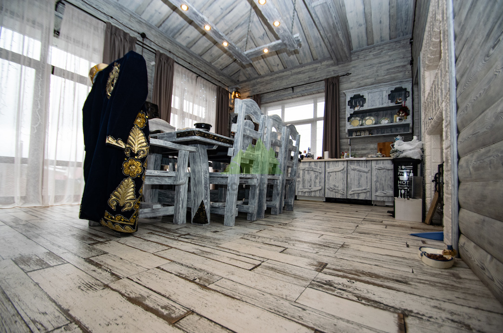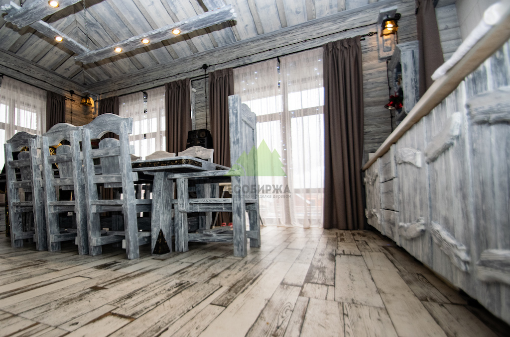 Использование светлой и темной эмали в сочетании с мастерством наших колористов позволяет нам достигать желаемых винтажных оттенков, имитируя естественное старение дерева. Дерево, обработанное таким образом, всегда выглядит изысканно и благородно, оно прекрасно "уживается" с керамикой, кирпичом и камнем, дополняя друг друга и создавая цельный, гармоничный ансамбль, как это и было реализовано при отделке комнаты отдыха.