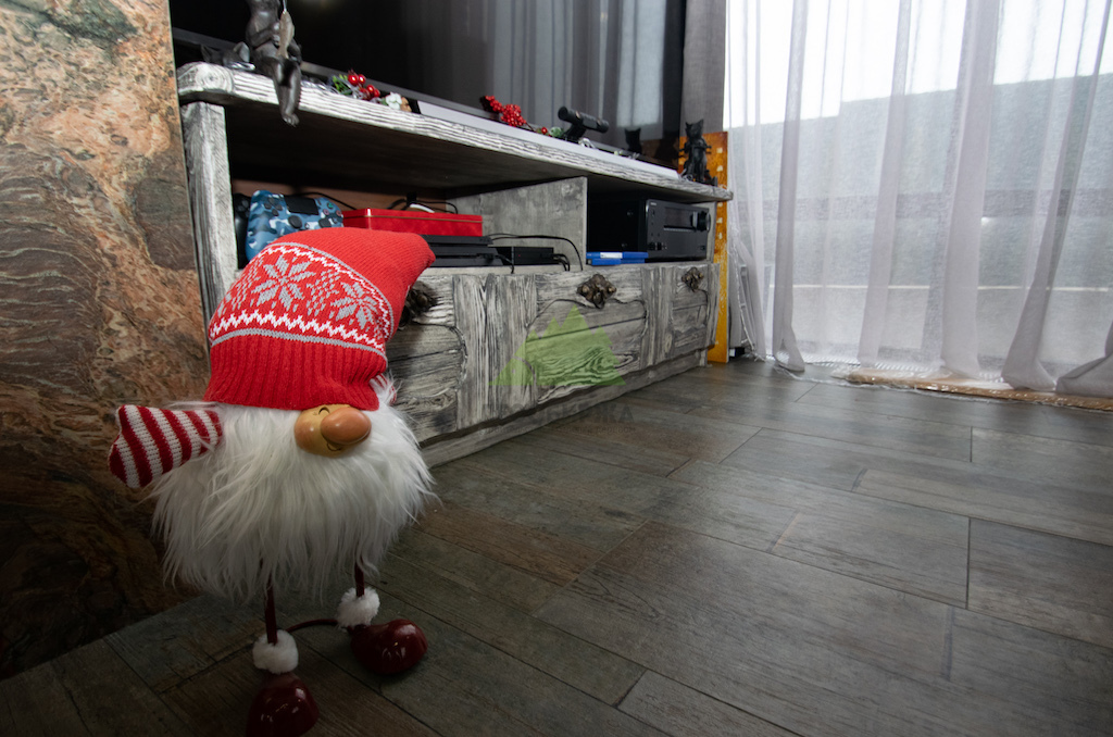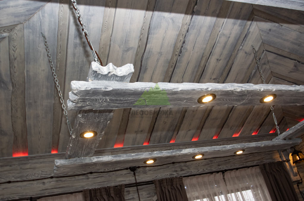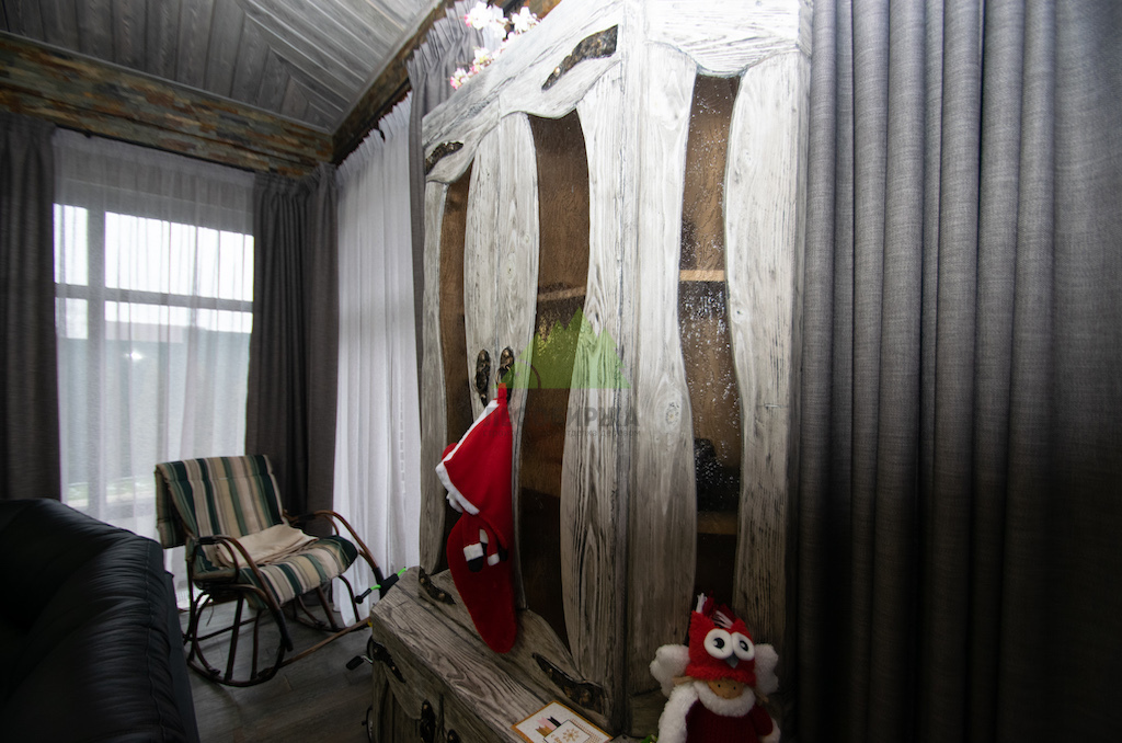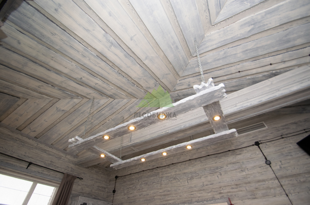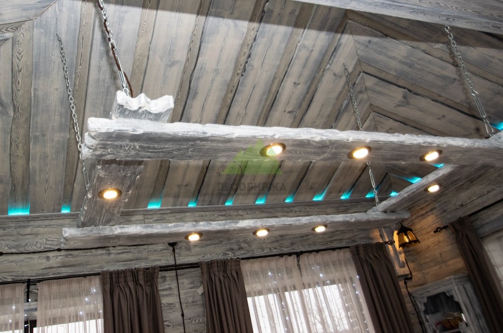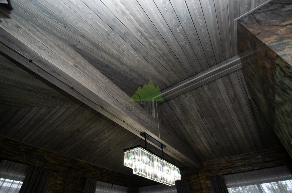 Для потолка мы разработали особенное решение — слэбы. Это продольно распиленные цельные части древесины, которые в интерьере выступают как самодостаточные и впечатляющие изделия. Такой способ распила позволяет максимально раскрыть всю красоту и благородство дерева, его неповторимый рисунок, богатую палитру оттенков и величественную мощь. При обработке слэбов мы стремились сохранить все особенности ствола: его естественные неровности, сучки, уникальные контуры, подчеркивая их природную красоту. Эти слэбы также были обработаны по технологии "Зимняя Сказка", что идеально вписалось в общую концепцию винтажного дома. Монтаж слэбов проводился внахлест, а в местах примыкания к стенам были установлены дополнительные стильные светильники, создающие мягкую подсветку и усиливающие эффект.