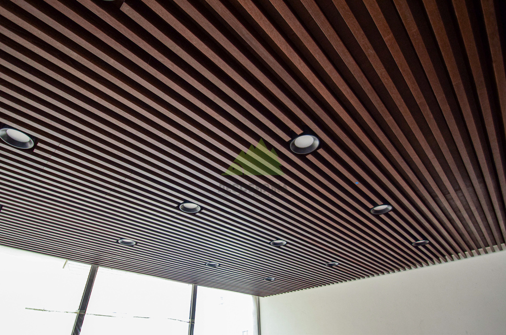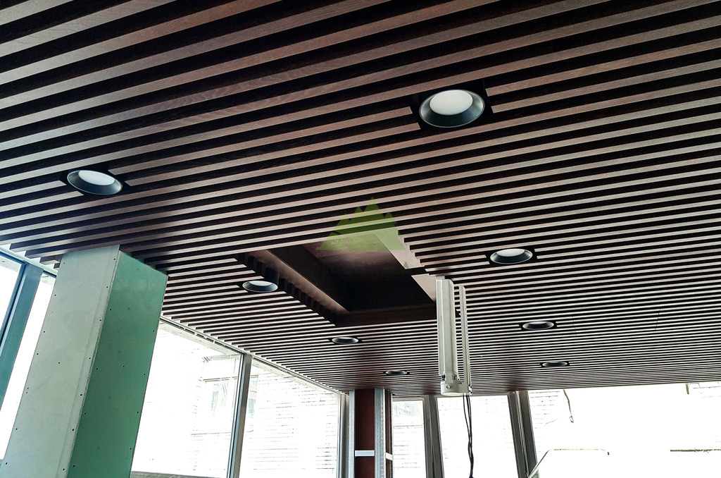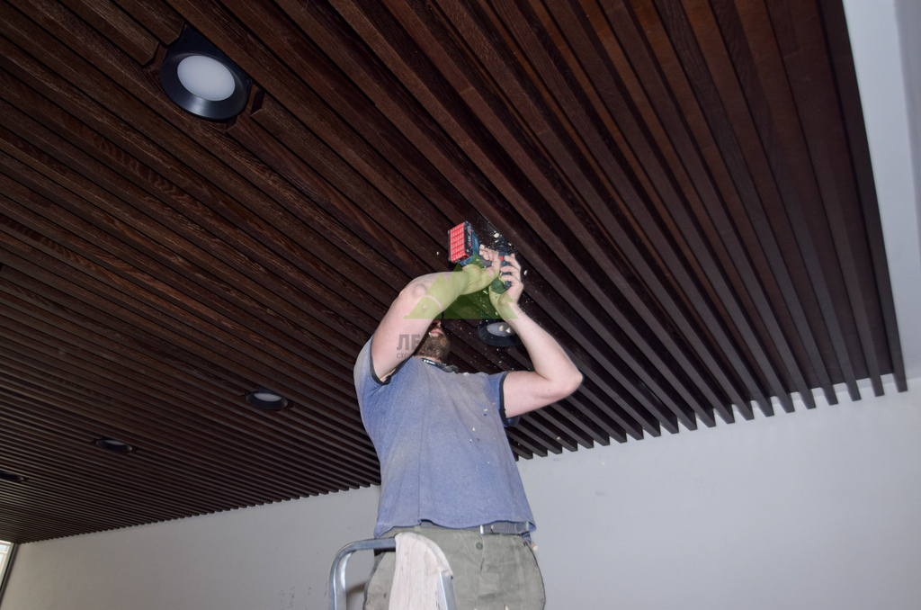 Следующим шагом стало обустройство основания для потолка. Для этого была использована высококачественная фанера, прошедшая специальную обработку и окрашенная на производстве по лаковой схеме ТМ-1515. Выбор производственной окраски не случаен: она обеспечивает идеально равномерное покрытие, высокую стойкость к истиранию и воздействию влаги, а также глубокий, насыщенный цвет, который невозможно добиться при ручной покраске на объекте. Эта фанера служила не только прочным основанием, но и важным элементом акустической системы и эстетики, создавая контраст или гармонию с будущими баффелями. Наши мастера обеспечили безупречную установку каждого листа, минимизируя стыки и создавая монолитную поверхность. Это требовало не только опыта, но и аккуратности, ведь качество этого слоя напрямую влияет на восприятие готового потолка.