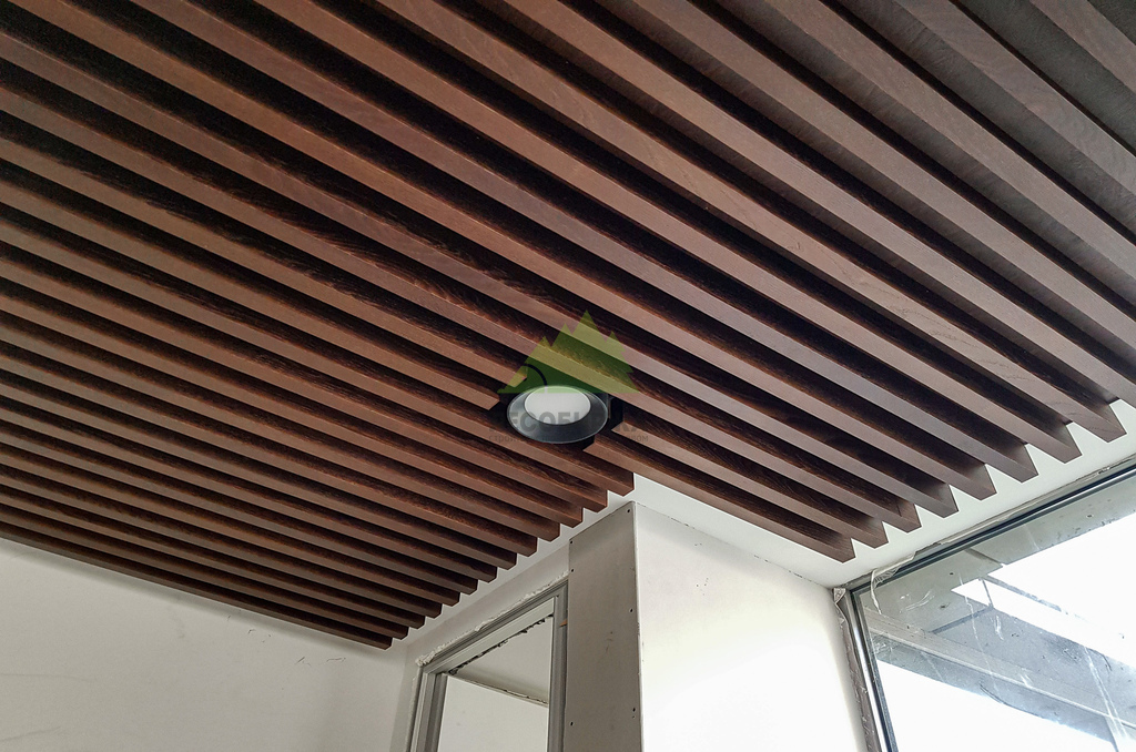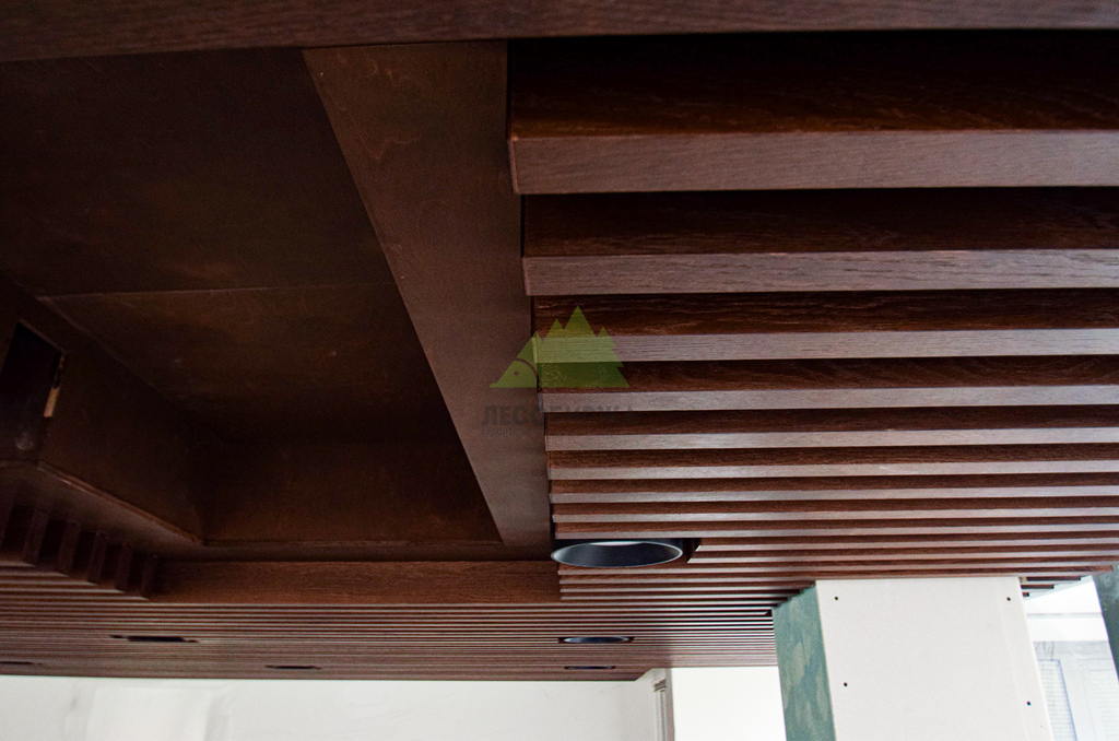 Кульминацией проекта стало изготовление и монтаж самих баффелей. Для их производства мы выбрали МДФ, шпонированный натуральным дубом – материалом, который сочетает в себе стабильность и доступность МДФ с благородством и уникальной текстурой дуба. Производство баффелей осуществлялось на нашем собственном современном оборудовании, что позволило достичь исключительной точности размеров и идеальной обработки каждого элемента. Шпон дуба был тщательно отобран, чтобы обеспечить равномерность рисунка и цветового оттенка, придавая потолку ощущение роскоши и естественной красоты. Финишная обработка баффелей производилась на производстве с использованием состава Magma. Этот высококачественный состав придал поверхности баффелей глубокий матовый или полуглянцевый блеск (в зависимости от согласованного с клиентом варианта), повысил их износостойкость и защитил от внешних воздействий, таких как ультрафиолет и механические повреждения. Преимущества производственной окраски с использованием Magma очевидны: это не только безупречный внешний вид, но и долговечность, устойчивость к выцветанию и простота в уходе. Такой подход позволил создать баффели, которые не только выглядят эффектно, но и прослужат долгие годы, сохраняя свой первоначальный вид.