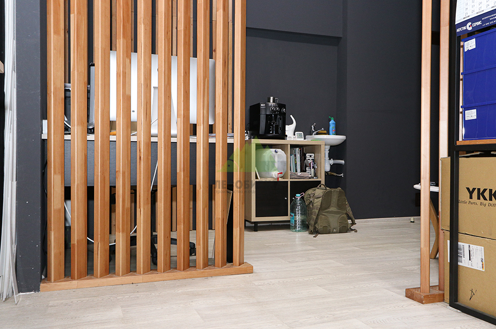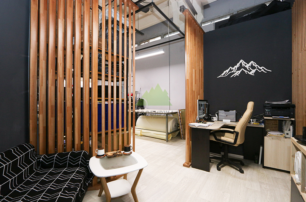 В результате плодотворного диалога был выбран оптимальный материал – высококачественная хвоя. Выбор хвойных пород обусловлен несколькими факторами: это отличная прочность, подтвержденная долговечность и, что немаловажно, привлекательная стоимость. Кроме того, древесина хвойных пород обладает приятной текстурой и натуральным ароматом, создавая уютную и благоприятную атмосферу в помещении. Наши дизайнеры разработали несколько конфигураций расположения реек, чтобы максимизировать функциональность зонирования и придать интерьеру динамичный, современный вид. Предложенный нами вариант зонирования не только четко разделил зоны для раскроя, пошива и хранения материалов, но и визуально расширил пространство, добавив ему легкости и воздушности.