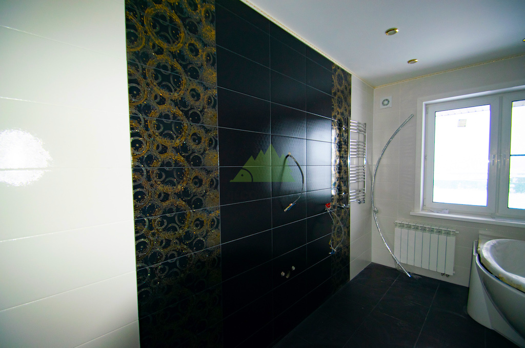 - Выравнивание и подготовка поверхностей: Стены были выровнены с помощью влагостойких гипсоволокнистых листов (ГВЛВ) или цементно-стружечных плит (ЦСП), которые обладают отличной устойчивостью к влаге и обеспечивают прочное основание для плитки. Наши мастера добивались идеальной плоскости и вертикали, используя лазерные нивелиры, что является залогом качественной укладки.
