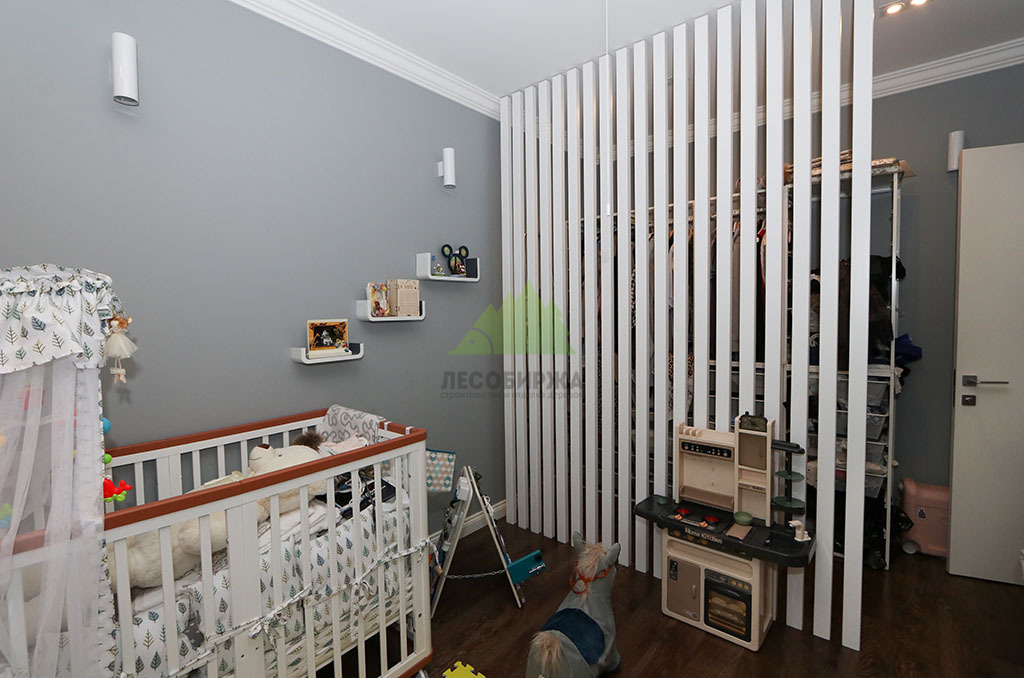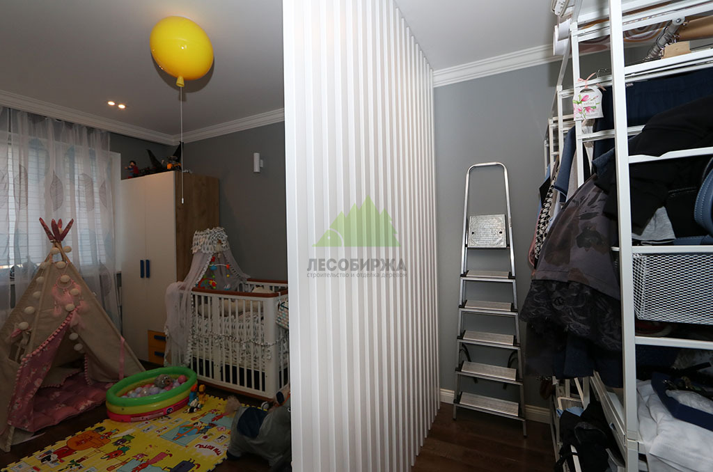 Перед нами стояла задача от клиентки из Кюмлено: зонировать основную комнату на три функциональные зоны и, помимо этого, разделить детскую комнату с гардеробной. Изначально клиентка рассматривала сосну, но после консультации наши специалисты рекомендовали дуб, который идеально вписался в интерьер, предложив оптимальное решение. Клиентка осталась полностью довольна результатом проделанной работы. Основные характеристики объекта: