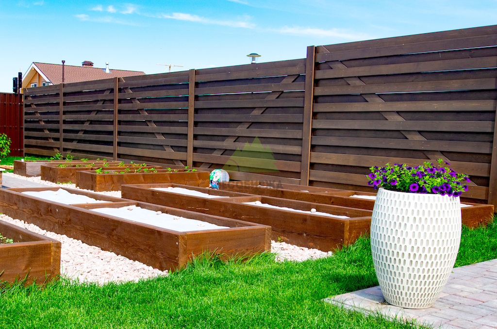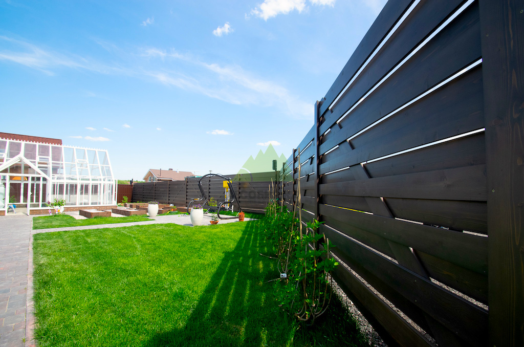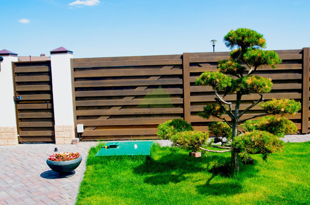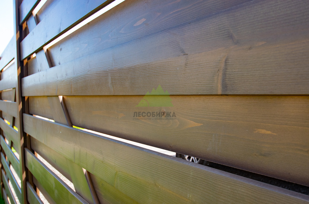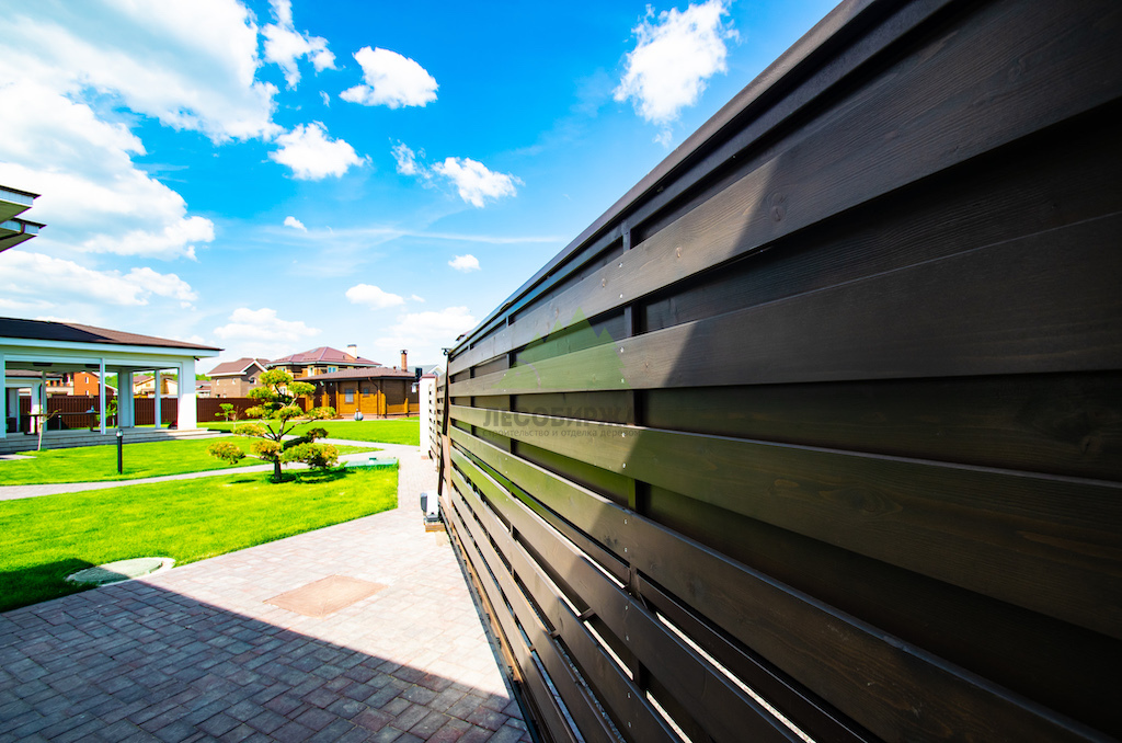 Особое внимание было уделено дизайну монтажа. Клиент выразил желание видеть ограждение, которое будет одновременно закрытым для посторонних глаз, но при этом не создаст ощущения полной изоляции. Наши мастера предложили и реализовали элегантное решение – монтаж планкена в технике "шахматка". Эта горизонтальная укладка досок создает объемный, динамичный рисунок, который выглядит глухим под прямым углом, но при изменении точки обзора обнаруживает небольшие продухи между элементами. Такое решение обеспечивает эффективную защиту от любопытных взглядов соседей, предотвращает попадание пыли и мусора на участок, но в то же время способствует естественной циркуляции воздуха и придает забору легкость и оригинальность. Благодаря такой конструкции, ограждение органично вписалось в ландшафт участка, став не просто функциональным элементом, но и значимой частью его эстетики, гармонично сочетаясь с существующими постройками.